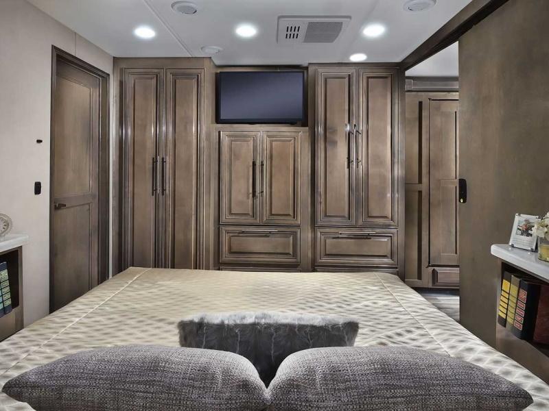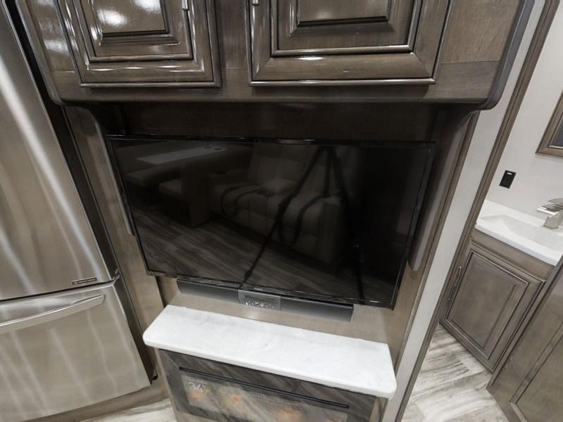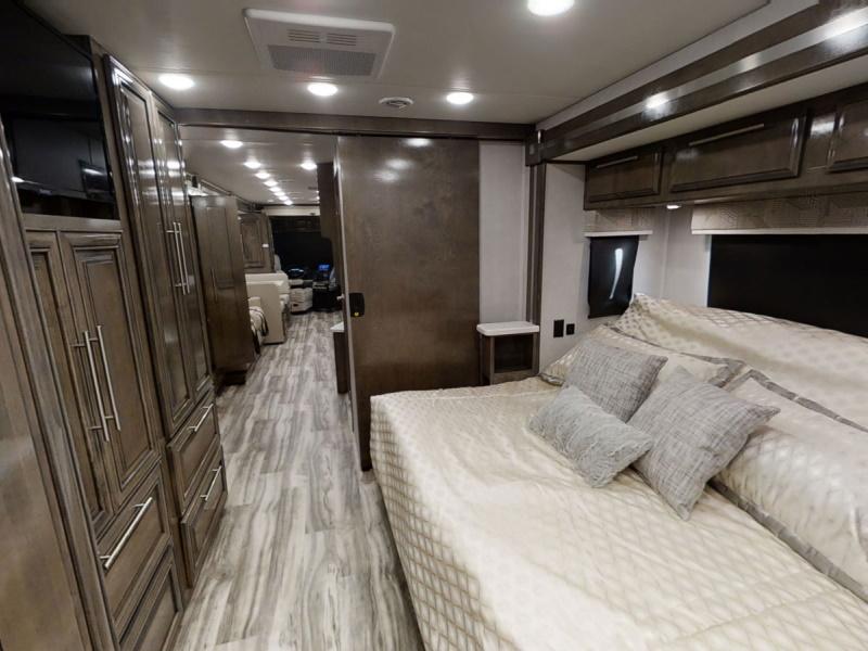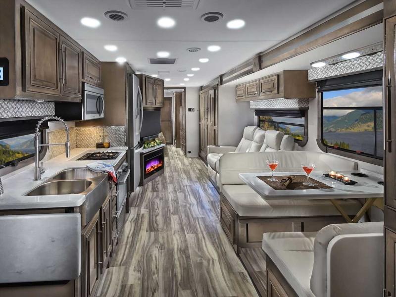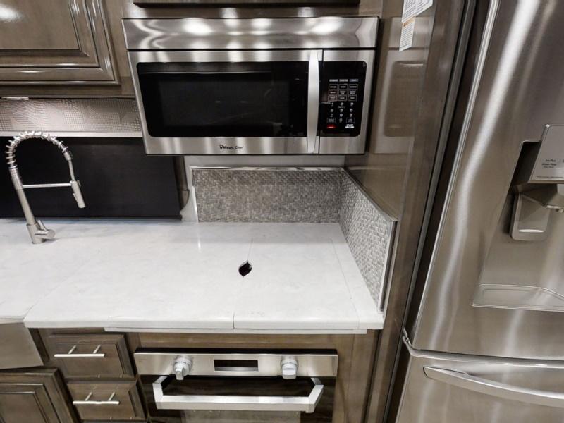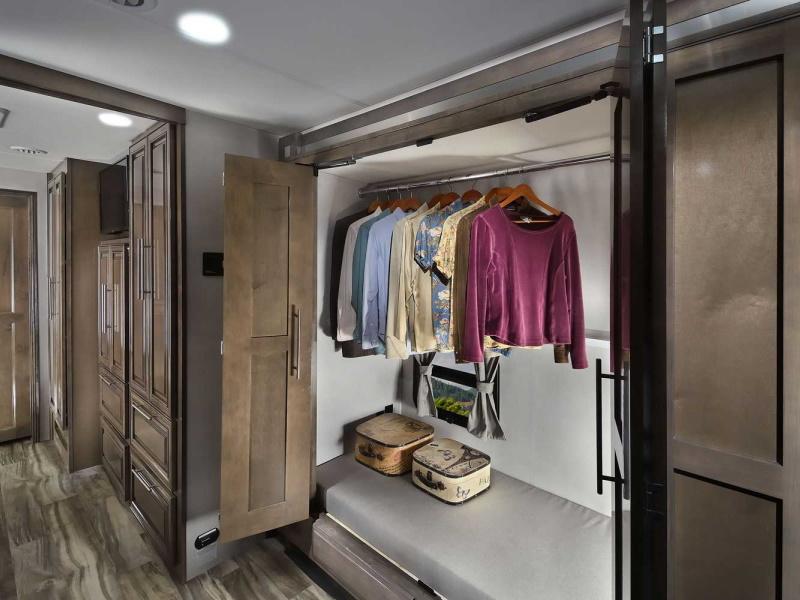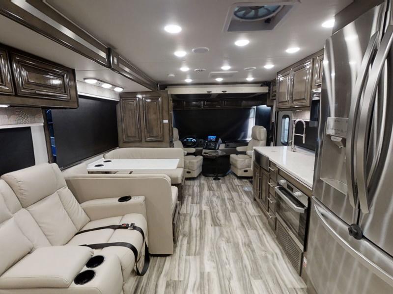 It's a clean decision to take this motorhome on all of your adventures with two full bathrooms! The full rear bathroom has a 42" x 30" shower with a seat and creates a master suite with the bedroom which has a 72" x 80" king bed slide across from a dresser with a 32" LED TV and wardrobes on either side of it with one of them prepped to add an optional washer and dryer. The set of bunk beds are conveniently across from the second full bathroom which will come in handy at night and keep things running smoothly in the mornings with a 41" x 34" shower. Prepare your best home cooked meals with the three burner cooktop and enjoy them at the booth dinette then relax on the theater seating!