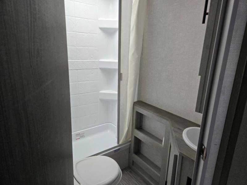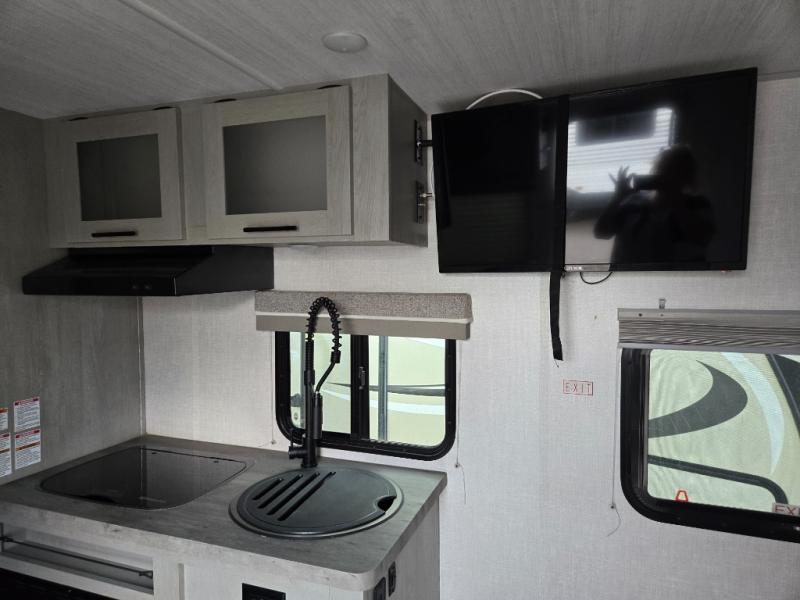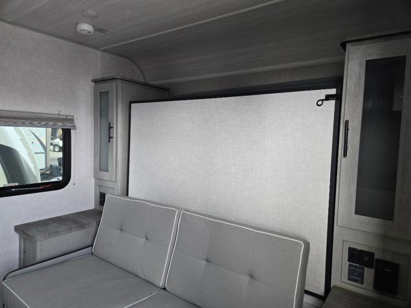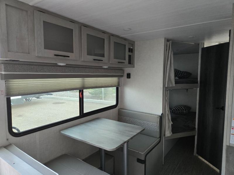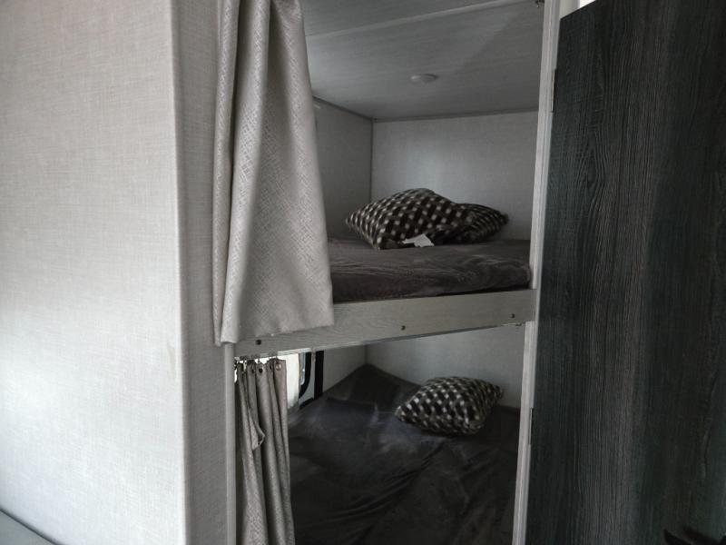 Start camping every chance you get with this easy-to-tow and setup trailer! Once at camp, you can head out to explore to return to a versatile front area that offers a sofa during the daytime and a Murphy bed at night. There is a dinette for two to dine at as well as one to sleep on if needed, plus the galley kitchen provides the cook everything they need to feed one to several. There is a pantry as well. The 44" x 74" bunks will sleep two and maybe four kiddos, and the full bathroom will keep everyone refreshed. There is a pass-through compartment for the larger items like fishing poles and outdoor tables, a 14' awning for some sun protection, and there is a handy exterior door to place items inside under the bunks during travel.