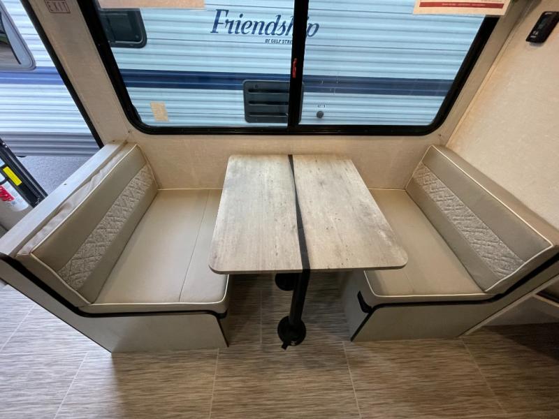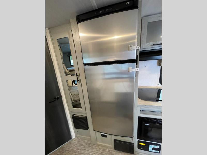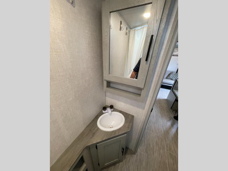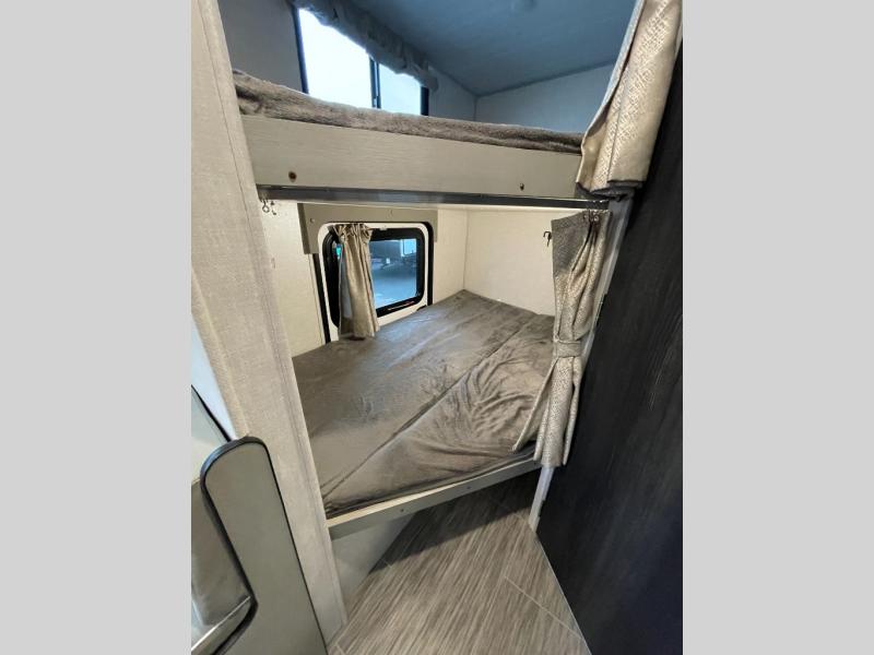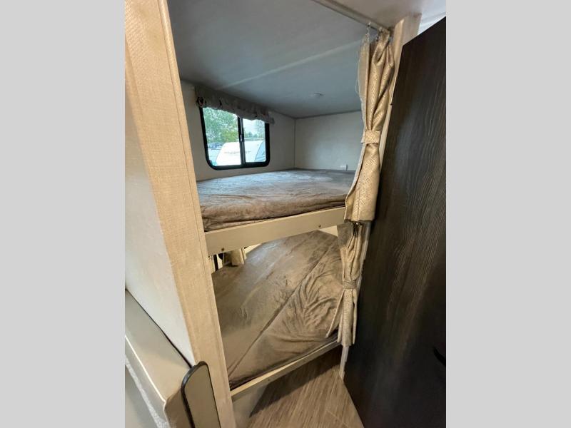 Start camping every chance you get with this easy-to-tow and setup trailer! Once at camp, you can head out to explore to return to a versatile front area that offers a sofa during the daytime and a Murphy bed at night. There is a dinette for two to dine at as well as one to sleep on if needed, plus the galley kitchen provides the cook everything they need to feed one to several. There is a pantry as well. The 44" x 74" bunks will sleep two and maybe four kiddos, and the full bathroom will keep everyone refreshed. There is a pass-through compartment for the larger items like fishing poles and outdoor tables, a 14' awning for some sun protection, and there is a handy exterior door to place items inside under the bunks during travel.
