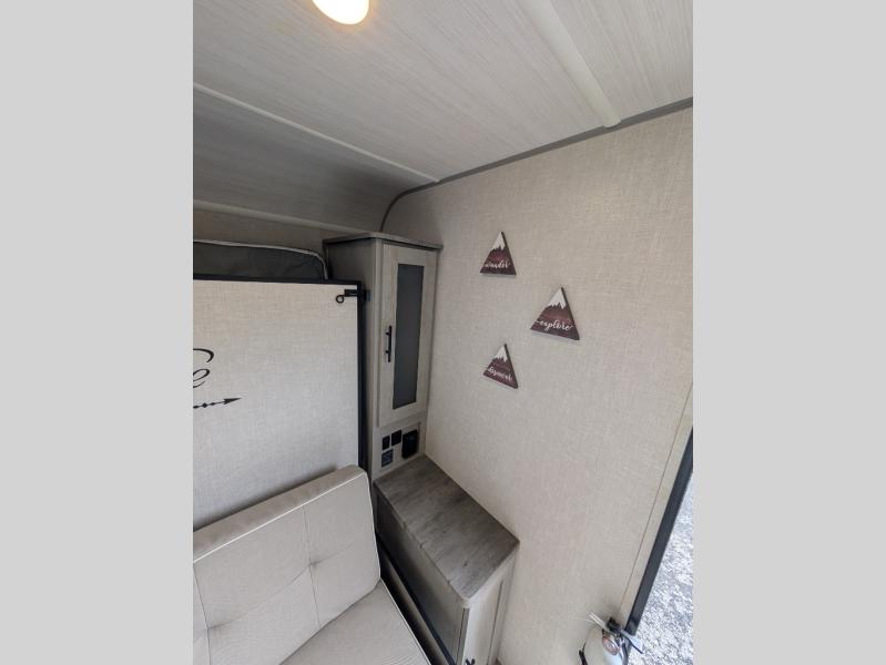 Start camping every chance you get with this easy-to-tow and setup trailer! Once at camp, you can head out to explore to return to a versatile front area that offers a sofa during the daytime and a Murphy bed at night. There is a dinette for two to dine at as well as one to sleep on if needed, plus the galley kitchen provides the cook everything they need to feed one to several. There is a pantry as well. The 44" x 74" bunks will sleep two and maybe four kiddos, and the full bathroom will keep everyone refreshed. There is a pass-through compartment for the larger items like fishing poles and outdoor tables, a 14' awning for some sun protection, and there is a handy exterior door to place items inside under the bunks during travel.