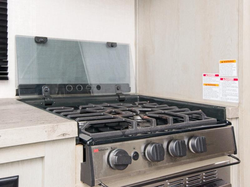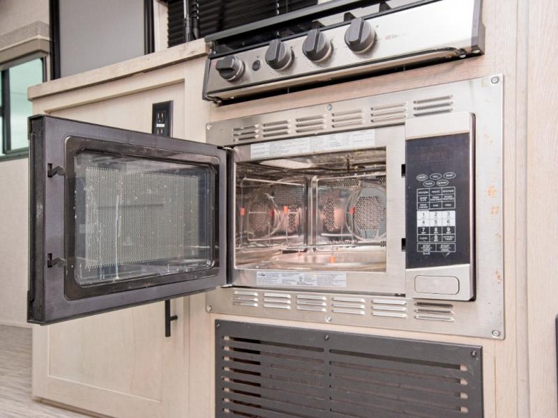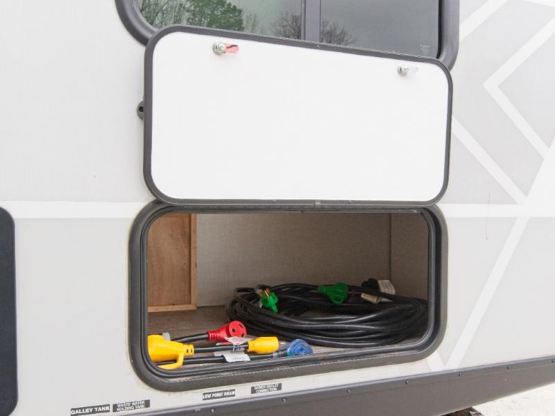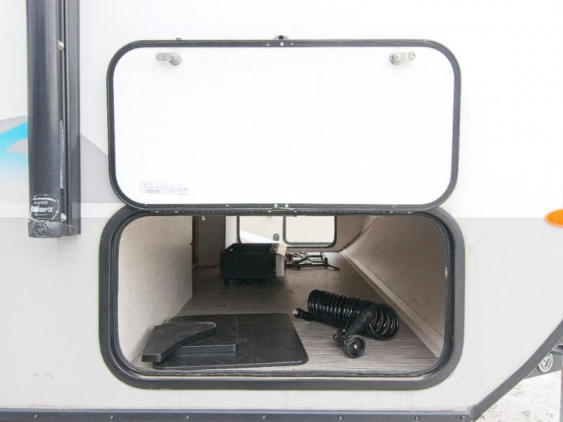The well-equipped kitchen features quality appliances and a pantry, making meal prep easy for everyone. Plus, there's an optional exterior griddle for outdoor cooking, ideal for campfire meals. When you're ready to enjoy the outdoors, the 16' awning provides shade and protection from the elements, and the pass-through compartment offers ample space for storing larger gear.