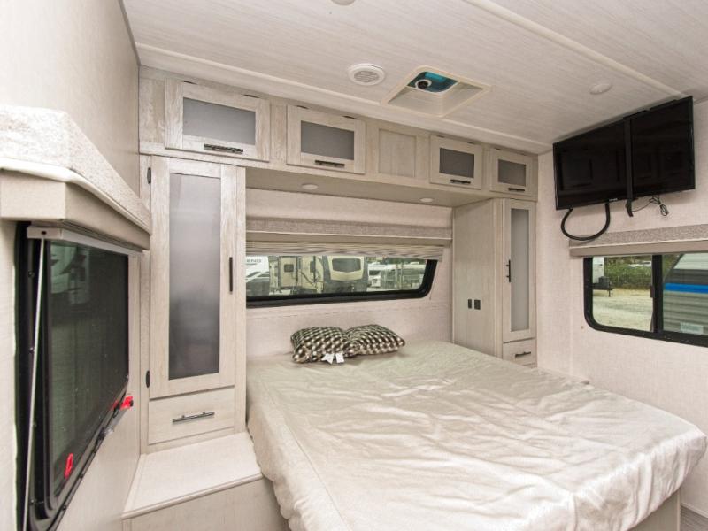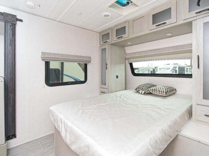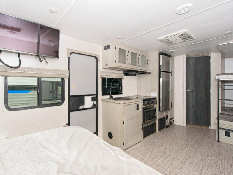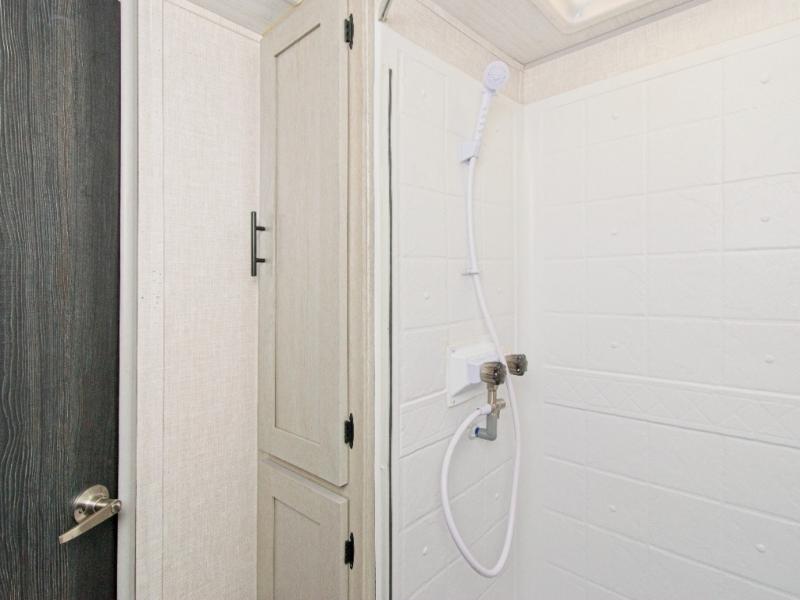 The rear corner features a full bathroom with a shower, making it easy to freshen up while on the road. The bunk beds are ideal for kids or additional guests, while the booth dinette slide adds extra floor space, perfect for family meals or relaxation. The queen bed up front offers a peaceful retreat, complete with under-bed storage and side wardrobes to keep your belongings organized.