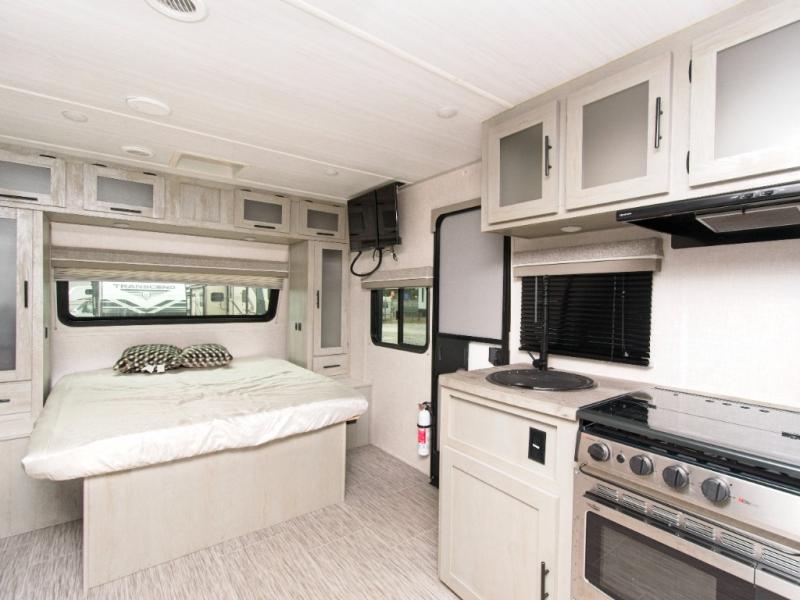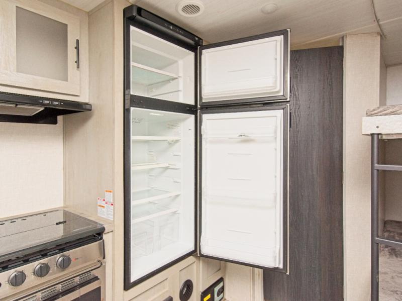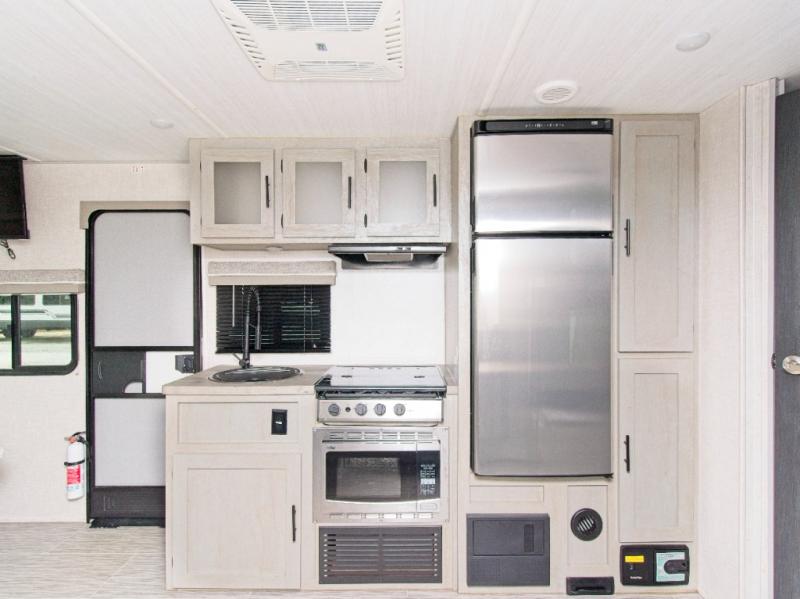Designed for all-season adventures, this travel trailer includes a Cold Weather package with a heated and enclosed underbelly, tank pad heaters, and an enclosed termination system for year-round travel comfort. The Azdel construction and PVC roof ensure durability, while all-terrain tires and increased ground clearance help you access the most remote and beautiful camping spots.