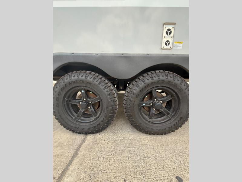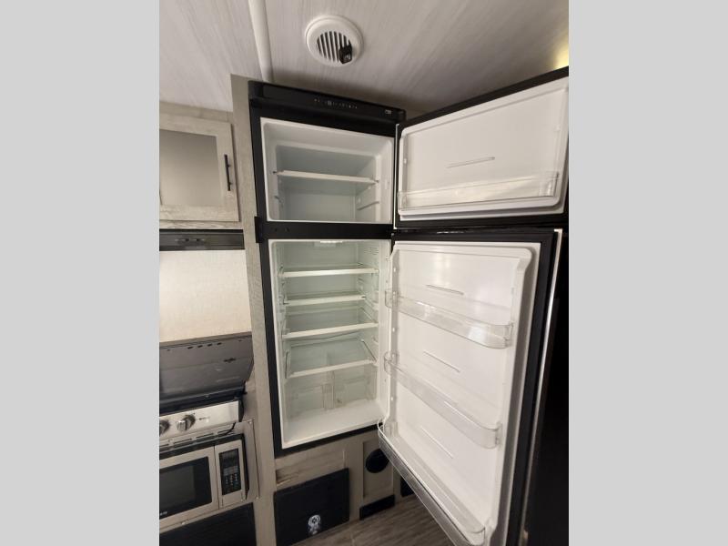 With any IBEX travel trailer or toy hauler by Forest River, the interior offers stainless steel appliances for style, seamless countertops for durability and easy care, a largest-in-class refrigerator for more cold storage, and a central vacuum system to easily clean up after a fun, messy day. The PVC roof, the Azdel construction, and the Cold Weather package with a heated and enclosed underbelly, tank pad heaters and an enclosed termination system provides solid construction plus allows you to travel during any season. And the all terrain tires and increased ground clearance allow you to find the perfect spot to setup camp!