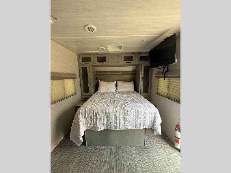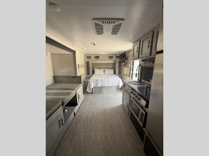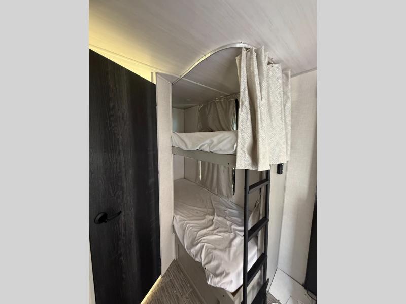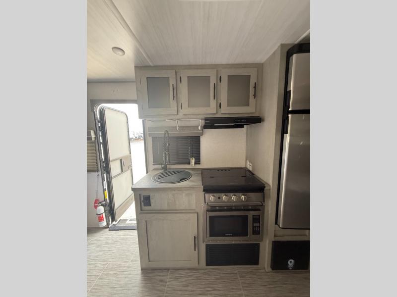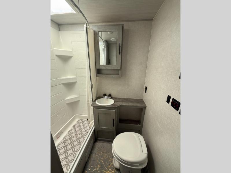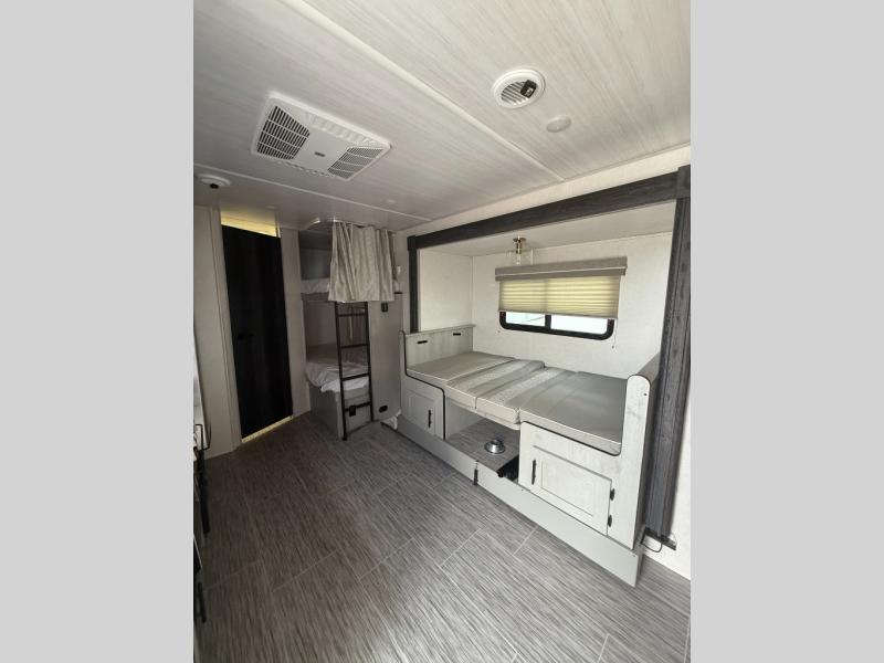 Wanting a full bathroom, sleeping space for overnight guests, plus a slide out for a spacious interior in your next RV? Well stop your search! There is a full bathroom with a shower along the rear corner, bunk beds as well as a dinette that provides extra sleeping space for family and friends, and a slide out offering extra floor space. The cook will appreciate the kitchen appliances and pantry when feeding everyone, and there is an exterior griddle option as well. The front offers a queen bed with super storage underneath plus side wardrobes to keep your clothes tidy. And the exterior provides a pass-through compartment for the larger outdoor gear, and a 16' awning for protection from the sun.