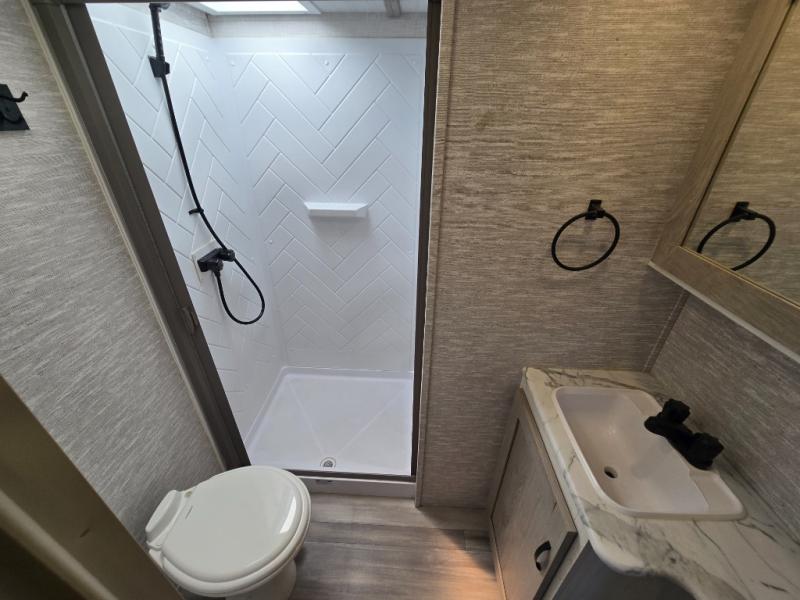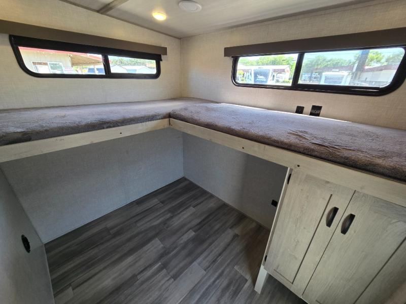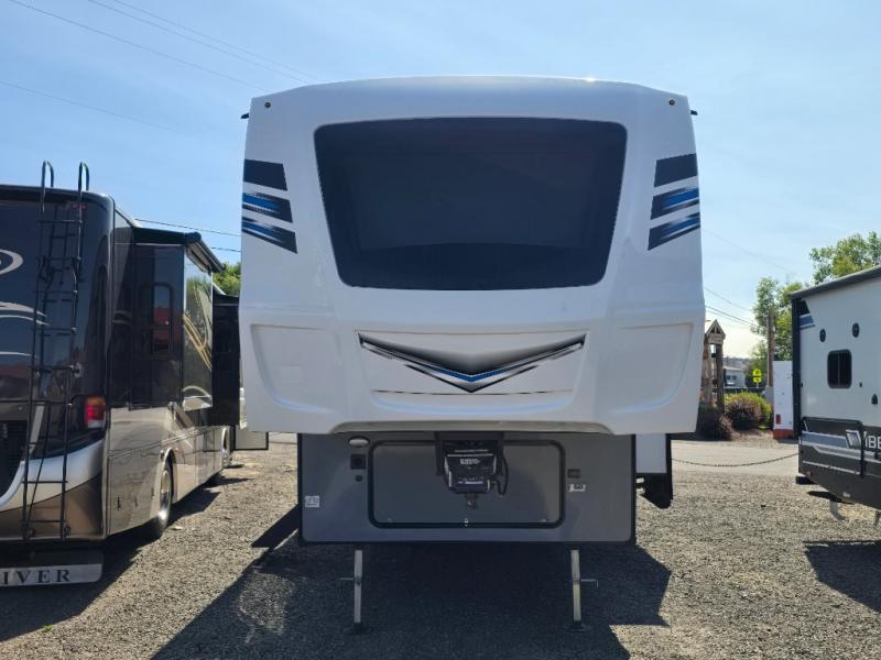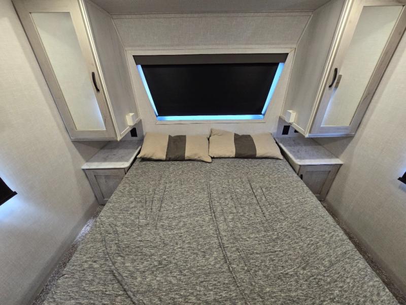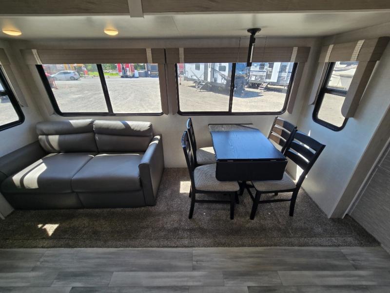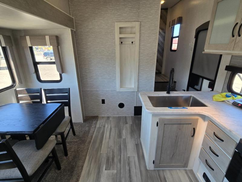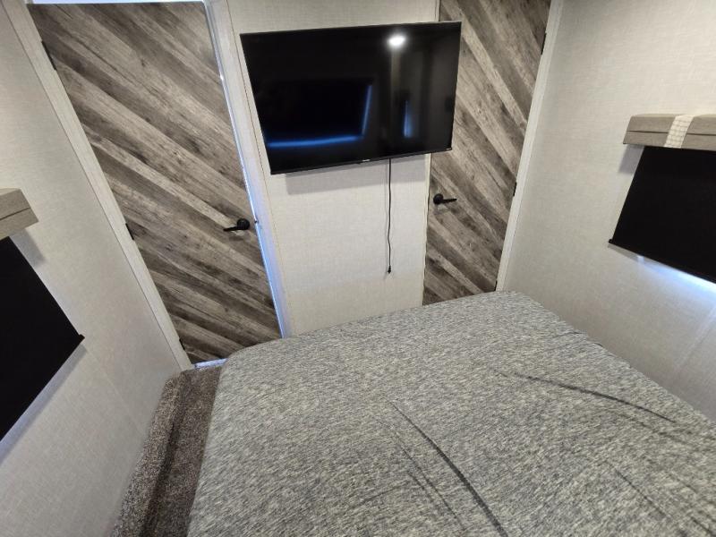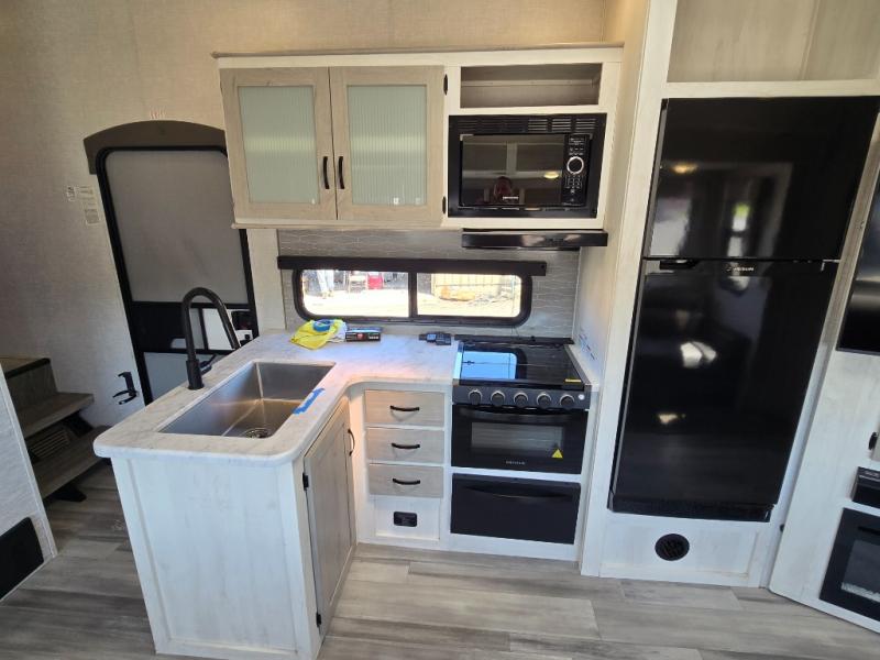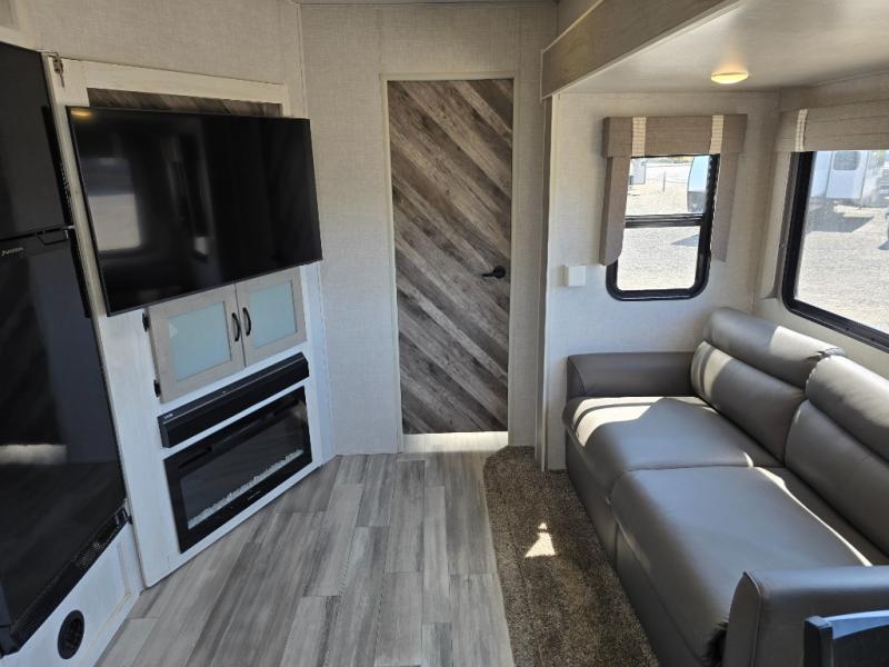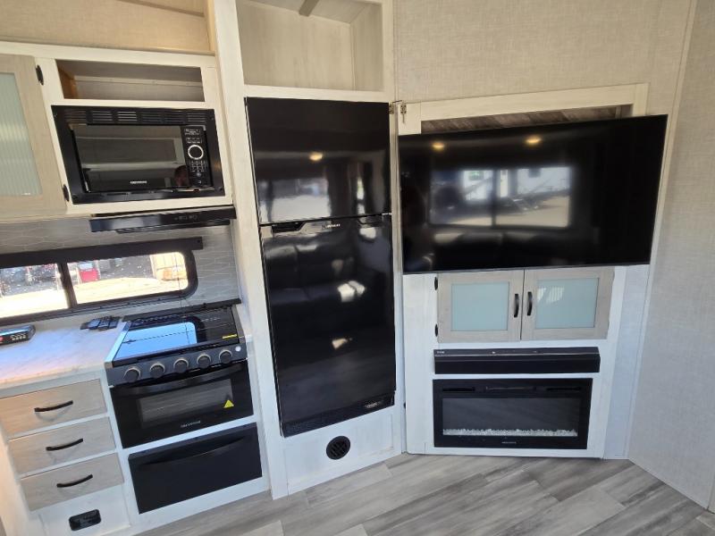 This fifth wheel is going to make an impression on anyone that steps foot inside or walks around the outside! From having a second entry/exit door into the rear bunkhouse and a main entry into the living and kitchen area, plus having an outside kitchen to make meals in the great outdoors, nobody will ever want to go home! The rear bunkhouse also includes a Versa queen bed plus two flip-down upper bunks, plus storage. The front bedroom gives you privacy from everyone and there is a walk-around queen bed, three wardrobes and a space prepped for a washer/dryer option. The full bathroom will keep everyone refreshed, and the inside kitchen has full amenities including an L-shaped counter. There is hidden storage behind the 40" LED TV with fireplace below.