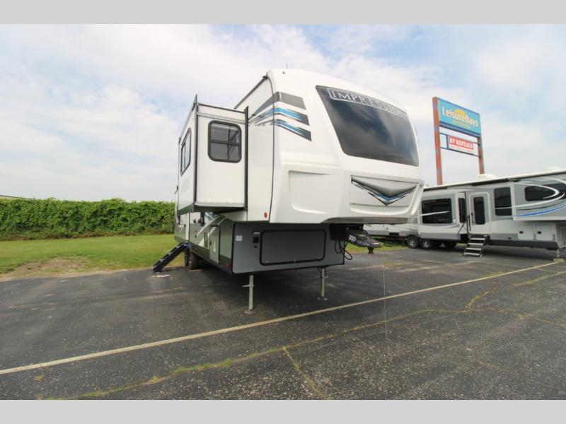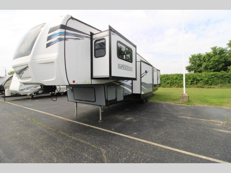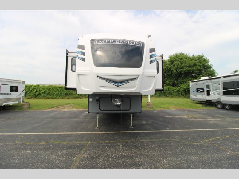 Looking for a separate living area from the kitchen in your next fifth wheel? Would you like to have a private bedroom with a rear window for more natural lighting and beautiful views of your campsite? Stop your search! This Impression includes both of your wishes, plus so much more. The front living area offers dual opposing slides for more floor space, theater seating, and a front wall with a 50" LED TV with soundbar, a fireplace, a front windshield plus storage for games, and such. The separate kitchen is centrally located and offers a slide out with kitchen appliances and a large pantry, and there is an L-shaped kitchen counter for more prep space and the single bowl sink, plus there is a breakfast bar with swivel bar stools to dine at. The full bathroom includes a walk-in shower, and the rear bedroom allows you to sleep like a queen and hang lots of clothes in the four wardrobes. You might even like to add a washer/dryer option in the prepped space to keep the linens clean the whole trip.