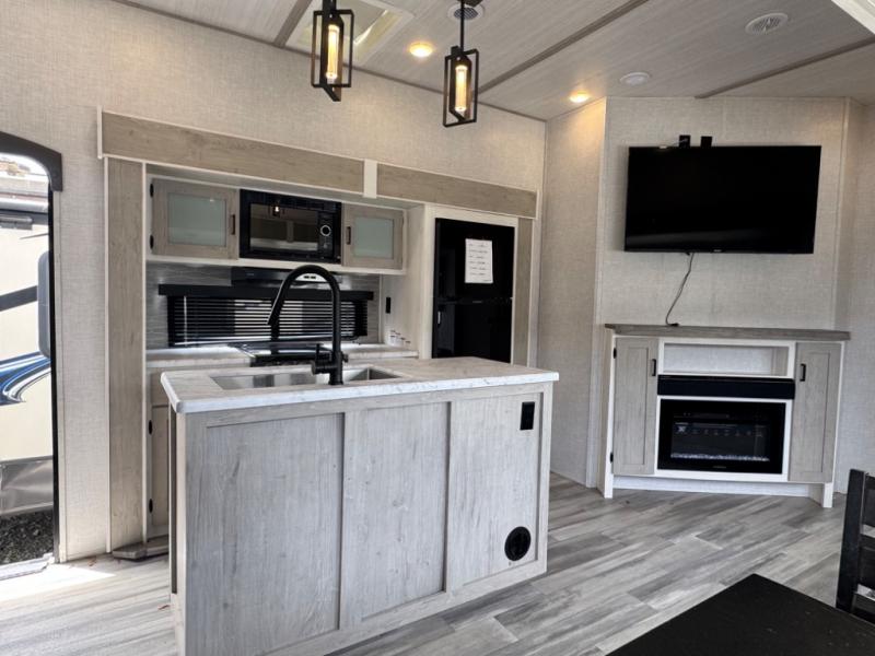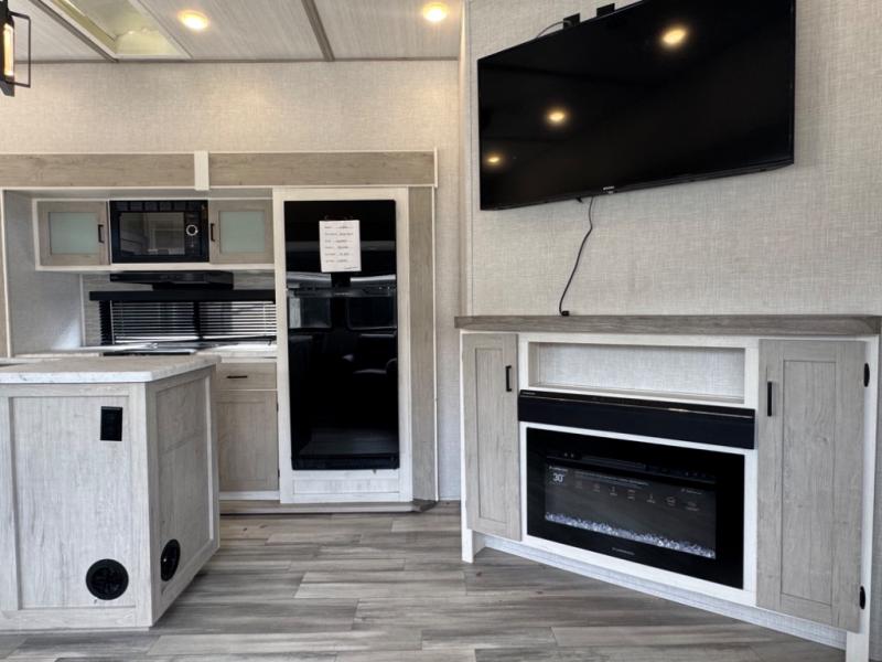 Camp for weeks at a time in this Impression that offers lots of floor space, windows, conveniences and comfort! Your guests can have their own privacy in the rear bedroom that offers a sofa/Versa queen bed with a wardrobe and a half bath with the second entry/exit as well as a loft bed above with a cabinet and a window for great views! You will have your own privacy in the front bedroom with four wardrobes, one is within a slide giving you more floor space and another is prepped for a washer/dryer option. There is a full bathroom with a walk-in shower for all to utilize, a spacious living and kitchen area with dual slides, a kitchen island, a 50" LED TV with a fireplace below, plus appliances and seating. And don't forget about all the features along the exterior like the two adjustable power awnings, the outside kitchen, and the 2" receiver hitch.