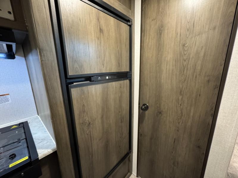 The kitchen in the Independence Trail 172BH is compact but mighty, offering all the essentials you need to prepare meals on the go. The kitchen includes a 2-burner cooktop, microwave, refrigerator, and sink, so you can easily whip up breakfast, lunch, and dinner while camping.
