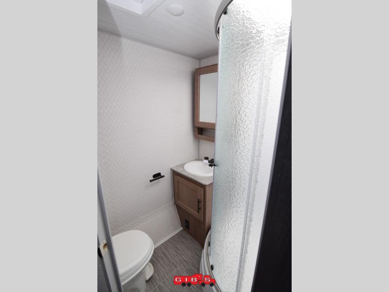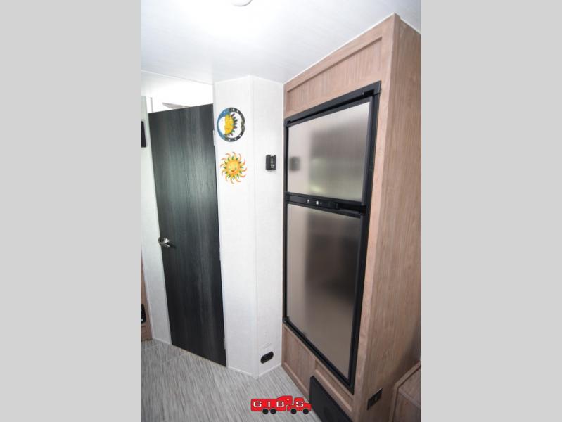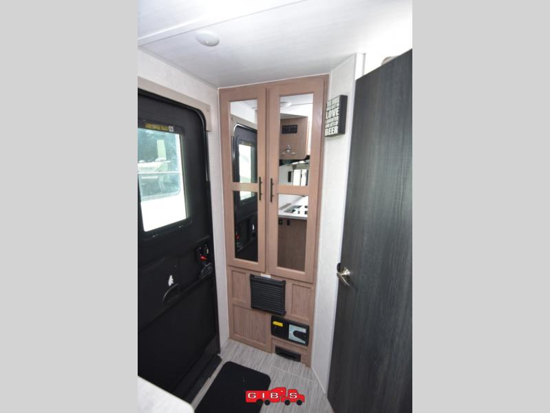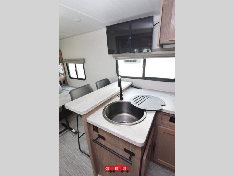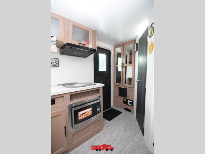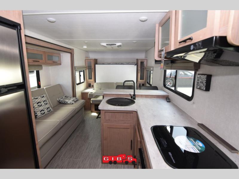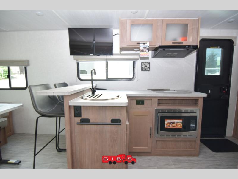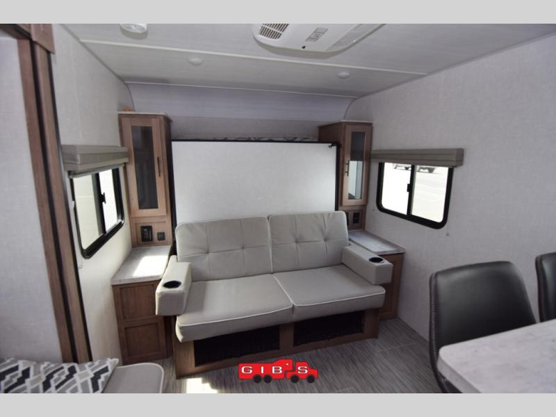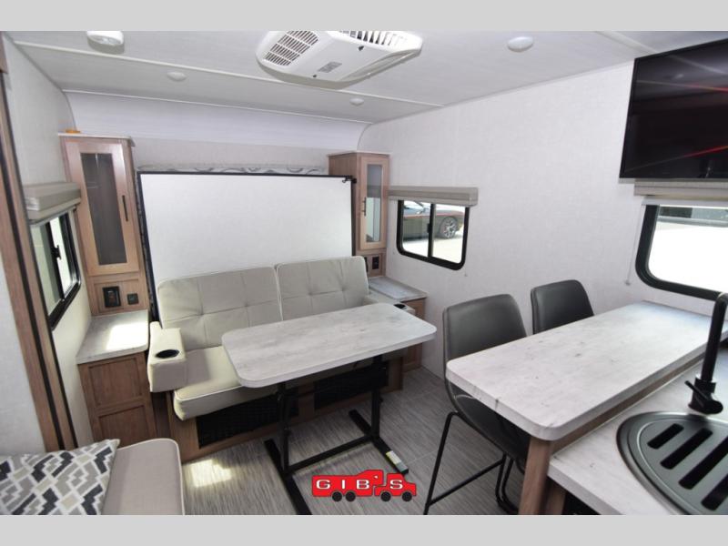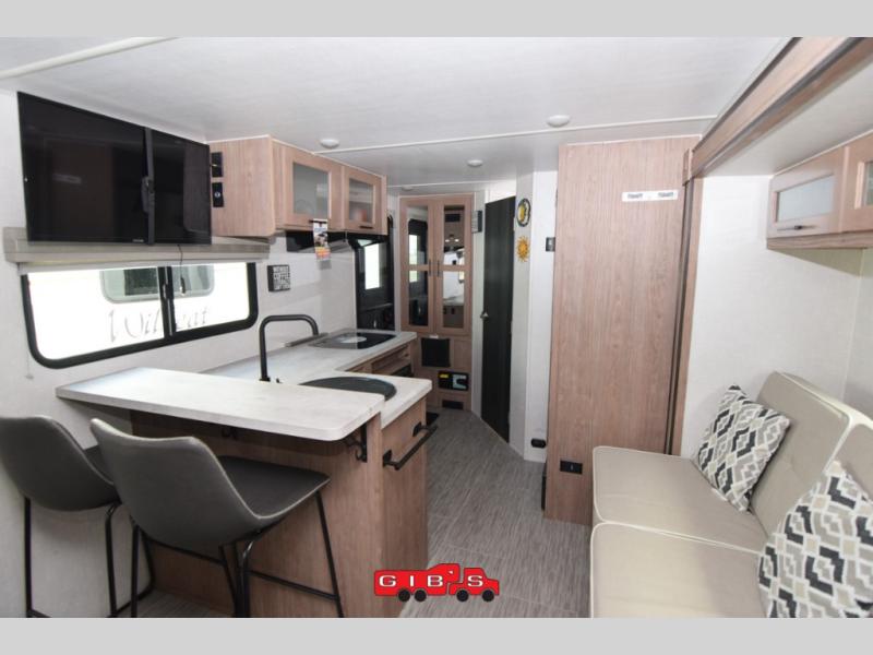 Make your camping dreams come true with this No Boundaries travel trailer! As you enter this unit, you'll notice an entryway closet that you can use to store your coats and scarves, and the full bathroom is also right in front of the entry door for easy access when you need it. The kitchen has great amenities, like a two-burner glass recessed cooktop, a refrigerator, and a sink, and there is a breakfast bar with two stools where you can sit down with a fresh plate of eggs each morning. When you fold away the Murphy bed in the morning, you'll have two sofas to rest on throughout the day, and you can use the JBL FLIP portable Bluetooth speaker to listen to some music while you enjoy the day.