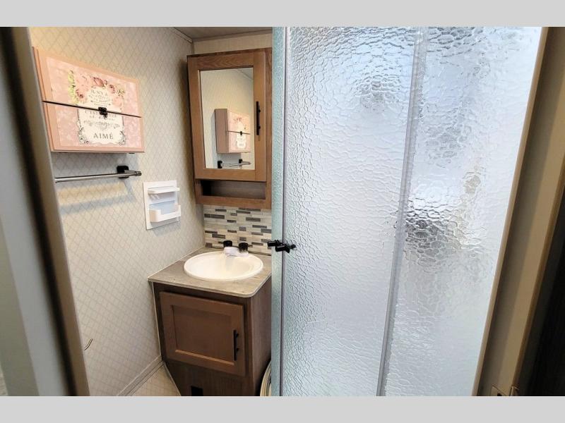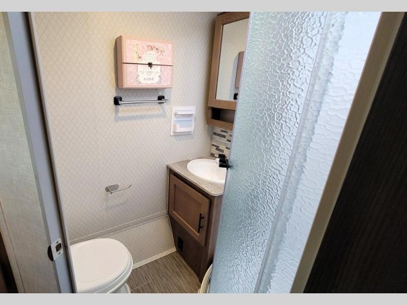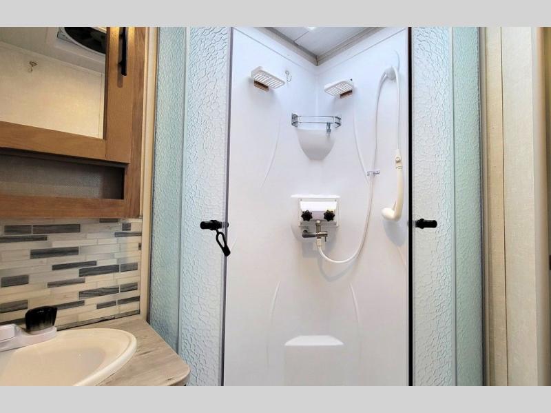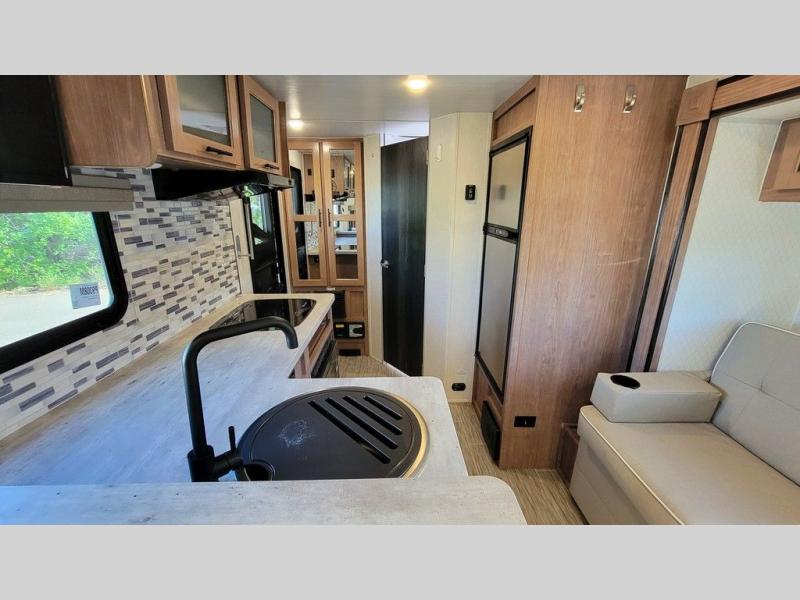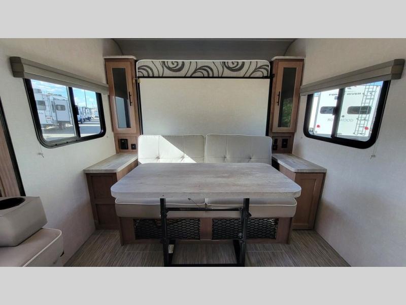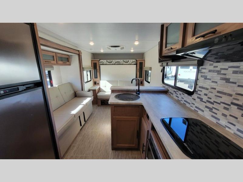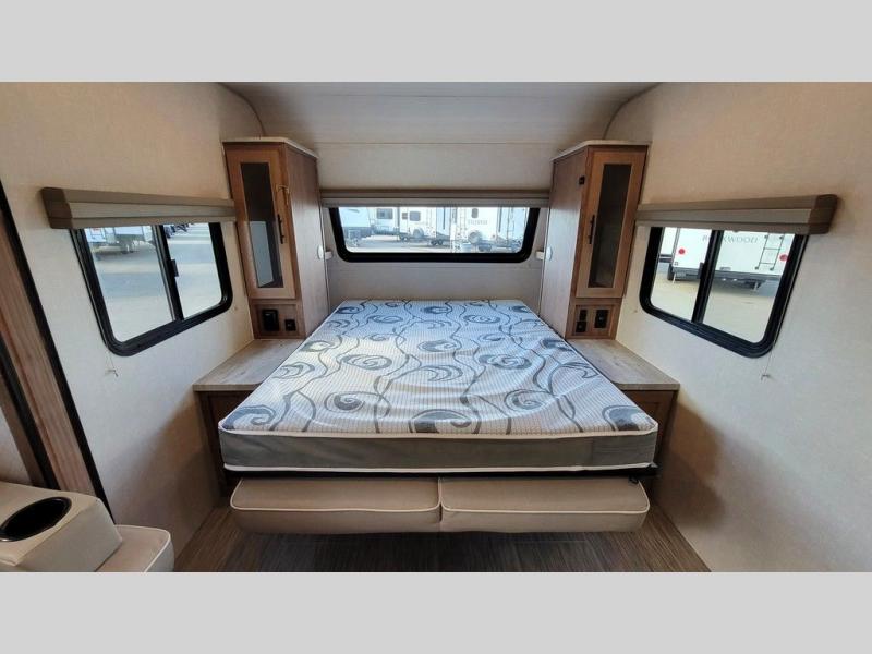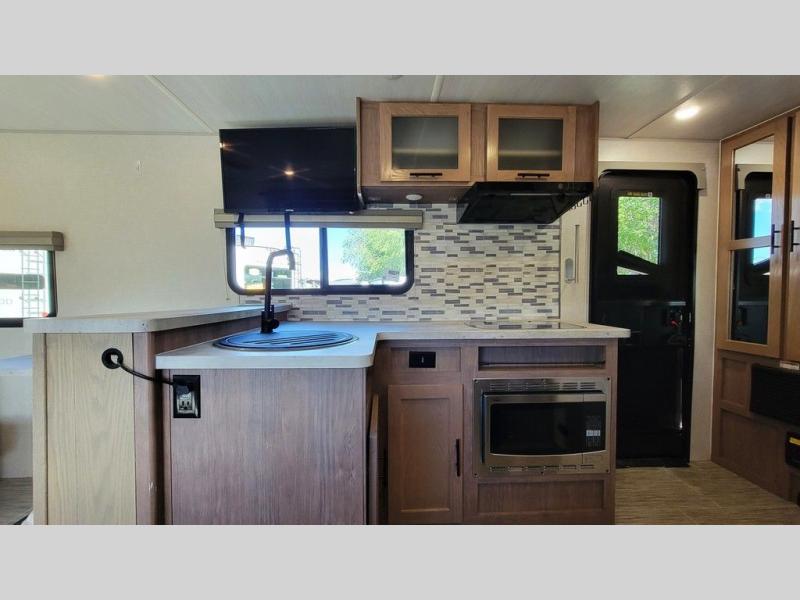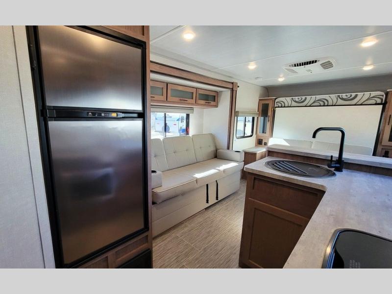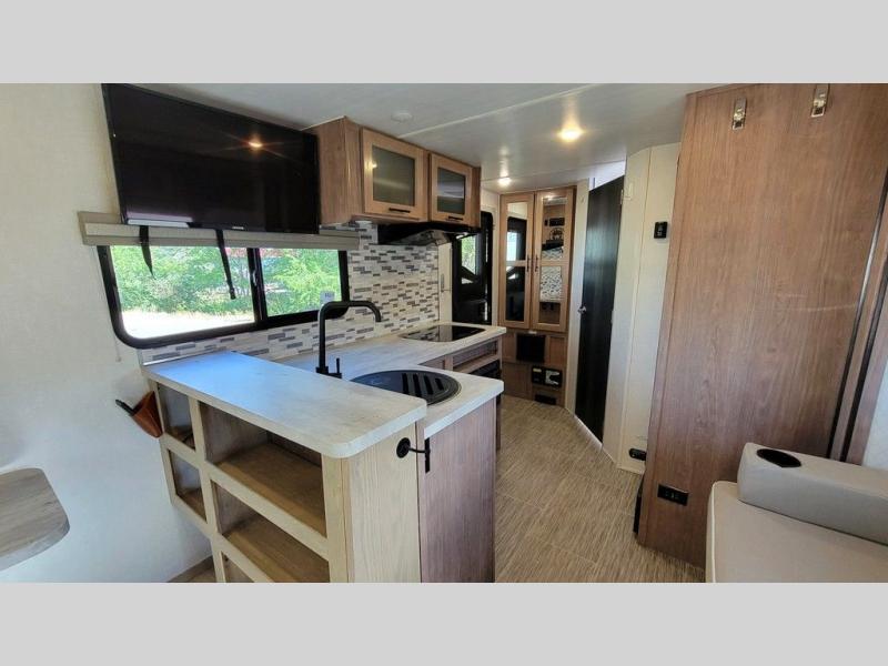 Make your camping dreams come true with this No Boundaries travel trailer! As you enter this unit, you'll notice an entryway closet that you can use to store your coats and scarves, and the full bathroom is also right in front of the entry door for easy access when you need it. The kitchen has great amenities, like a two-burner glass recessed cooktop, a refrigerator, and a sink, and there is a breakfast bar with two stools where you can sit down with a fresh plate of eggs each morning. When you fold away the Murphy bed in the morning, you'll have two sofas to rest on throughout the day, and you can use the JBL FLIP portable Bluetooth speaker to listen to some music while you enjoy the day.