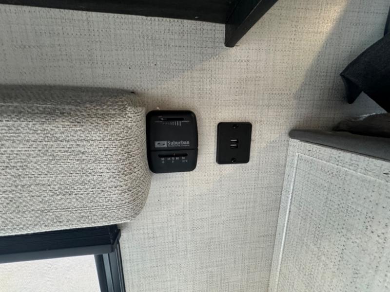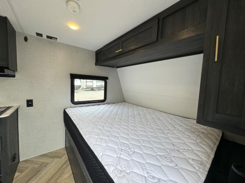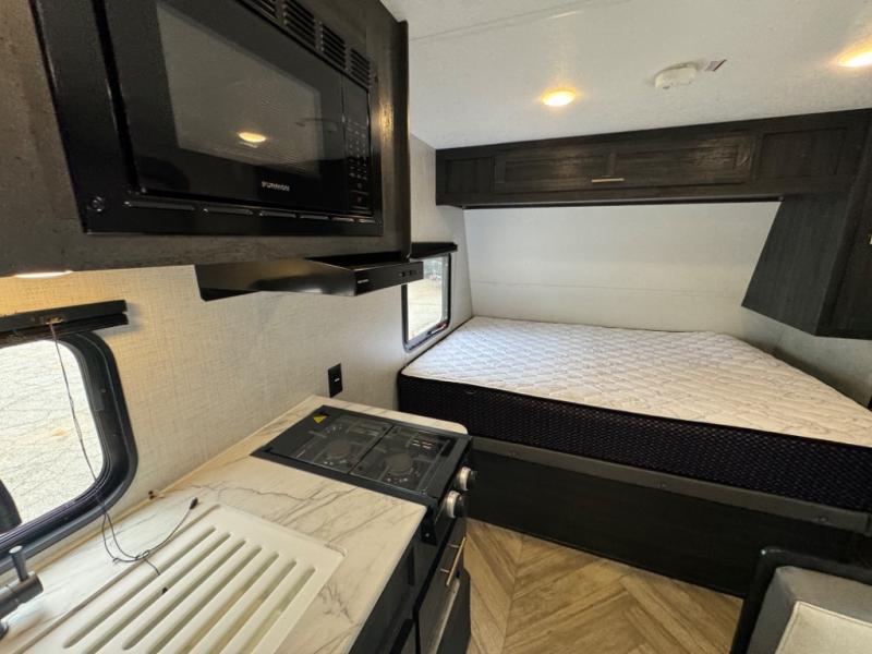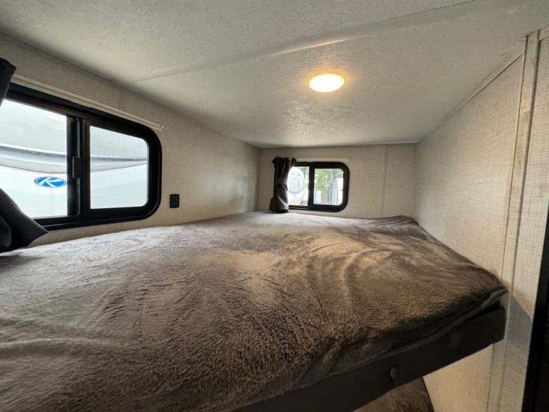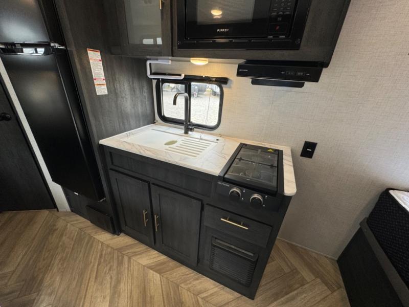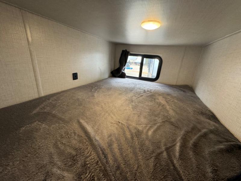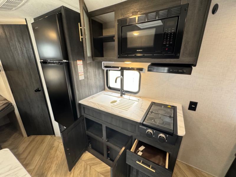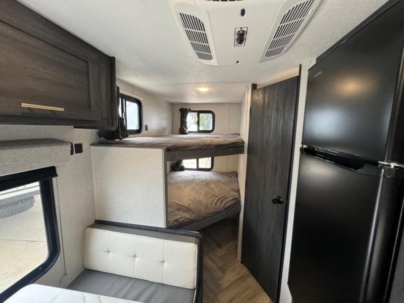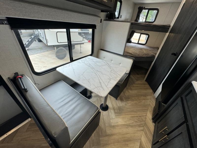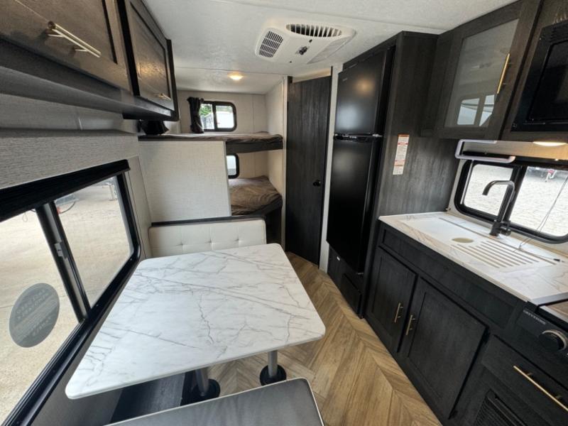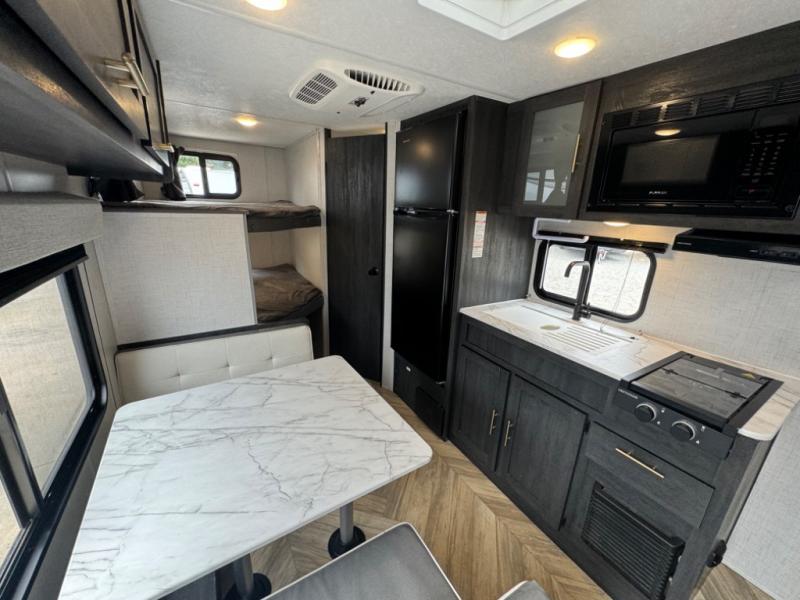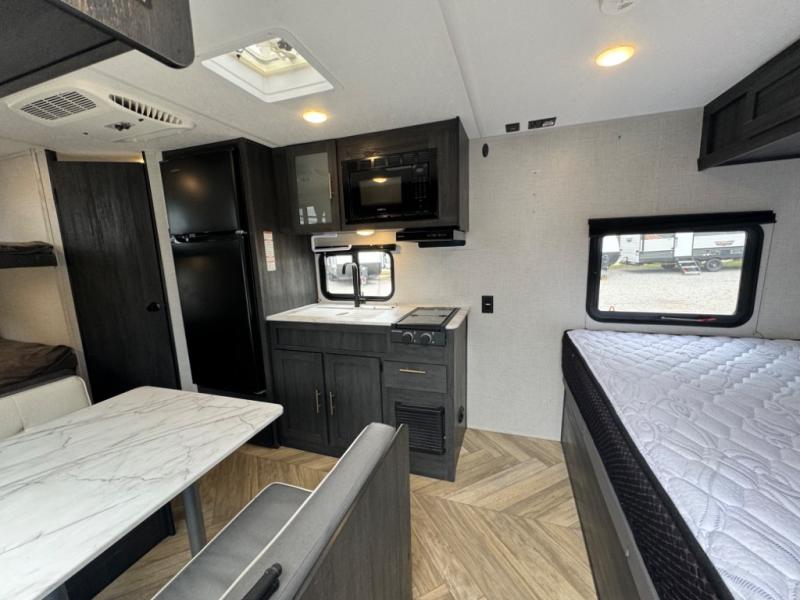 If you crave adventure, this Ozark travel trailer is ready to help you get your next fix! From the RV queen bed at the front to the double-size bunks in the back, you'll have comfortable sleeping accommodations for you and your fellow adventure junkies. You can also find space for one more tired camper on the bench dinette. The full bathroom comes equipped with a shower, foot-flush toilet, and sink to help you clean up after you spent all day playing in the dirt. The kitchen will also be a big help after you've exerted all of your energy because it will provide you with a hearty meal when you use the two-burner cooktop to create something delicious. The 11-cubic foot refrigerator is useful for keeping drinks cold, and the microwave will let you heat up something fast.
