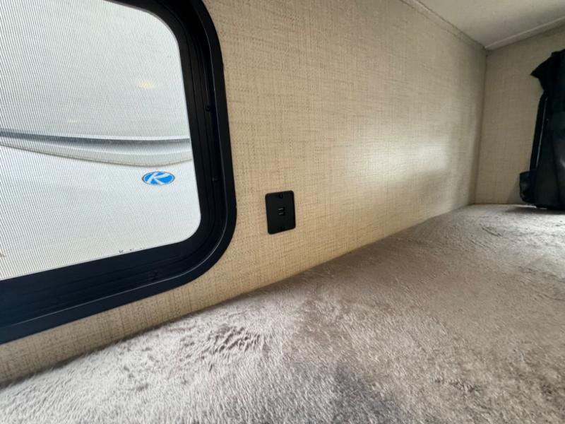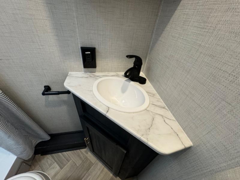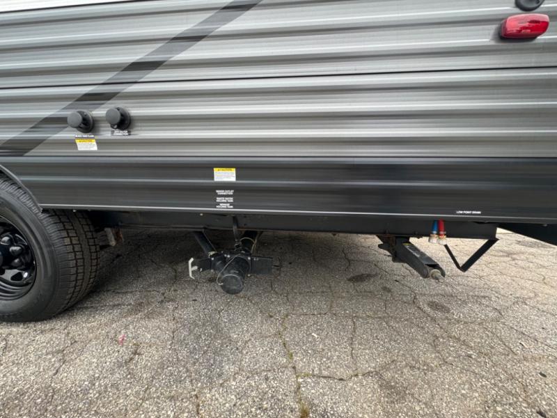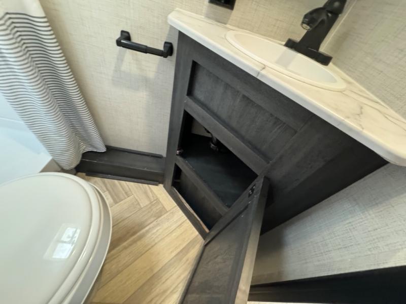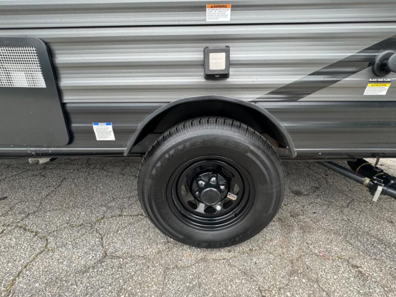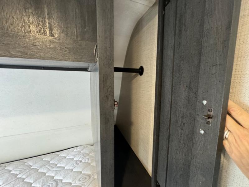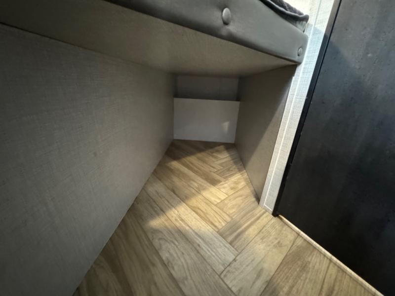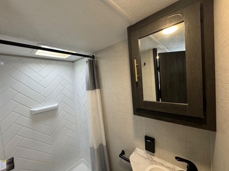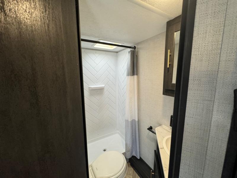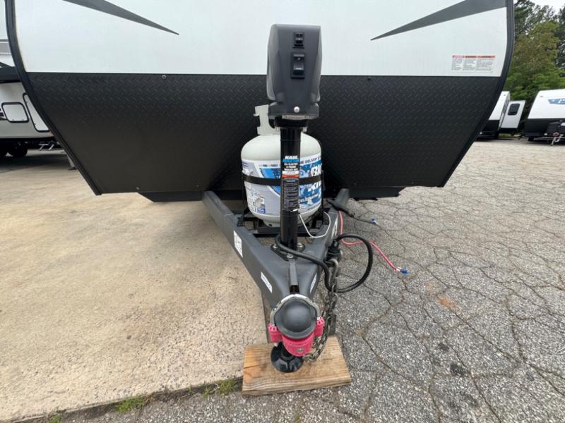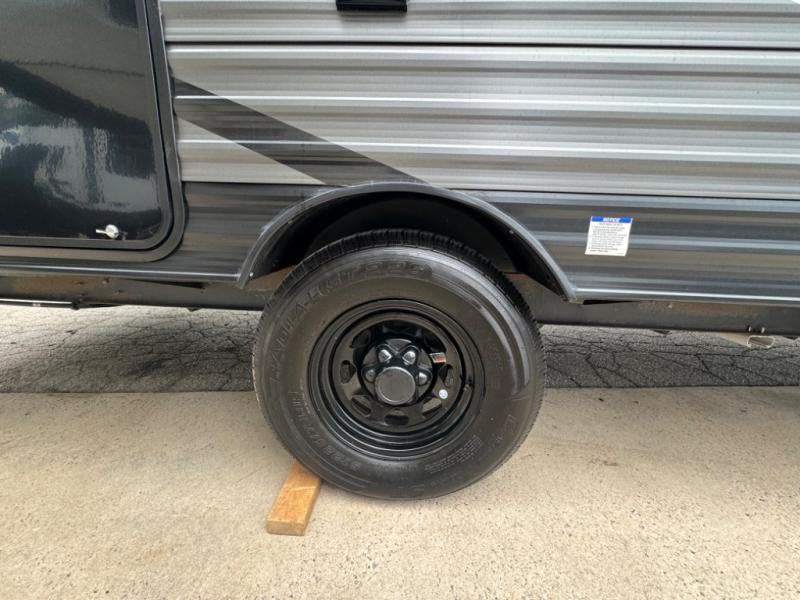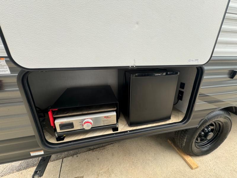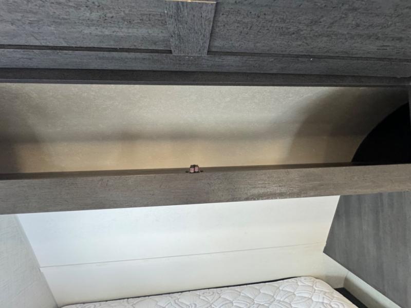 If you crave adventure, this Ozark travel trailer is ready to help you get your next fix! From the RV queen bed at the front to the double-size bunks in the back, you'll have comfortable sleeping accommodations for you and your fellow adventure junkies. You can also find space for one more tired camper on the bench dinette. The full bathroom comes equipped with a shower, foot-flush toilet, and sink to help you clean up after you spent all day playing in the dirt. The kitchen will also be a big help after you've exerted all of your energy because it will provide you with a hearty meal when you use the two-burner cooktop to create something delicious. The 11-cubic foot refrigerator is useful for keeping drinks cold, and the microwave will let you heat up something fast.