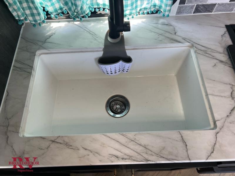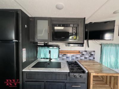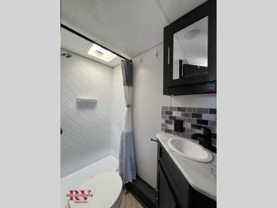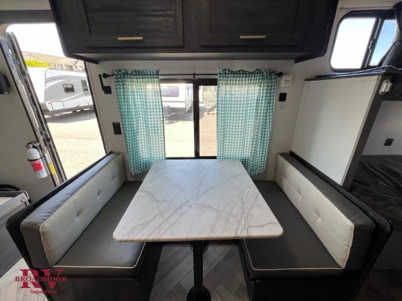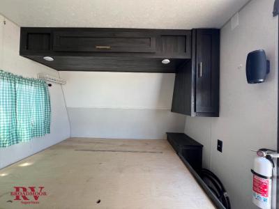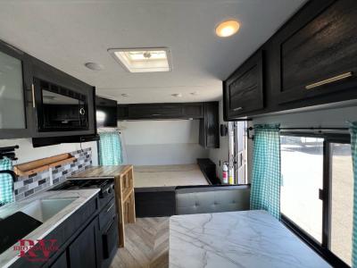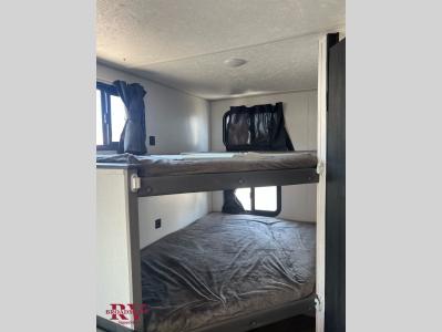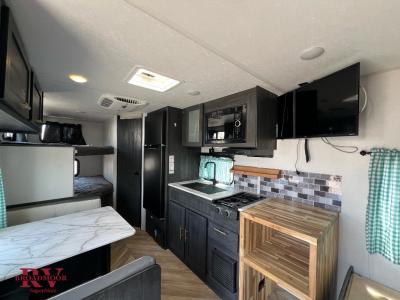 If you crave adventure, this Ozark travel trailer is ready to help you get your next fix! From the RV queen bed at the front to the double-size bunks in the back, you'll have comfortable sleeping accommodations for you and your fellow adventure junkies. You can also find space for one more tired camper on the bench dinette. The full bathroom comes equipped with a shower, foot-flush toilet, and sink to help you clean up after you spent all day playing in the dirt. The kitchen will also be a big help after you've exerted all of your energy because it will provide you with a hearty meal when you use the two-burner cooktop to create something delicious. The 11-cubic foot refrigerator is useful for keeping drinks cold, and the microwave will let you heat up something fast.