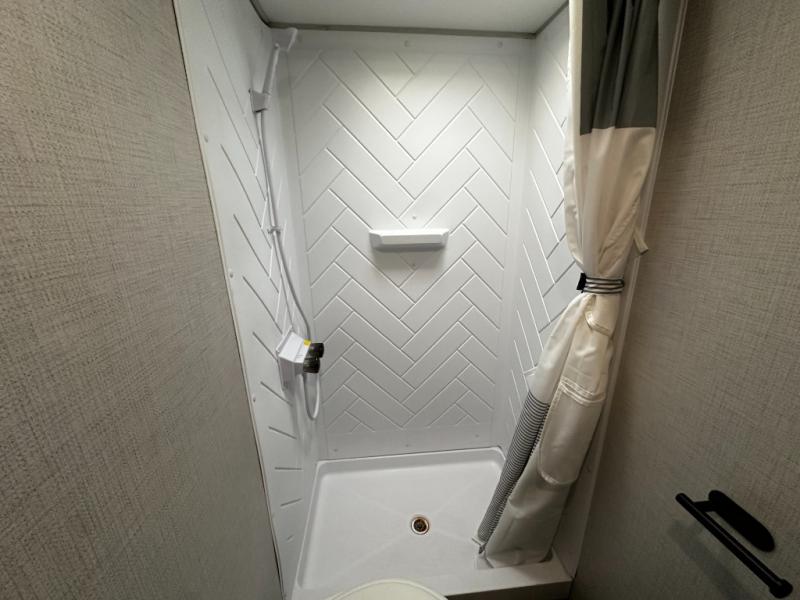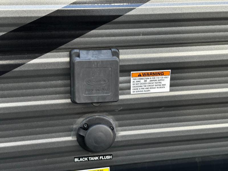 Bathroom & utilities for comfort: You get a full bath with shower, toilet, water system (fresh, gray, black tanks), plus heating (20,000 BTU furnace) and air conditioning — making extended trips or weekend getaways comfortable in various climates.