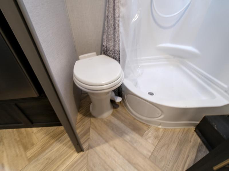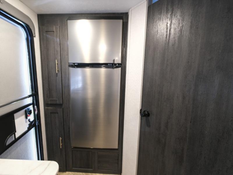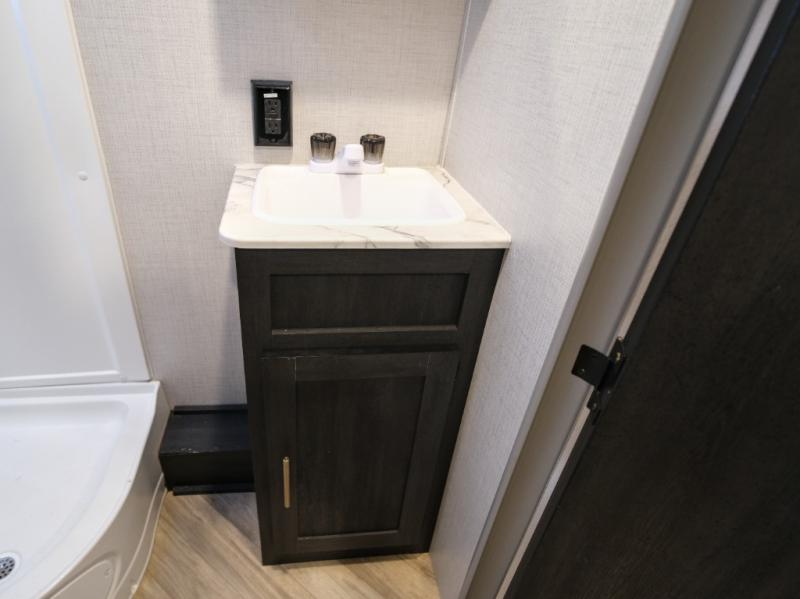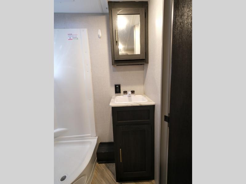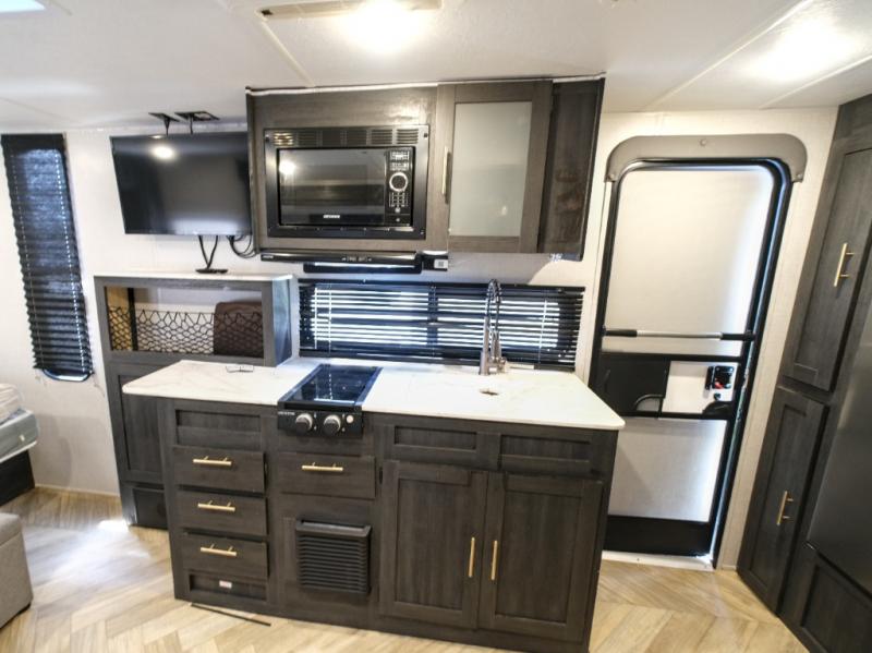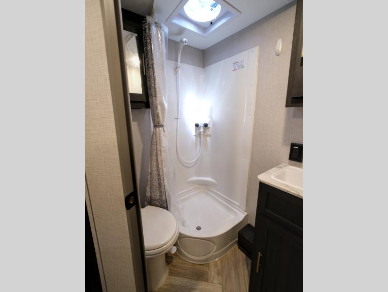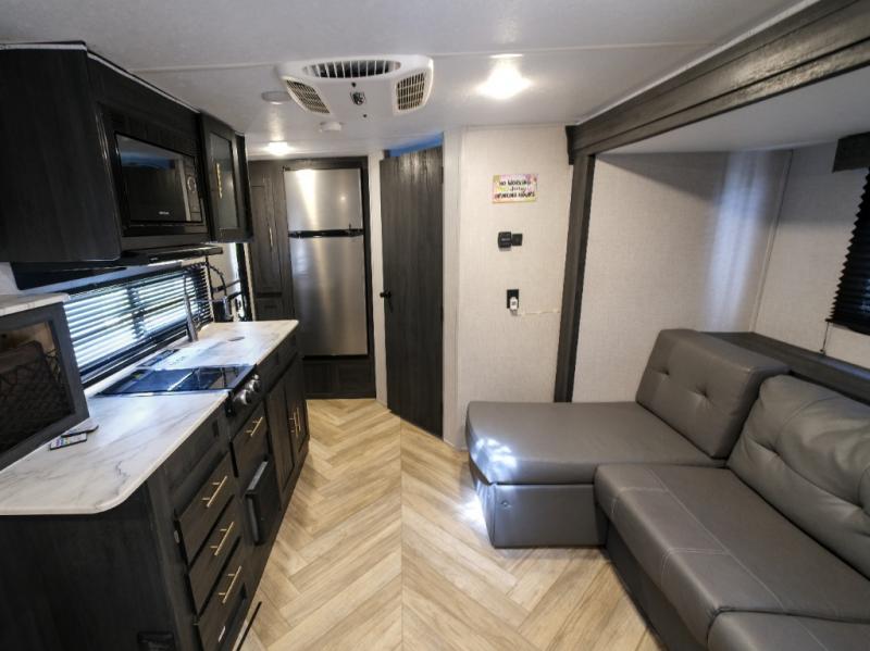 Start camping in this well-equipped travel trailer! The compact kitchen has everything you need to prepare your best home cooked meals and you can enjoy them at the convertible chaise lounge with storage and a removable table. Freshen up each morning in the rear corner bathroom with the neo-angled shower and rest each night on the front 60" x 74" bed with access to the storage area below it, plus there are USB charger/110V outlets on either side of it to charge your electronics. Rinse the mud off your feet with the exterior hot/cold shower before tracking it all throughout the inside. Don't leave any of your outdoor gear behind, simply store it in the exterior full pass-through storage area!