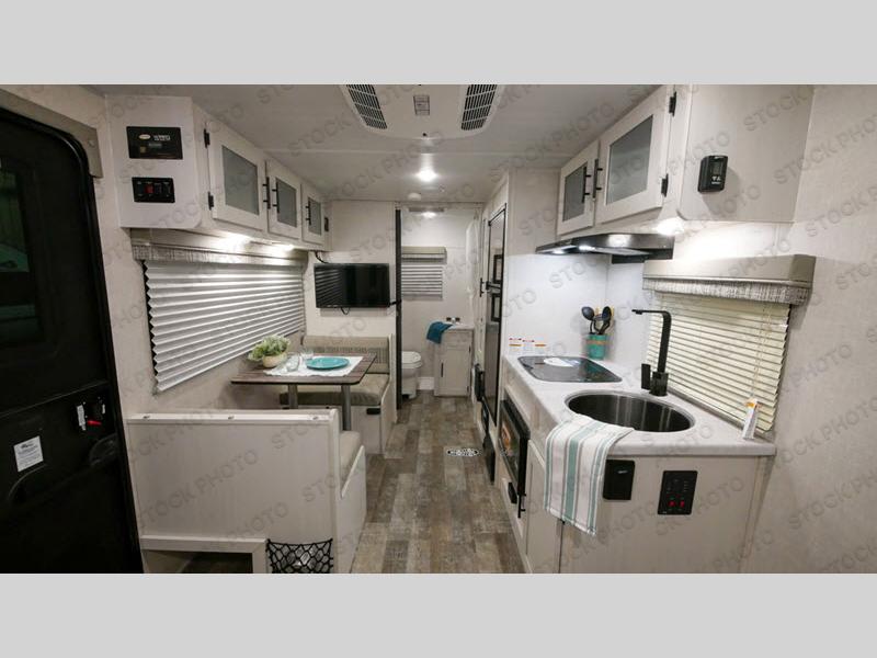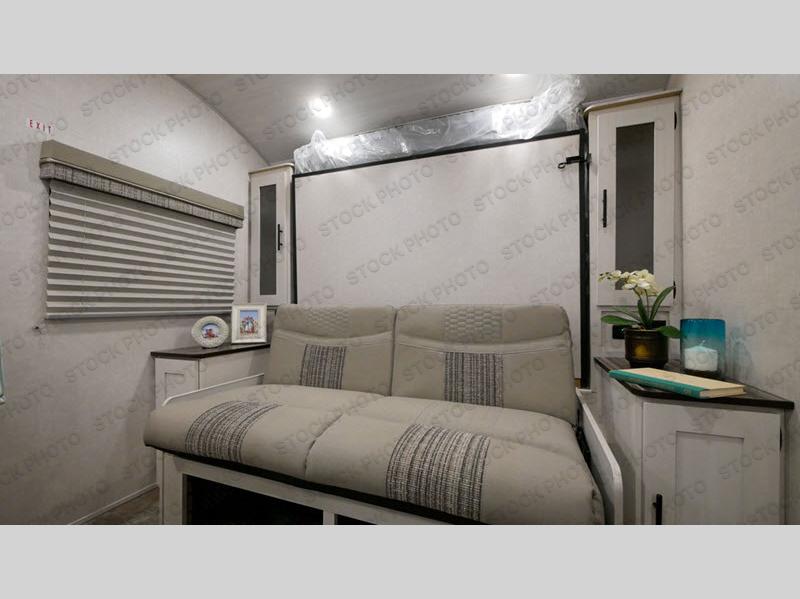 You're going to love all of the conveniences and versatility of this R-Pod travel trailer! The front Murphy bed can fold away to reveal a sofa which gives you a comfortable place to sit during the day and to sleep at night too. The rear full bath features everything you will need to get squeaky clean each morning, as well as a large wardrobe for you to store your linens. After you have whipped up your best meal with the two-burner cooktop or convection microwave, you can head to the 30" x 75" booth dinette and enjoy eating it there comfortably. There is plenty of storage space inside, but if you need more space, then you can use the exterior pass-through storage!