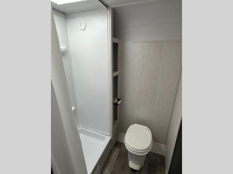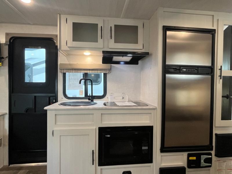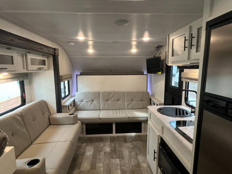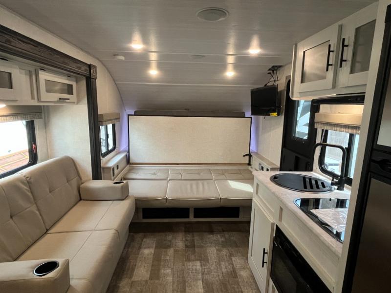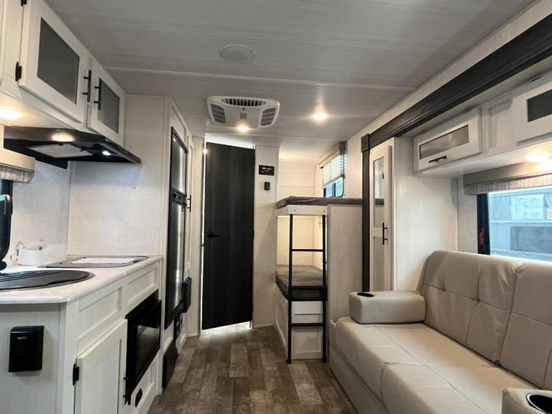 The whole family will enjoy this trailer with sleeping space for five between the bunk beds, the queen Murphy bed and the second sofa within the slide out. This sofa also includes a table for dining, and there is a closet to hang your clothes. During the day you will be able to relax inside while visiting with the cook in the kitchen with full amenities including a pantry for dry good storage. And the bathroom includes a toilet, linen storage, and a shower with a sink, so load up and head out to easily set up and enjoy your own accommodations in the great outdoors.