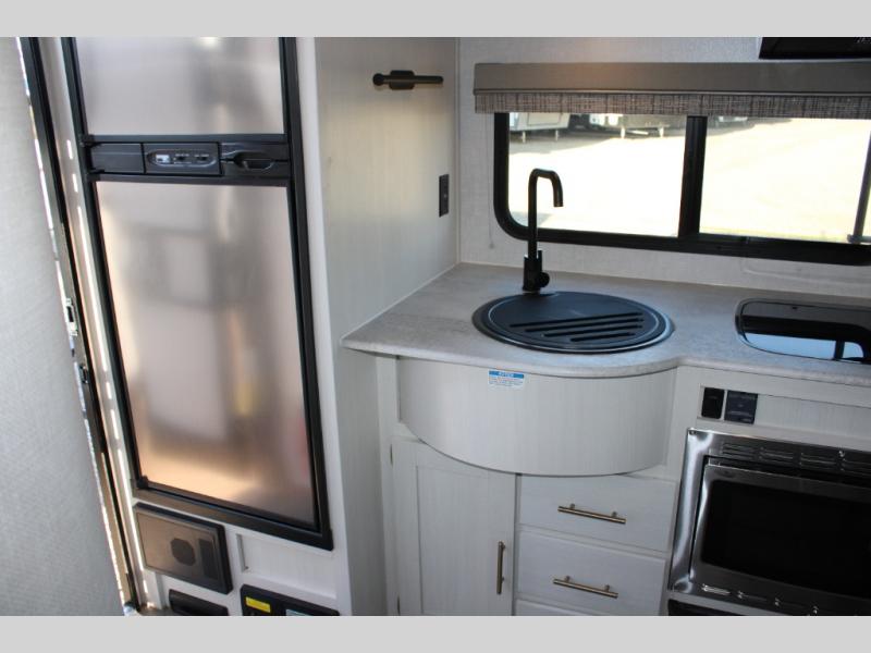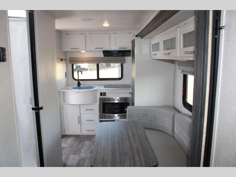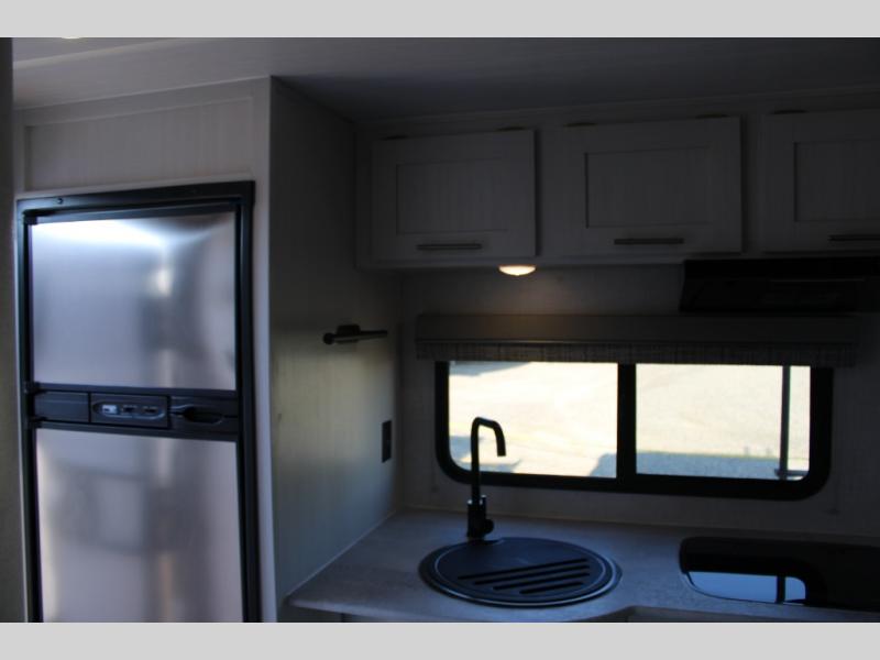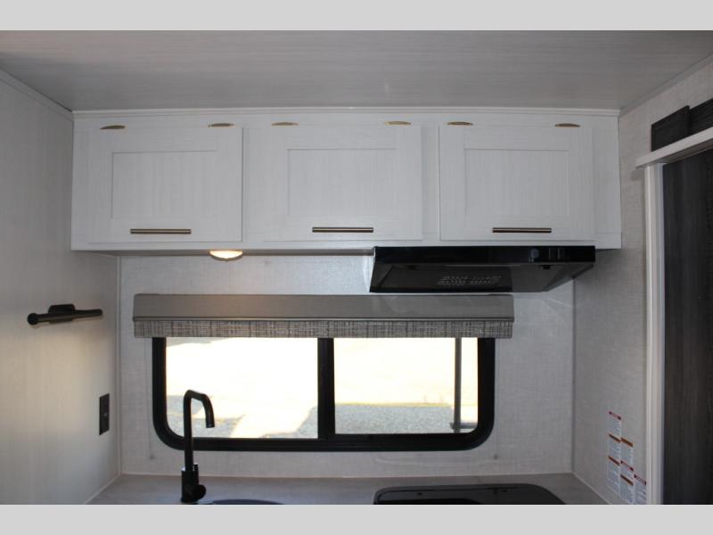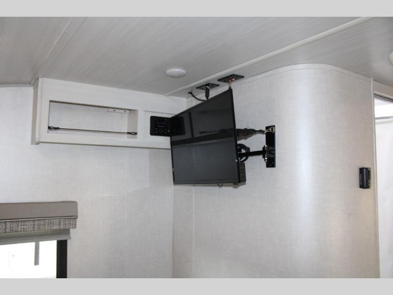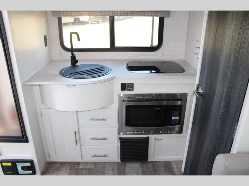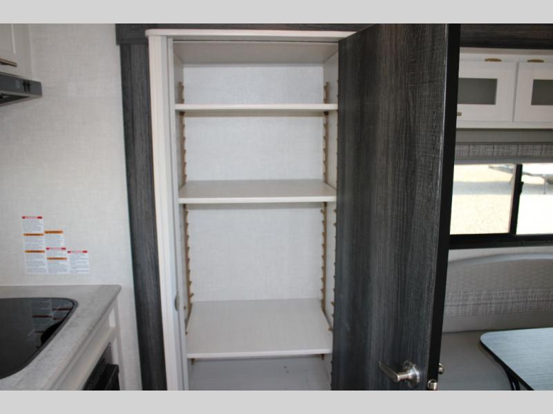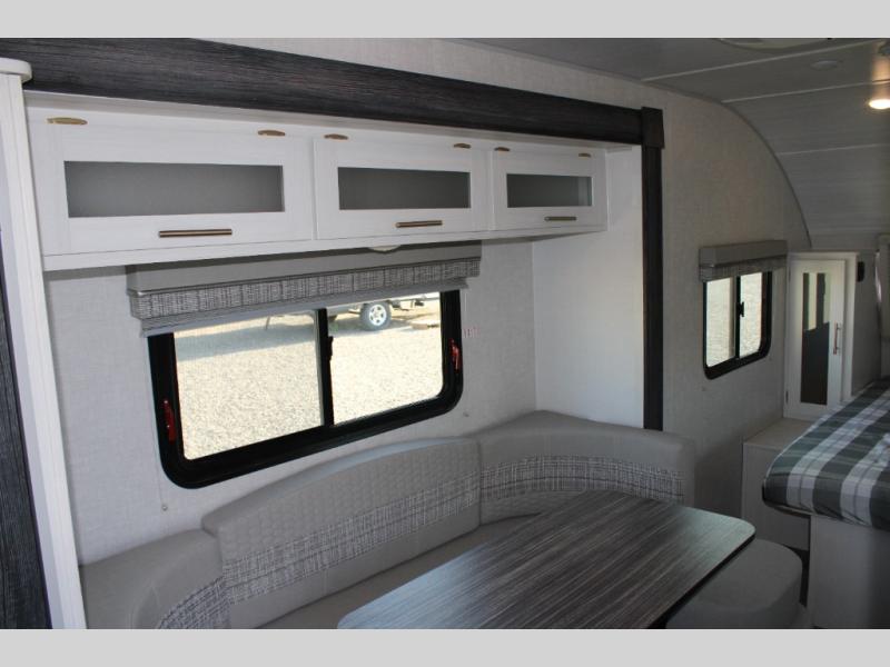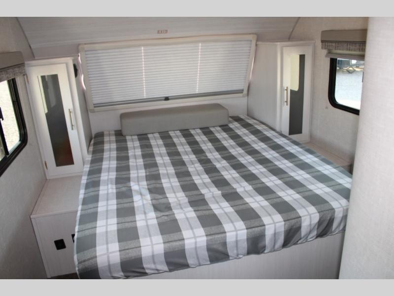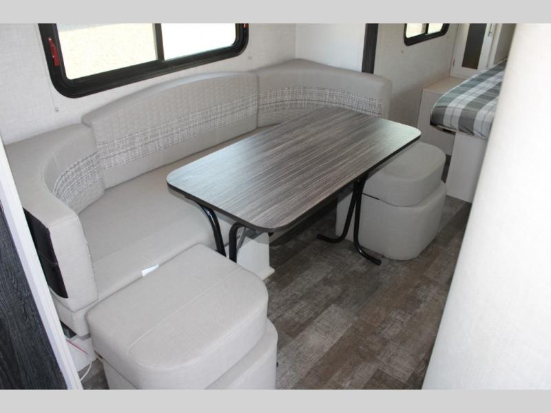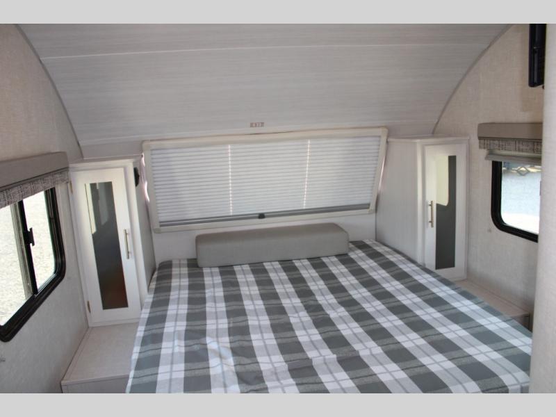 You are going to love waking up every camping weekend in this R-Pod travel trailer which features plenty of space and loads of storage for all of your things. The rear kitchen is unique and provides a large window above the cooktop and sink so that you can feel like you are cooking right outdoors even on a day when the weather isn't perfect. The U-shaped dinette and pantry within the slide out provides dining and sleeping space, dry good storage, as well as more interior floor space. The front RV queen bed will allow you to wake refreshed for each new day of adventure with extra walking around space, and you will appreciate the windows on each side for cross ventilation, as well as a great view of your surroundings.