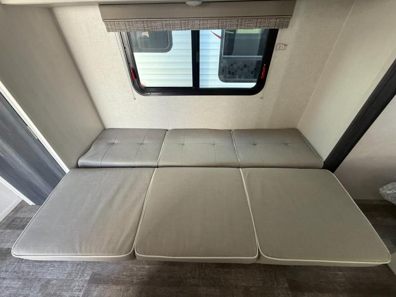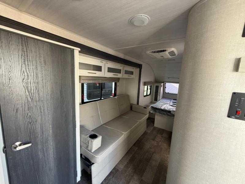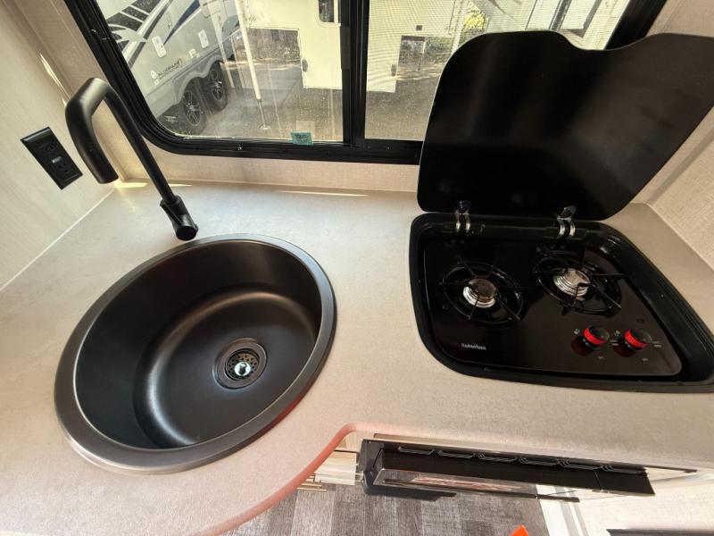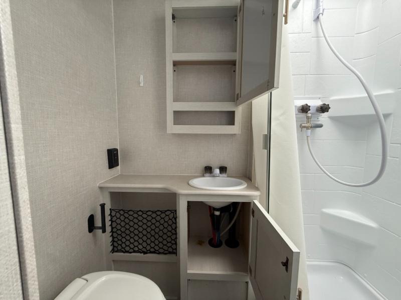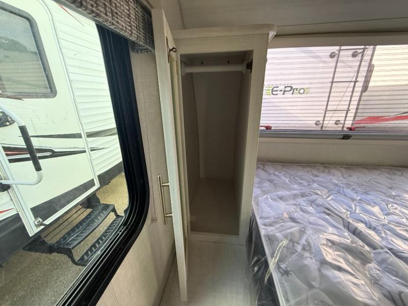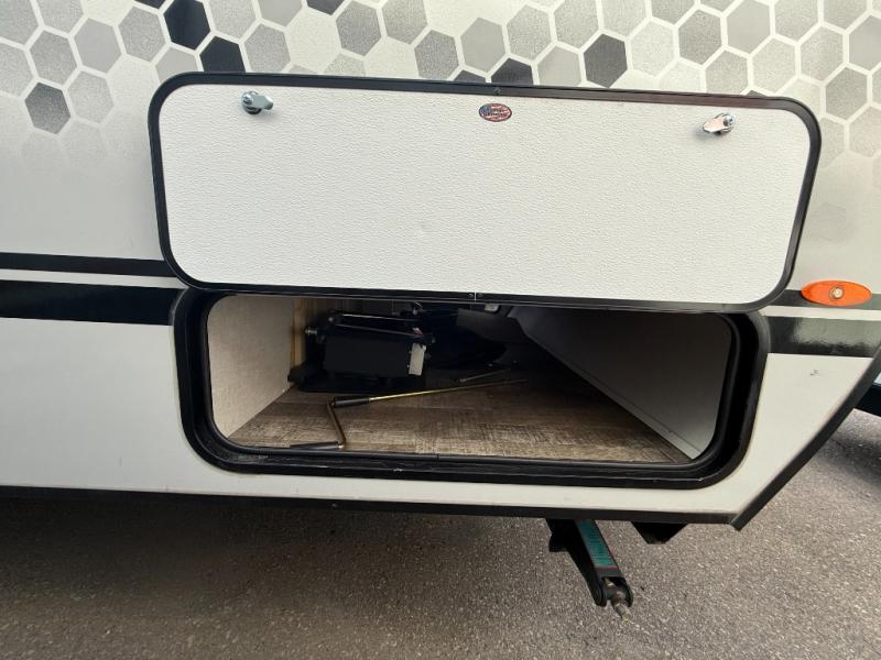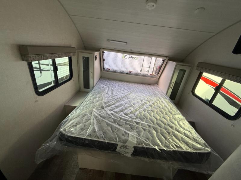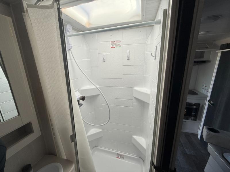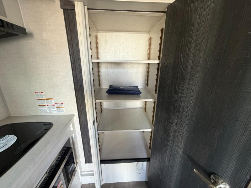 This is the perfect travel trailer for a couple or a small family, so pack your bags and get ready for an adventure in this R-Pod! After you've set up camp and had a look around the campgrounds, you can prepare lunch on the two-burner cooktop in the rear kitchen. There is a convenient three-way refrigerator and a pantry to store your favorite snacks and perishables, plus overhead compartments for your belongings. This model also includes a full bath so that you don't have to worry about using the camp's facilities, and the exterior pass-through storage allows you to bring along the fishing poles!