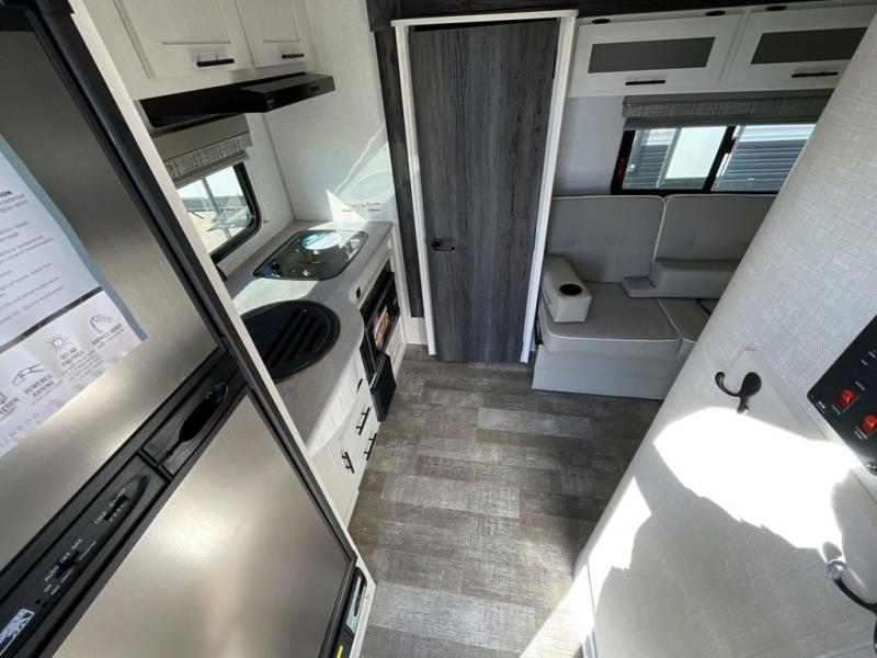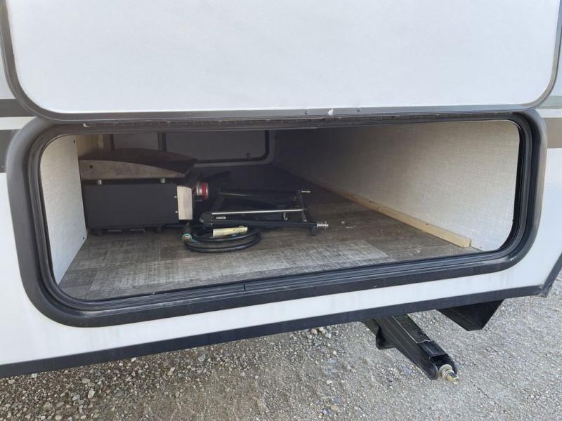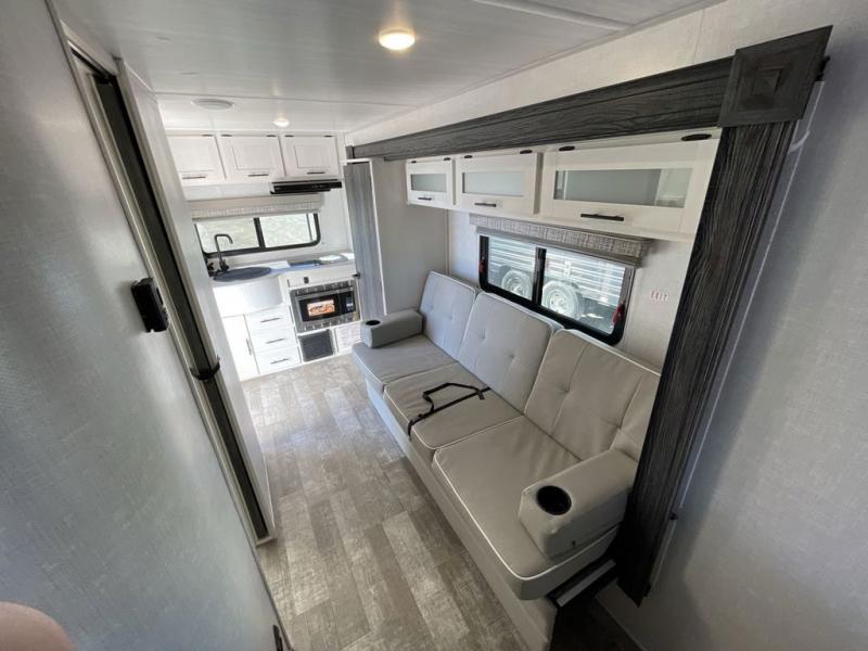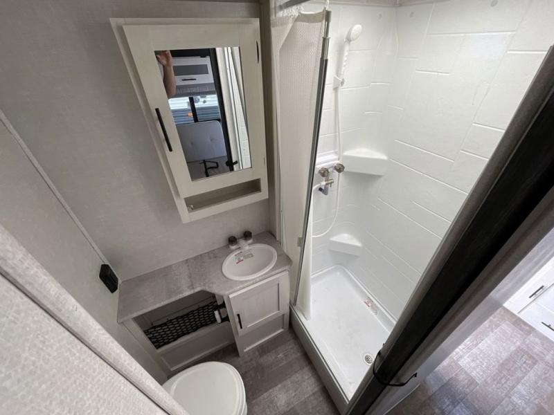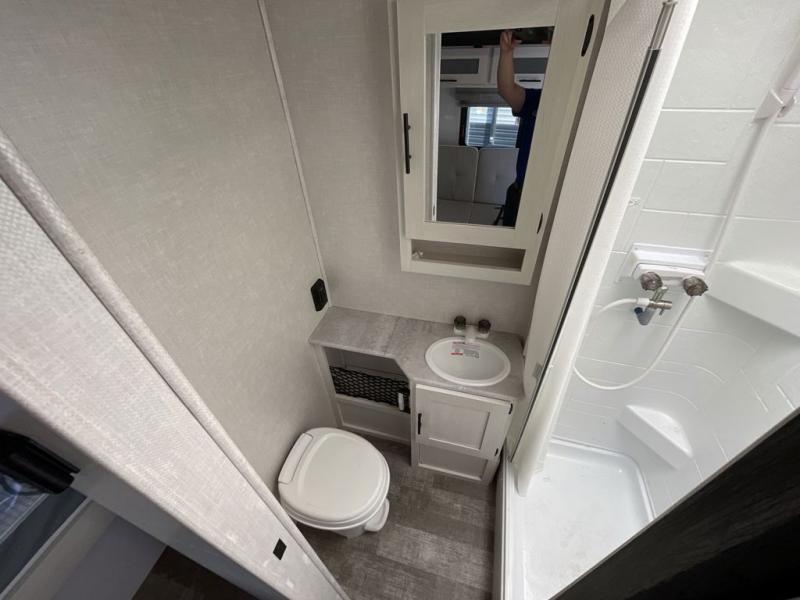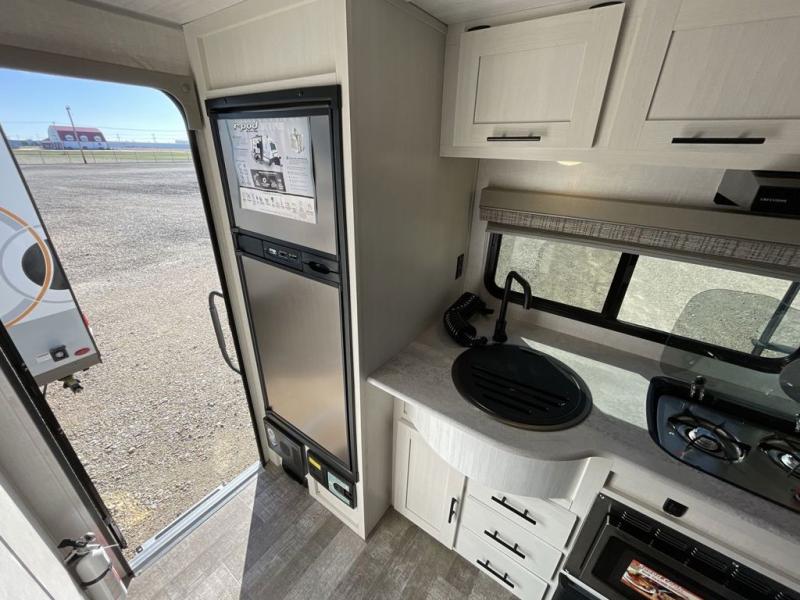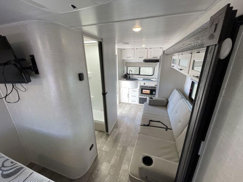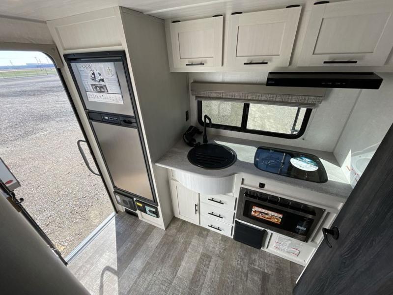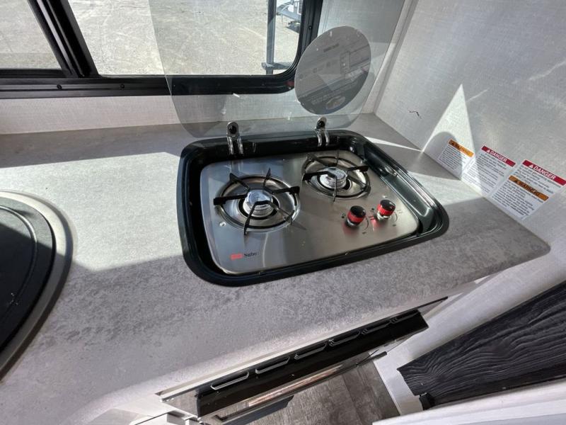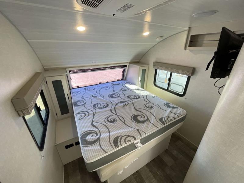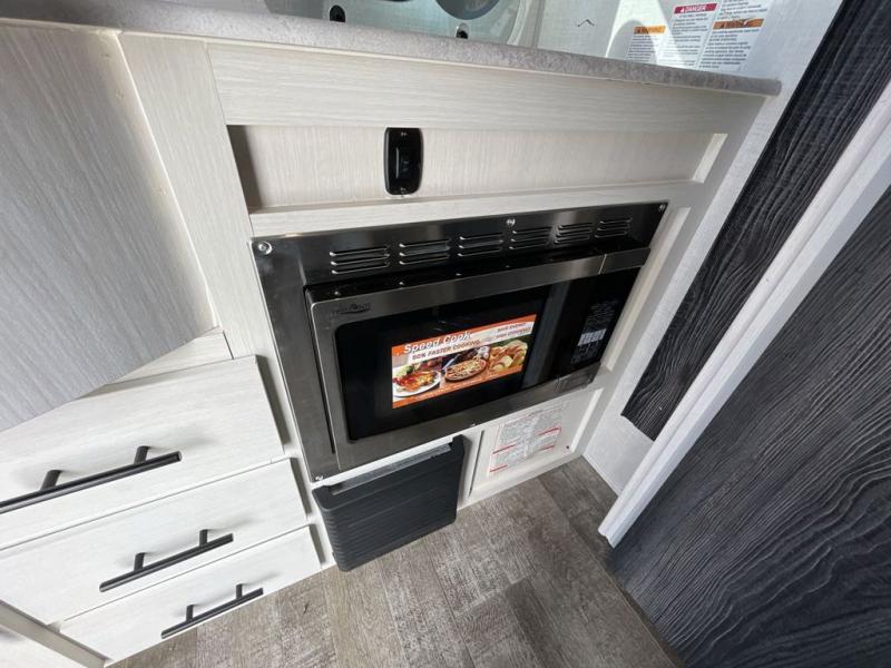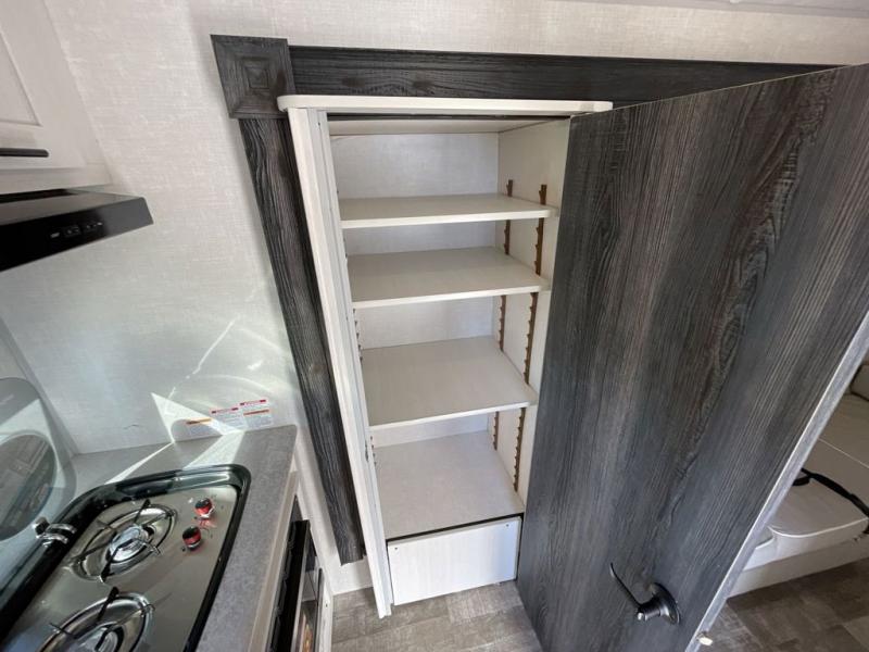 This is the perfect travel trailer for a couple or a smaller family, so pack your bags and get ready for an adventure in this R-Pod! After you've set up camp and had a look around the campgrounds, you can prepare lunch on the two-burner cooktop and in the convection microwave found in the rear kitchen. There is a convenient refrigerator and pantry to store your favorite snacks and perishables, plus overhead compartments for more items. The full bath allows you to skip the camp's facilities, and the exterior pass-through storage provides space for you to bring along the fishing poles!