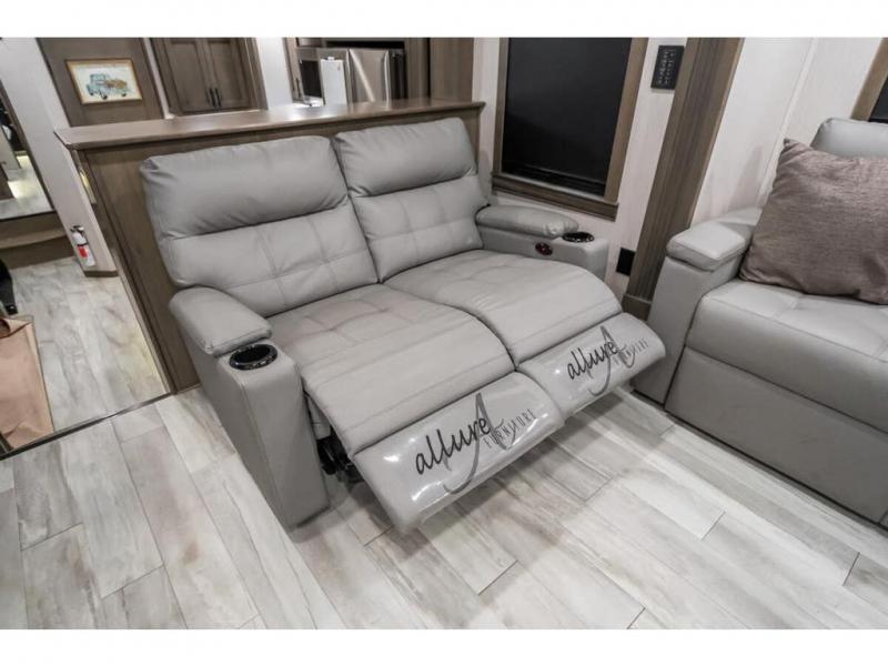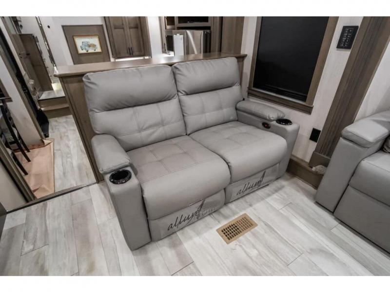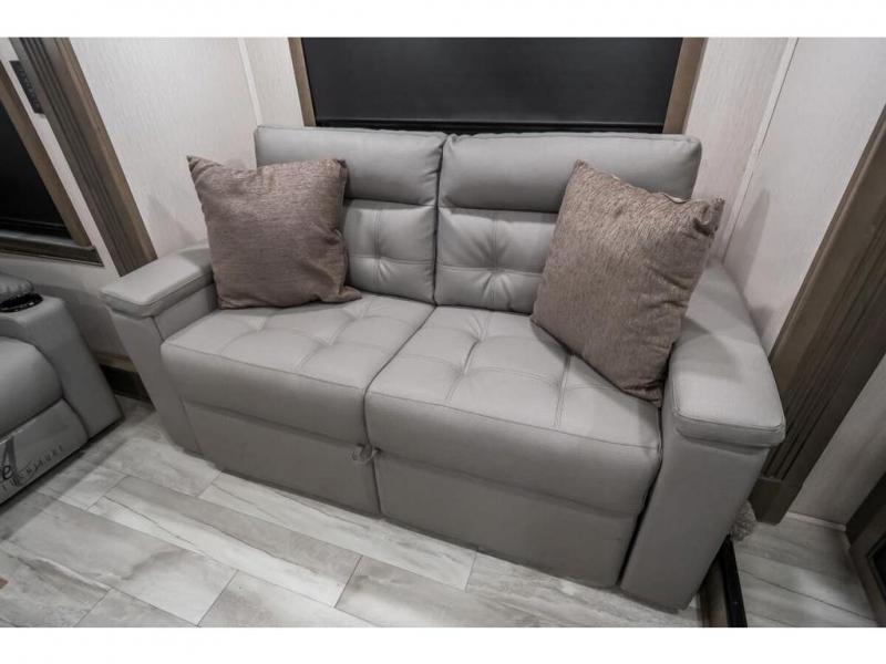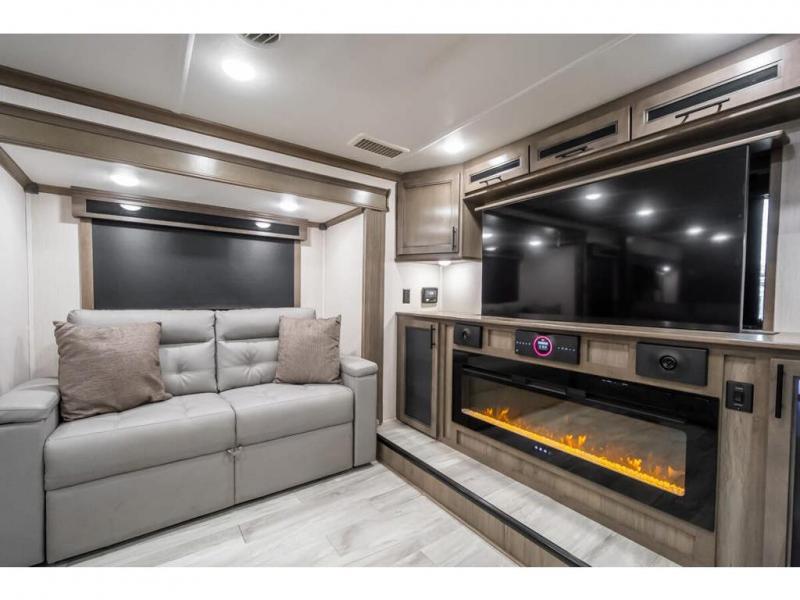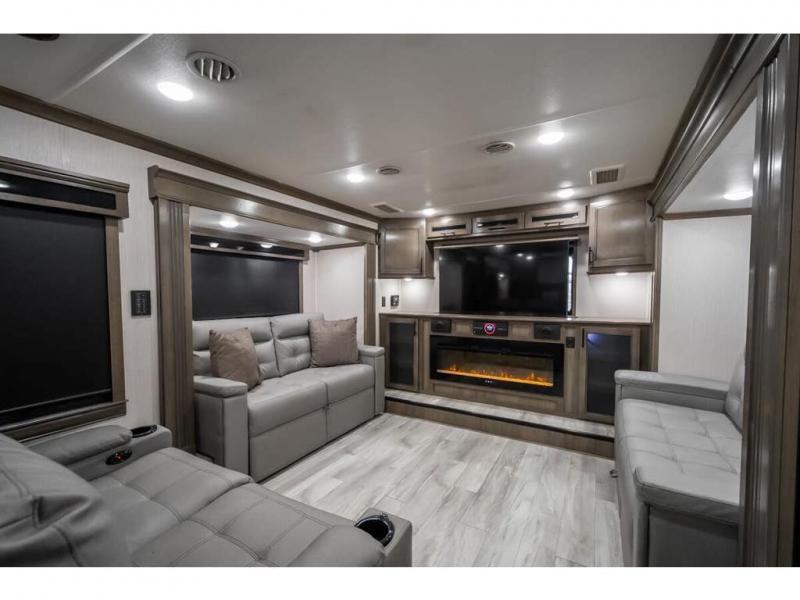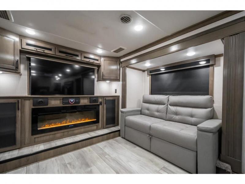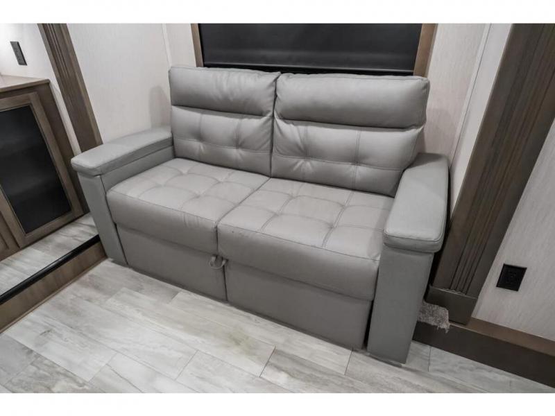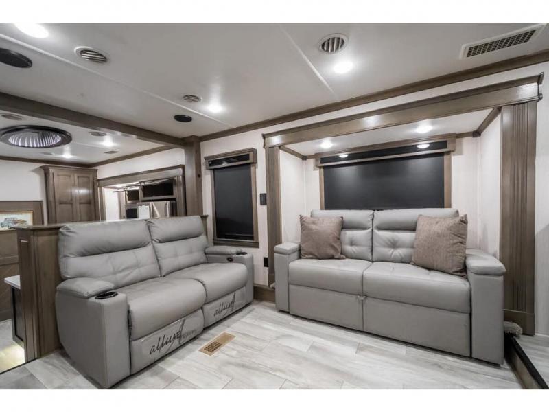 This RiverStone fifth wheel is a force to be reckoned with! It has a front living room that will make you feel right at home with its opposing E-Z glide sofa beds, theater sofa, 50" pop-up TV, and fireplace. The kitchen is where you will find the 18-cubic foot French door refrigerator with ice maker, the four-burner range, the island, and the half bathroom. In the back of this unit is a master suite that contains a king-size bed and a full bathroom, so you'll be spending each of your nights in great luxury. When you step outside, you'll be covered with two electric awnings with LED lights, so you won't have to worry about getting a sunburn.