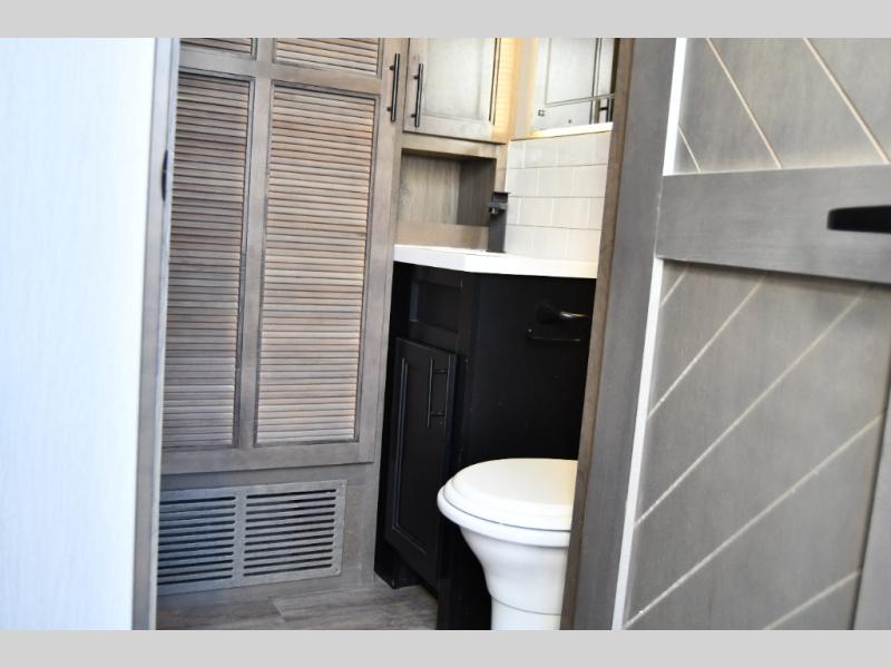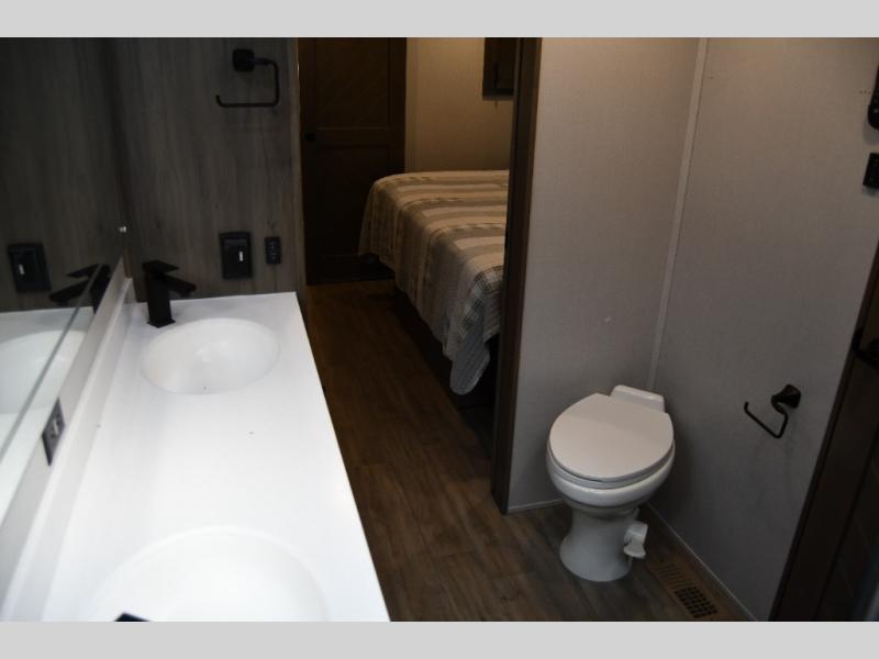 The private master bedroom provides a quiet retreat with residential storage, a comfortable sleeping area, and a spacious bathroom designed for everyday convenience. From morning routines to relaxing evenings, this RV is built to support a true residential lifestyle.
