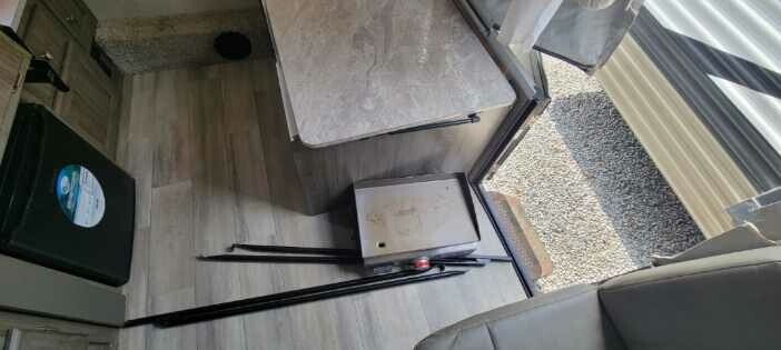 Extreme Package upgrades like heated mattress ends, awning with LED lighting, outside griddle, Bluetooth stereo with outside speakers, power roof lift, and a roof-mounted solar array with inverter.