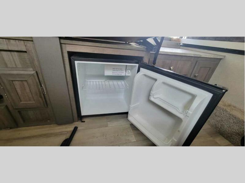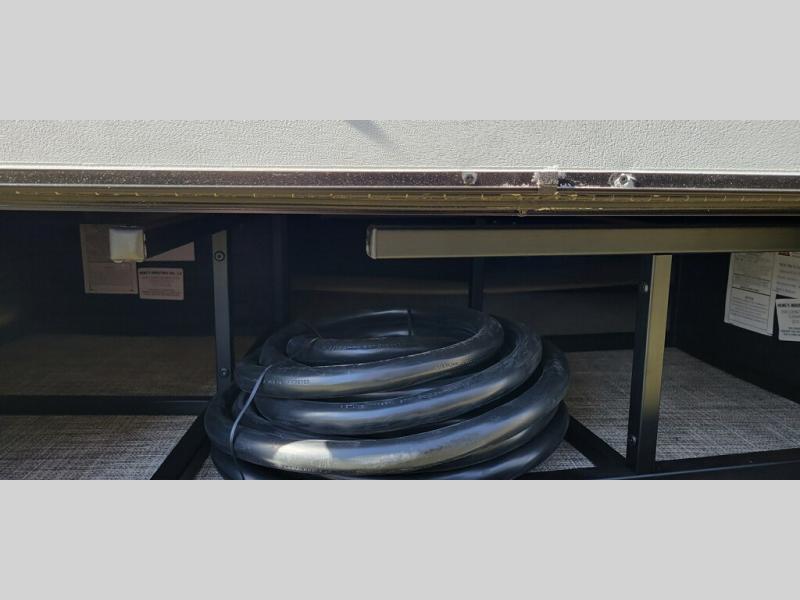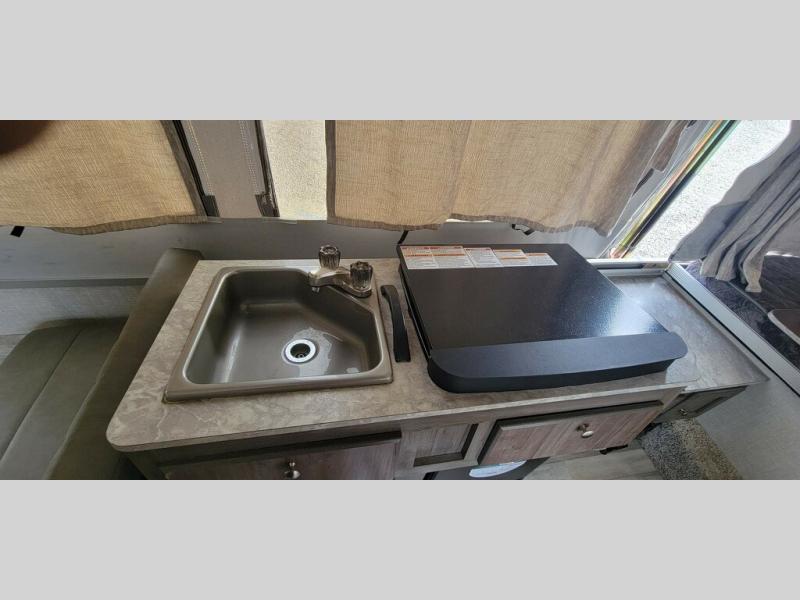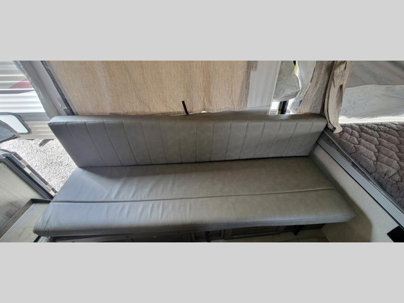 Get ready for family fun outdoors at your favorite campgrounds to enjoy hiking, fishing or whatever it is you love to do while away! This camper allows you to easily set up the two tent end beds for more interior space, dine at the booth dinette with drop leaf table, and relax on the gaucho/bed while you decide what to do next. The cook will have a swing galley to make meals including a refrigerator, and there is cabinet space to store items. And along the exterior there is a 28x84 front deck storage with expanded metal decking to carry some larger items. You might like to add the optional shower/Port-a-Pottie for convenience, and the Hot Water package with outside shower comes standard and allows you to get cleaned up before going inside. A few more highlights include residential style cabinet doors, full extension metal drawer guides, and USB charging ports.