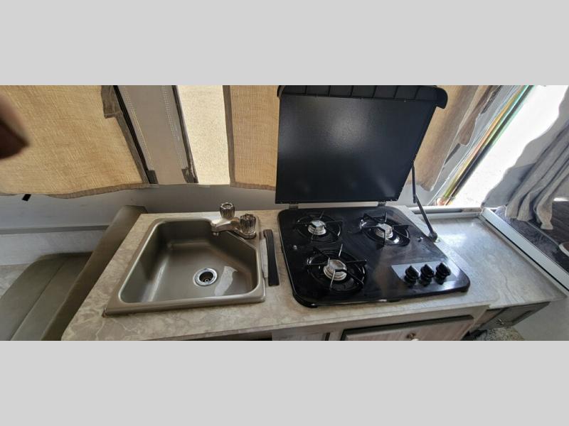 3-burner range with cover and a 12-volt refrigerator (~1.7 cu ft on newer models).