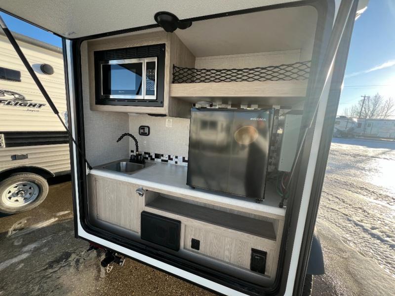 All of your needs will be met with this small, basic travel trailer that can be towed by a small vehicle! You will start each morning feeling rested and ready to go after sleeping on the 54" x 74" bed. Breathe in some fresh air and take in your beautiful scenery while you cook at the outside griddle, and store any leftovers inside the electric refrigerator. When you're ready to wind down your nights, pop a bag of popcorn into the microwave and watch your favorite movie on the 12V TV with the DVD player. Or you may just want to add the optional 7' awning for evenings outdoors!