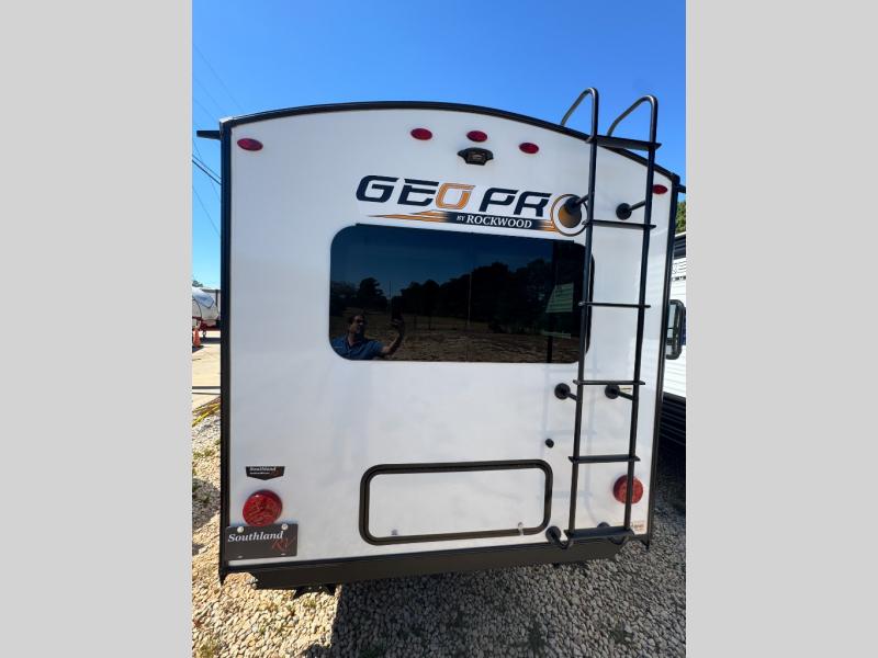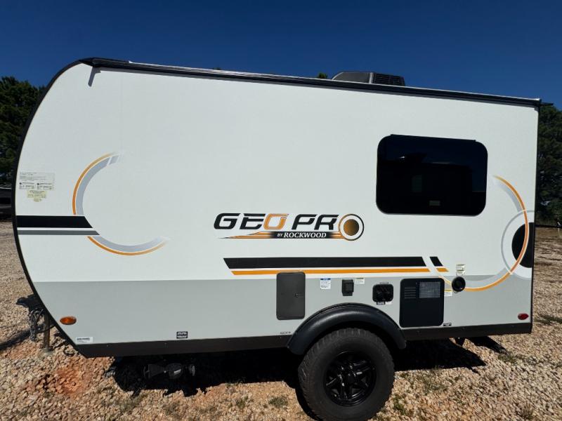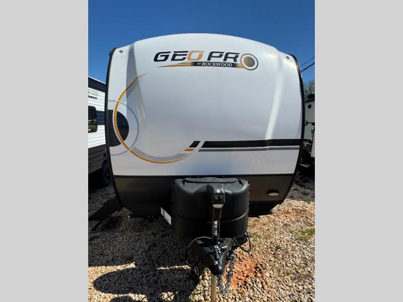 The Rockwood GEO Pro travel trailers and toy hauler by Forest River are ready for all your adventures. The interior and exterior Azdel construction, along with the vacuum laminated roof and walls provide a durable trailer, and the Dexter torsion axles with aluminum wheels make towing easier than ever. There are many convenient amenities, like the 13,500 BTU A/C, the Bluetooth system control panel, and the all-in-one Teton HD TV/WiFi/FM antenna with LTE prep. Each model includes frameless windows, fabric valances and roller shades, and a modern interior that will make you feel right at home. Everything you're looking for in your next RV is in a Rockwood GEO pro by Forest River!