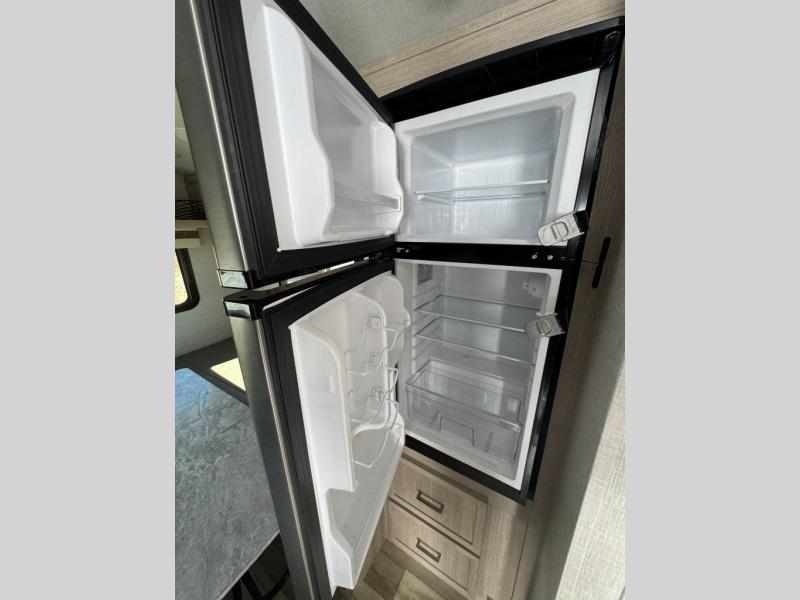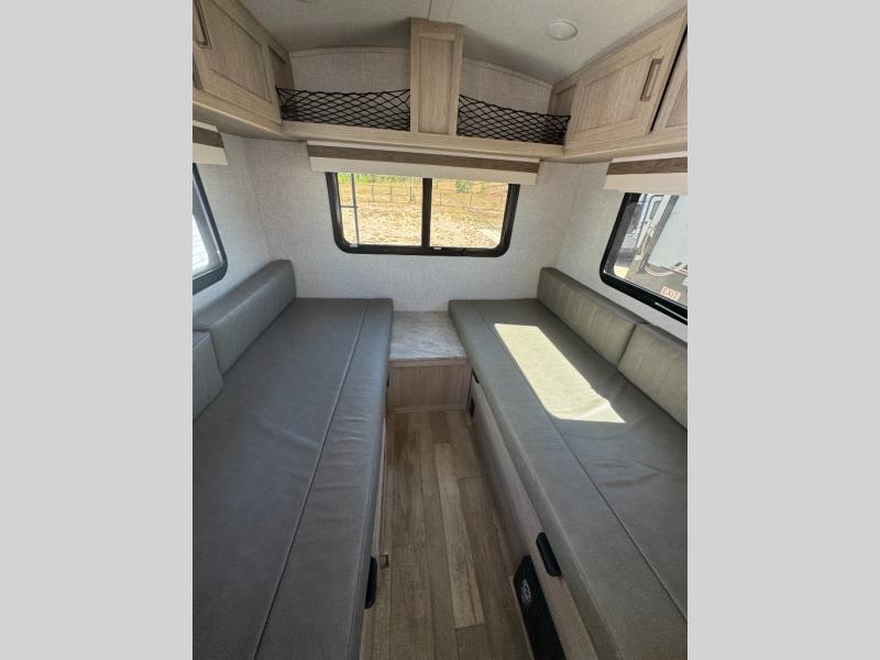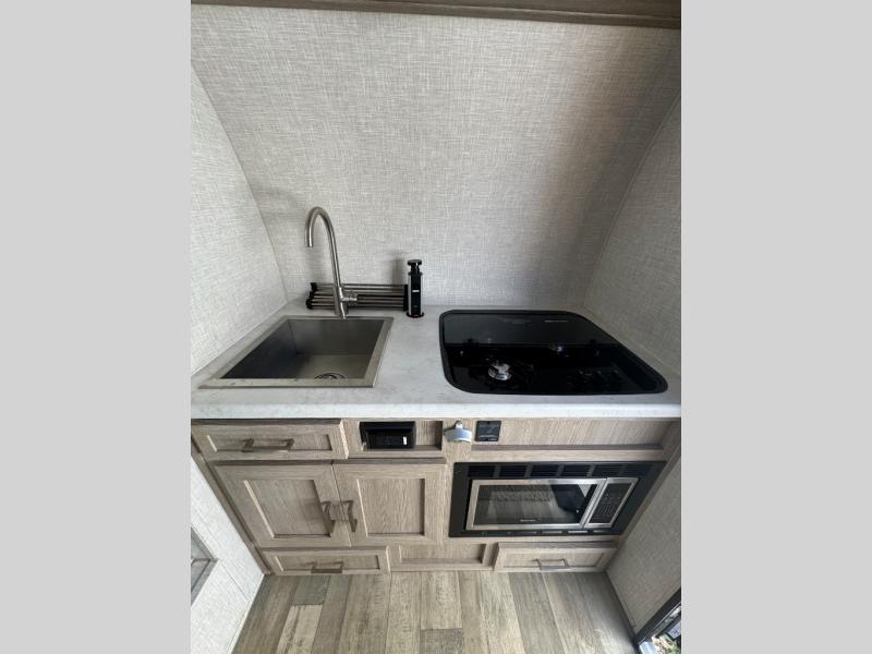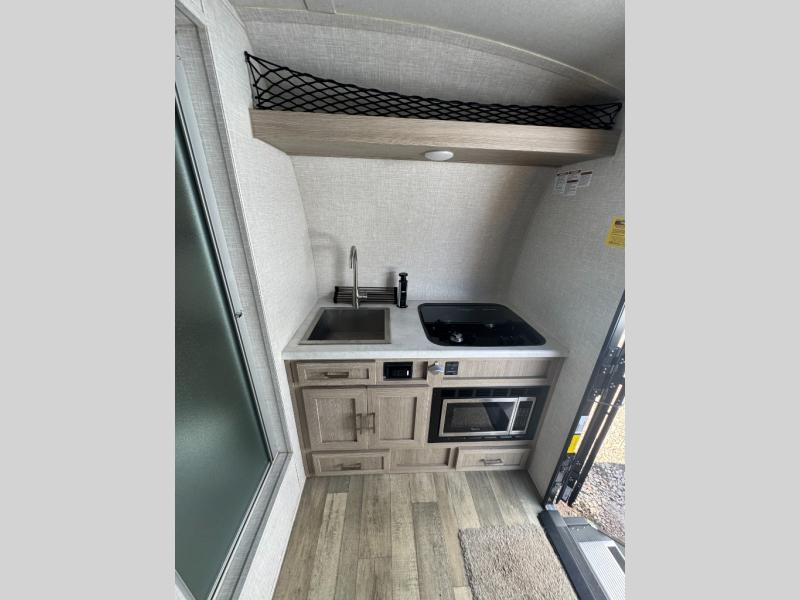 It's easy to see why this model is know a the "Swiss Army Knife" of RVs. It may be the smallest walkable trailer in the lineup, but it doesn't skim on features. The twin beds convert to a king-size bed for your comfort, and there is even a 12V TV to enjoy in the evenings. The kitchen includes a three burner cooktop, a microwave oven, plus a 12V refrigerator for perishables. You'll find overhead compartments for your valuables, and exterior storage for your hiking gear!