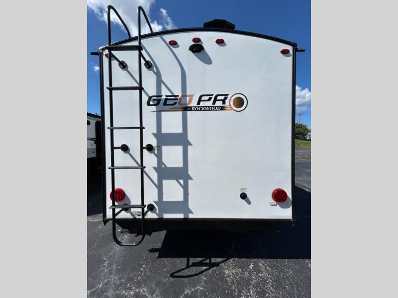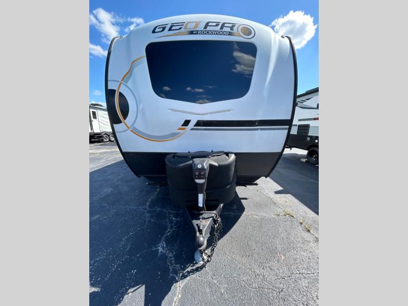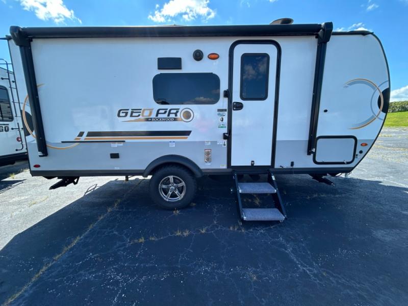 The Rockwood GEO Pro travel trailers and toy hauler by Forest River are ready for all your adventures. The interior and exterior Azdel construction, along with the vacuum laminated roof and walls provide a durable trailer, and the Dexter torsion axles with aluminum wheels make towing easier than ever. There are many convenient amenities, like the 13,500 BTU A/C, the Bluetooth system control panel, and the all-in-one Teton HD TV/WiFi/FM antenna with LTE prep. Each model includes frameless windows, fabric valances and roller shades, and a modern interior that will make you feel right at home. Everything you're looking for in your next RV is in a Rockwood GEO pro by Forest River!