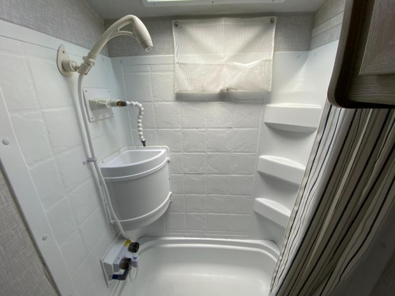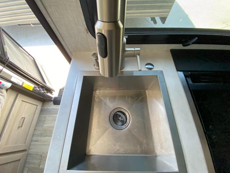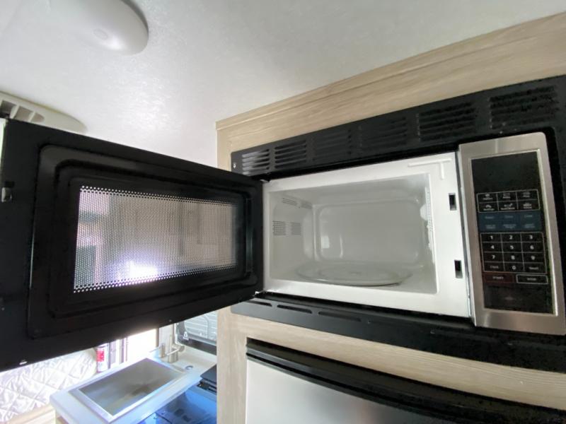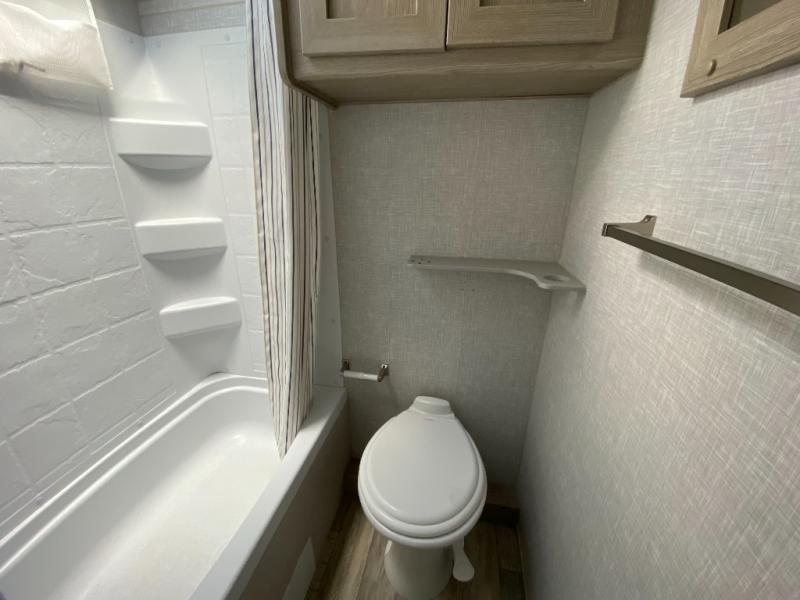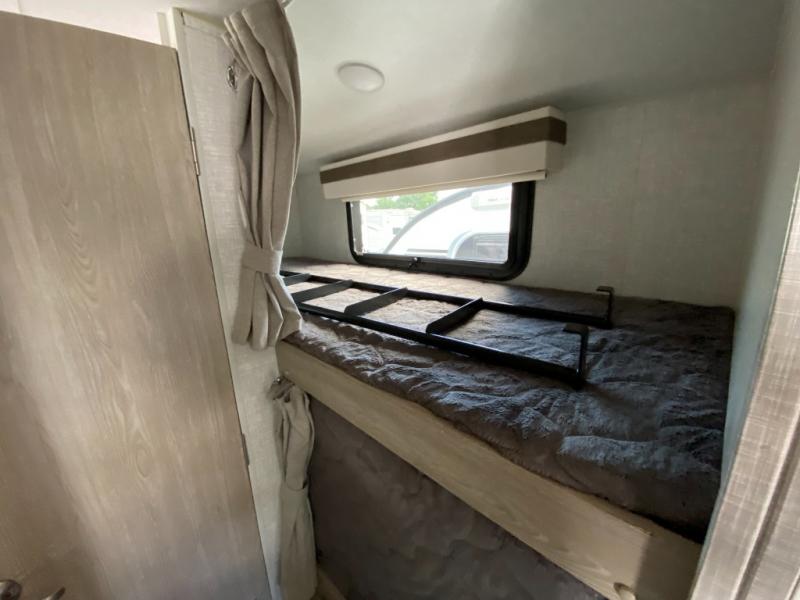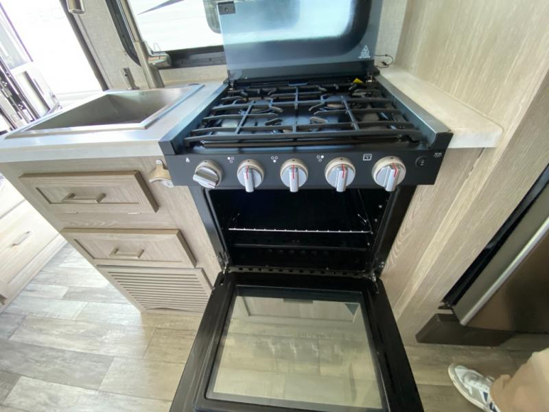 This no slide travel trailer is the perfect lightweight RV for those that love to move around to different campsites. It will be so easy packing up the lawn chairs in the exterior bike door, and there is a rear ladder if you need to clean off the top of your unit. Once you arrive at your destination, put out the 13' power awning, then make lunch on the outside griddle. You will also find a three burner cooktop indoors and a booth dinette where you dine together. This area can be a sleeping space for a small child or adult, plus there is a full-size bed up front and bunk beds in the back.