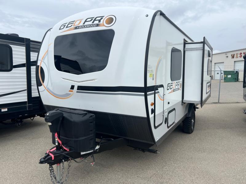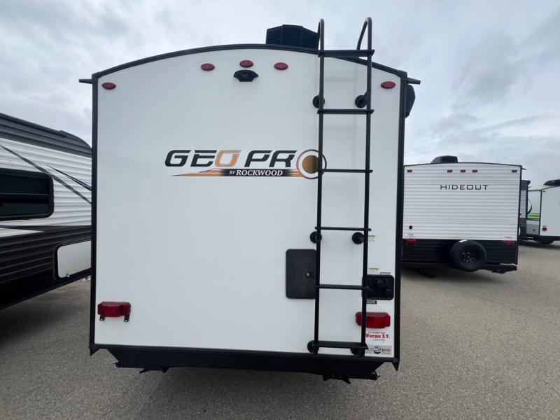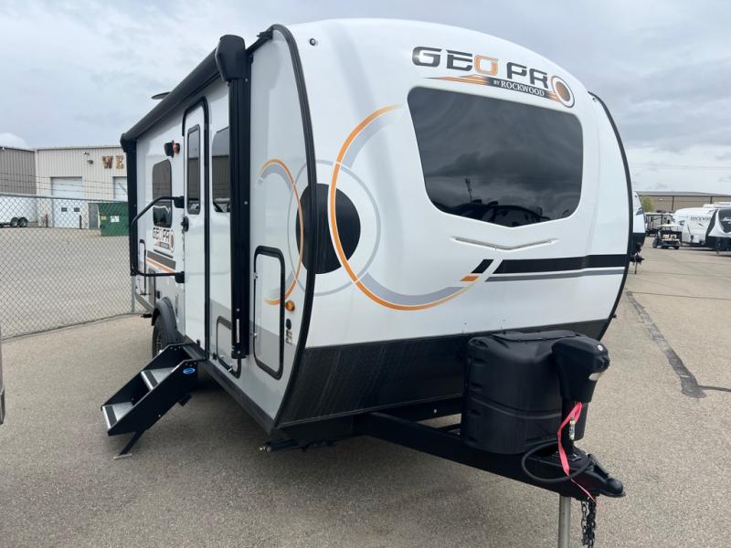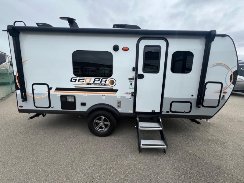 The Rockwood GEO Pro travel trailers and toy hauler by Forest River are ready for all your adventures. The interior and exterior Azdel construction, along with the vacuum laminated roof and walls provide a durable trailer, and the Dexter torsion axles with aluminum wheels make towing easier than ever. There are many convenient amenities, like the 13,500 BTU A/C, the Bluetooth system control panel, and the all-in-one Teton HD TV/WiFi/FM antenna with LTE prep. Each model includes frameless windows, fabric valances and roller shades, and a modern interior that will make you feel right at home. Everything you're looking for in your next RV is in a Rockwood GEO pro by Forest River!