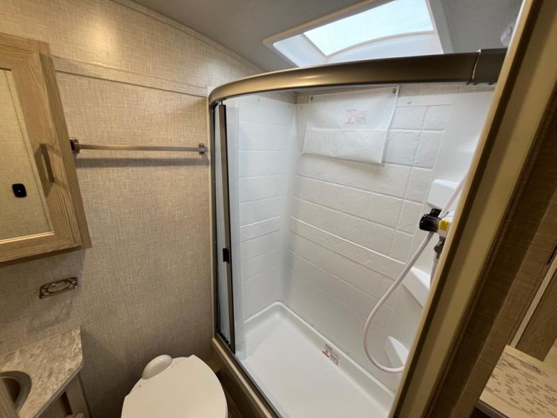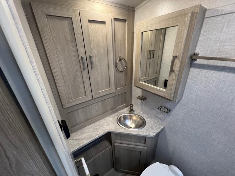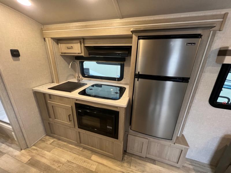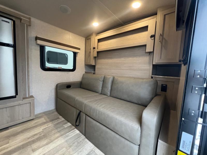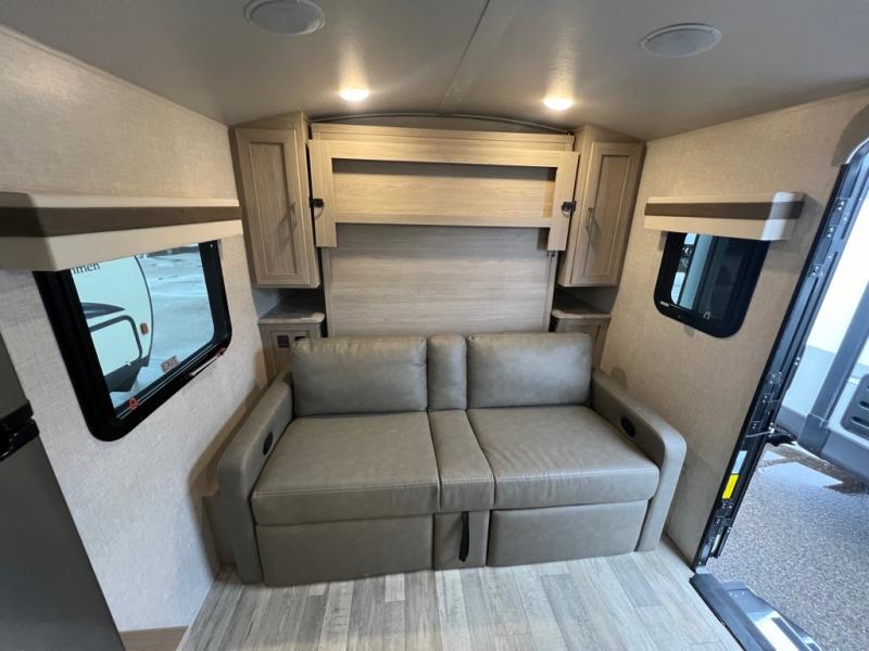 Comfortable sleeping space, convenient seating space, and a full rear bath makes this couple's trailer the one! You will love being able to relax on the sofa during the day, and sleep on the Murphy bed at night. There is a single slide out that will provide you more space to move around or cook meals, and the full bath includes a large shower so you won't feel cramped. If it's a rainy day you can watch movies on the 12V TV, and if it's nice out, sit under the 14' power awning and cook lunch on the outside griddle. The possibilities are endless with this couple's trailer!