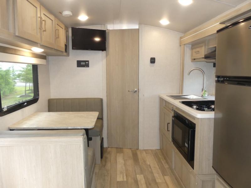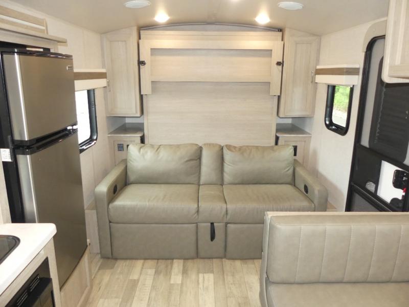 Comfortable sleeping space, convenient seating space, and a full rear bath makes this couple's trailer the one! You will love being able to relax on the sofa during the day, and sleep on the Murphy bed at night. There is a single slide out that will provide you more space to move around or cook meals, and the full bath includes a large shower so you won't feel cramped. If it's a rainy day you can watch movies on the 12V TV, and if it's nice out, sit under the 14' power awning and cook lunch on the outside griddle. The possibilities are endless with this couple's trailer!