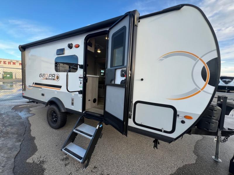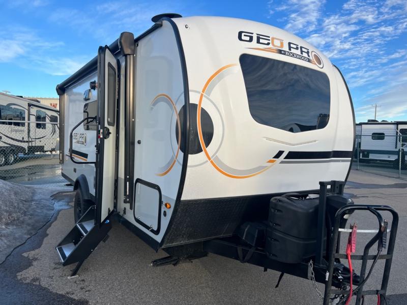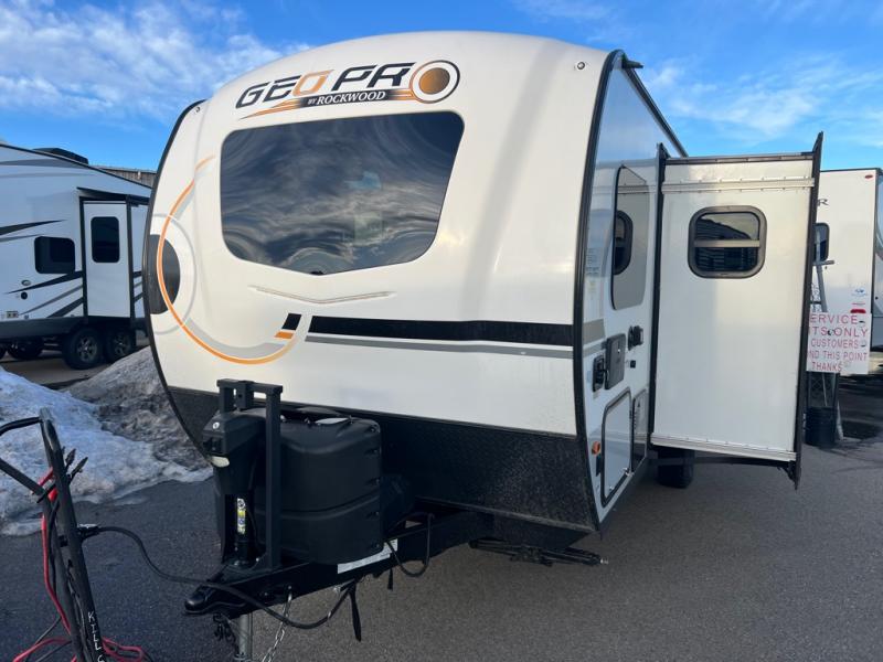 The Rockwood GEO Pro travel trailers and toy hauler by Forest River are ready for all your adventures. The interior and exterior Azdel construction, along with the vacuum laminated roof and walls provide a durable trailer, and the Dexter torsion axles with aluminum wheels make towing easier than ever. There are many convenient amenities, like the 13,500 BTU A/C, the Bluetooth system control panel, and the all-in-one Teton HD TV/WiFi/FM antenna with LTE prep. Each model includes frameless windows, fabric valances and roller shades, and a modern interior that will make you feel right at home. Everything you're looking for in your next RV is in a Rockwood GEO pro by Forest River!