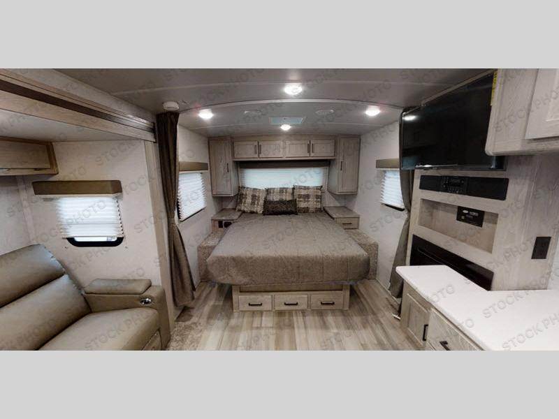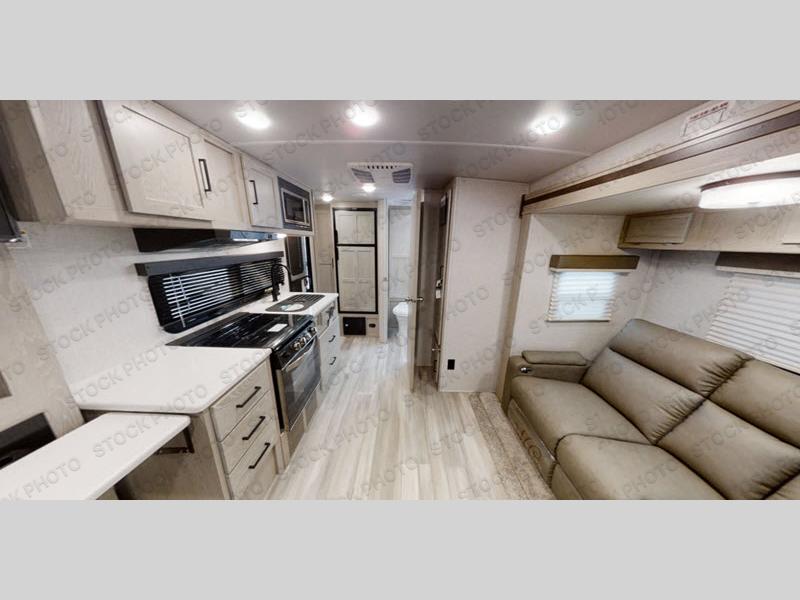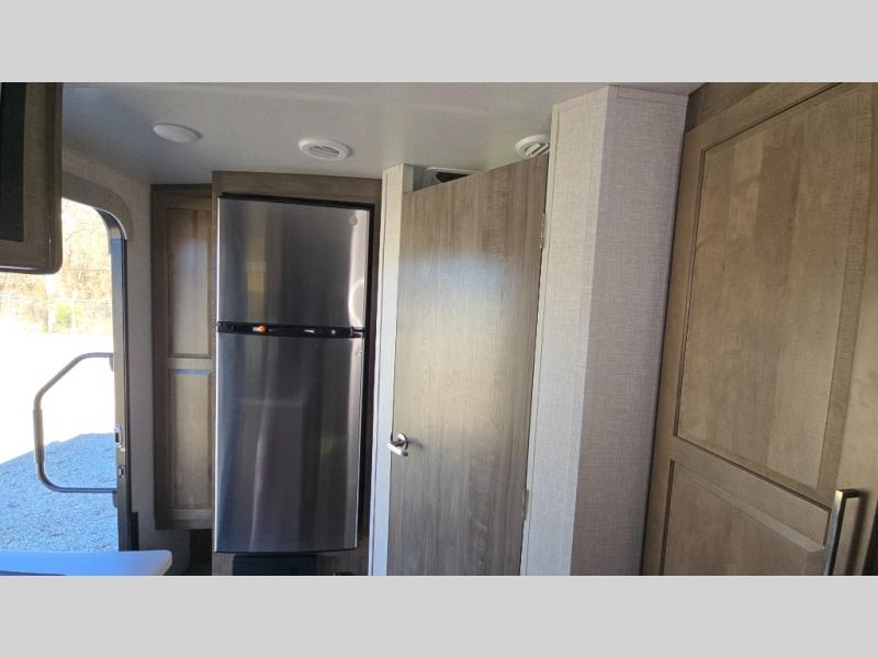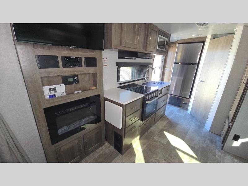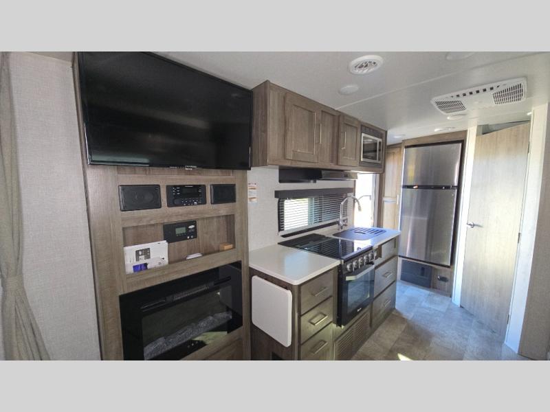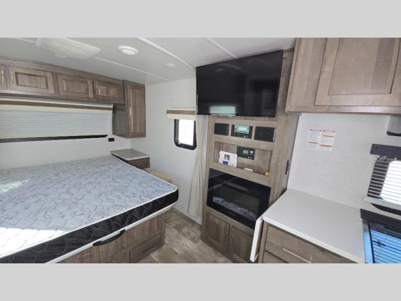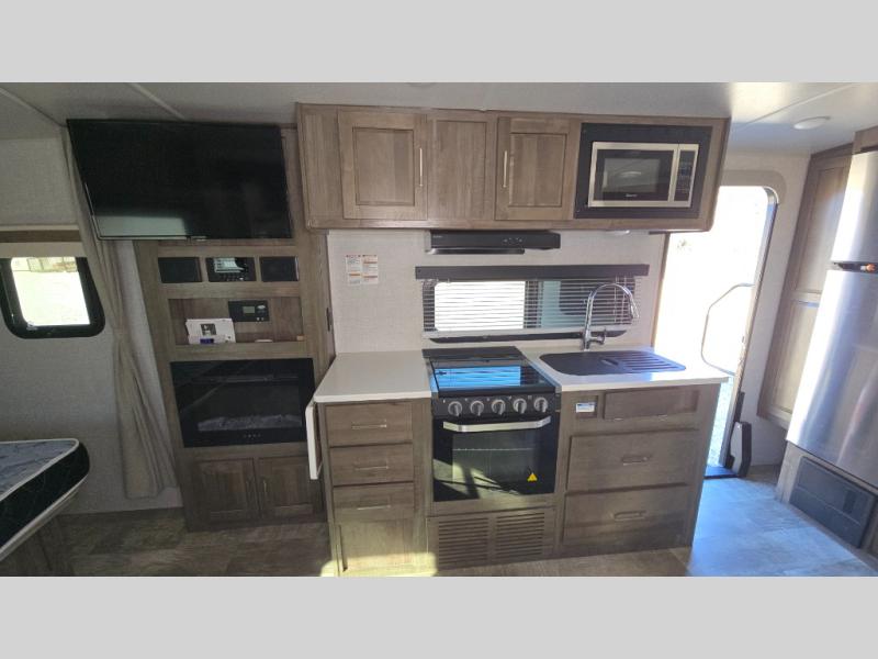 Enjoy camping season with your spouse, friend, or significant other in this cozy travel trailer for two. Each morning, you can have your coffee on the theater seating with a table within the slide out, then head outdoors to make pancakes on the outdoor griddle with an LP hookup. The interior kitchen includes a three burner cooktop, a microwave oven, plus a 12 volt refrigerator for perishables. An entertainment center with a fireplace will make your space feel more like home, and what's better than sleeping on your own queen bed with dual bedroom wardrobes for your clothes!?