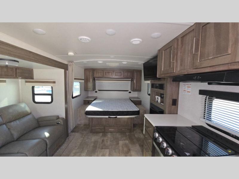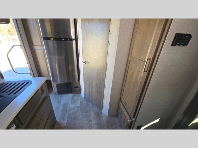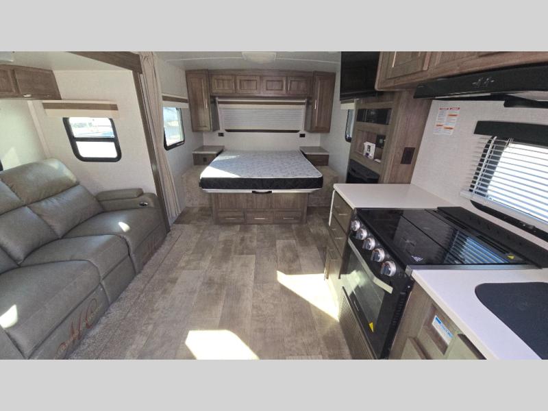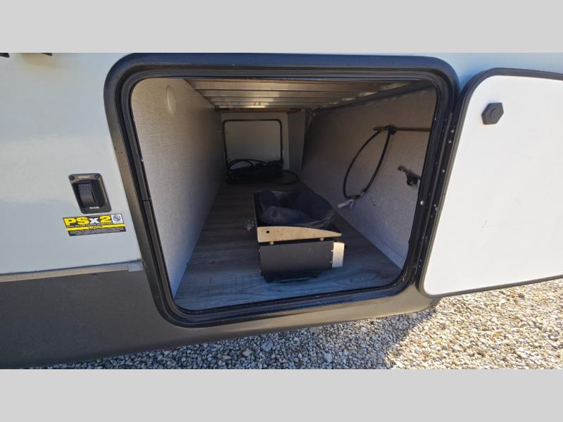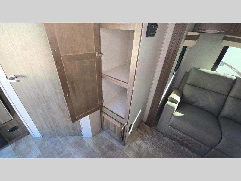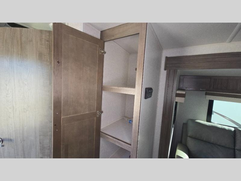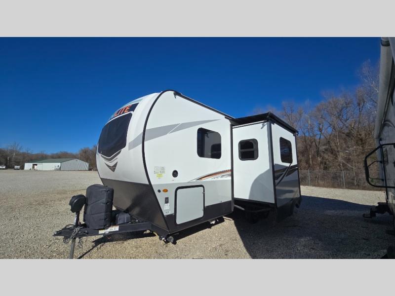 Enjoy camping season with your spouse, friend, or significant other in this cozy travel trailer for two. Each morning, you can have your coffee on the theater seating with a table within the slide out, then head outdoors to make pancakes on the outdoor griddle with an LP hookup. The interior kitchen includes a three burner cooktop, a microwave oven, plus a 12 volt refrigerator for perishables. An entertainment center with a fireplace will make your space feel more like home, and what's better than sleeping on your own queen bed with dual bedroom wardrobes for your clothes!?