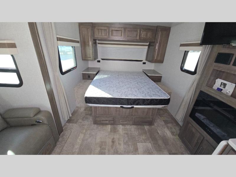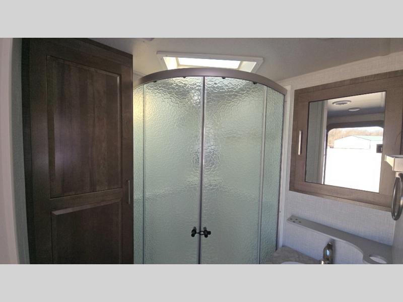 Spacious floorplan with lots of storage. Custom Front window cover, Entertainment Center, Slide Awning, Power Jacks, Queen Bed, 15' Power Awning with LED Lights, Water Filtration System, Bath Skylight