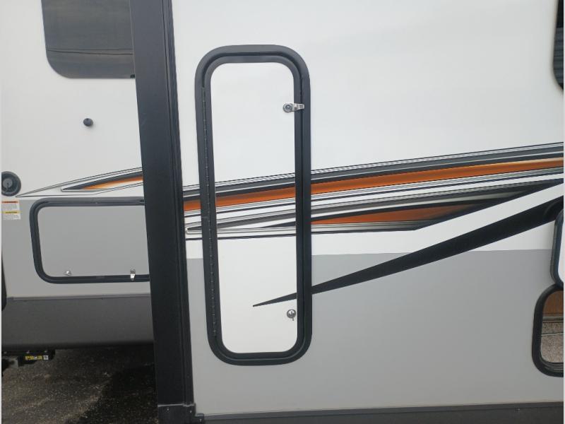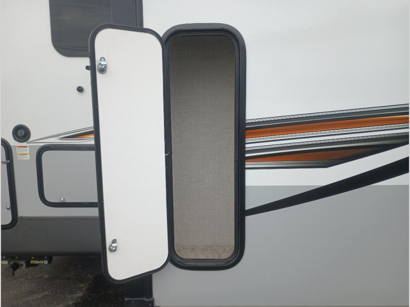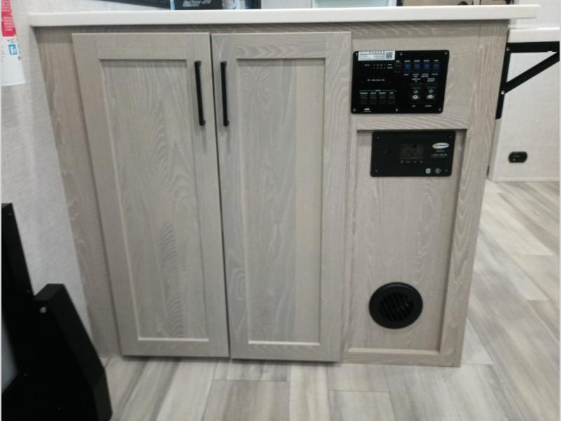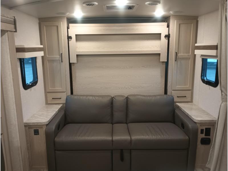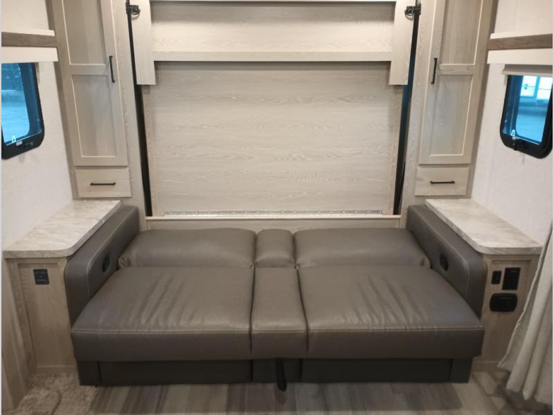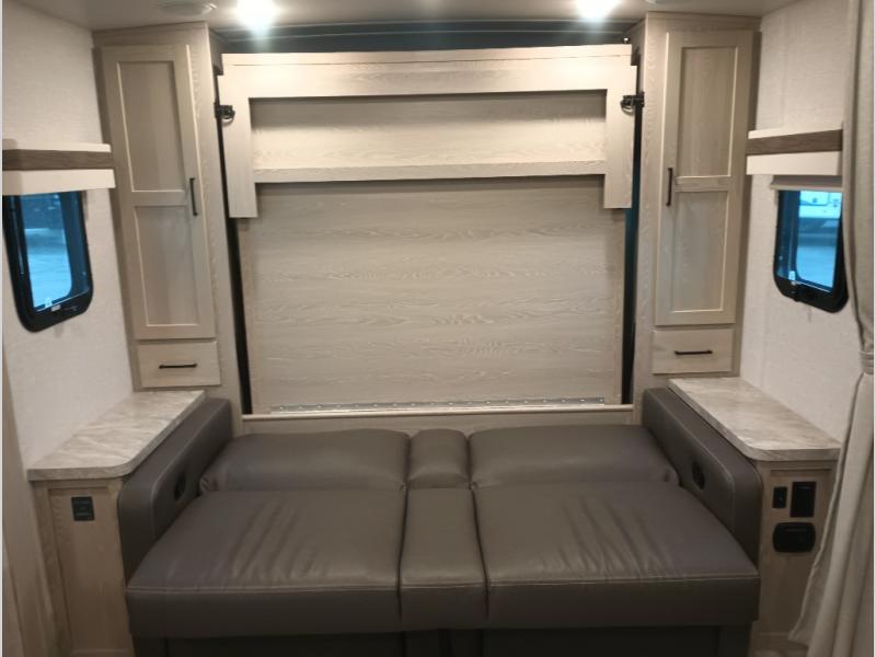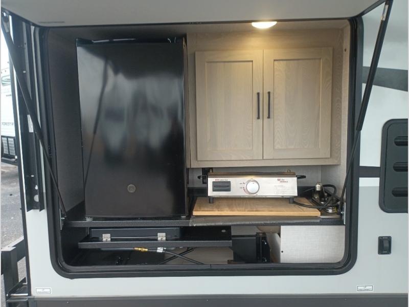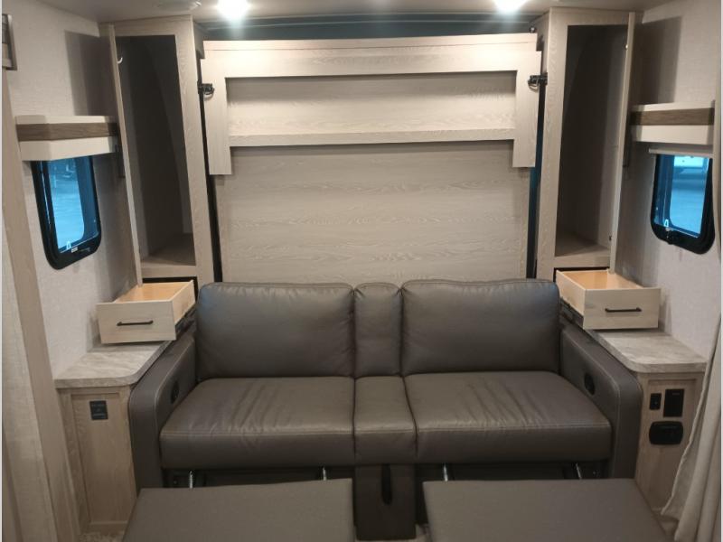 You can't beat this travel trailer with an outside kitchen, tons of exterior storage, and a versatile Murphy bed up front! When your crew isn't outside under the 19' power awning, they can head indoors to play a game around the U-shaped dinette, or watch a movie on the LED TV. There is also a 72" sofa here when the bed is folded away, and everyone will appreciate the spacious full rear bath for privacy. This model includes plenty of exterior space, but you'll be impressed by the interior storage space as well; dual bedroom wardrobes, a wardrobe within the slide out, plus a lean-in pantry in the kitchen for snacks!