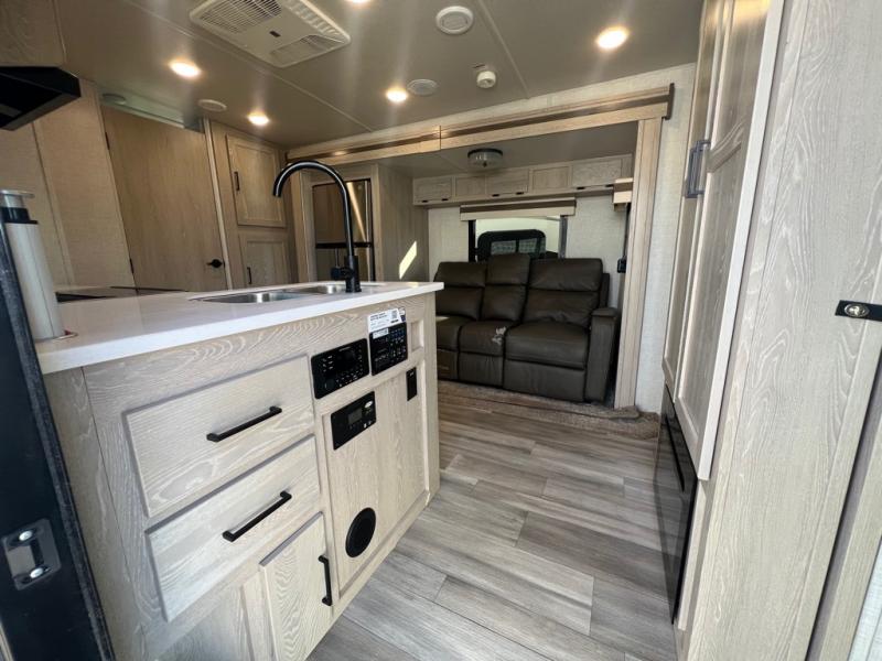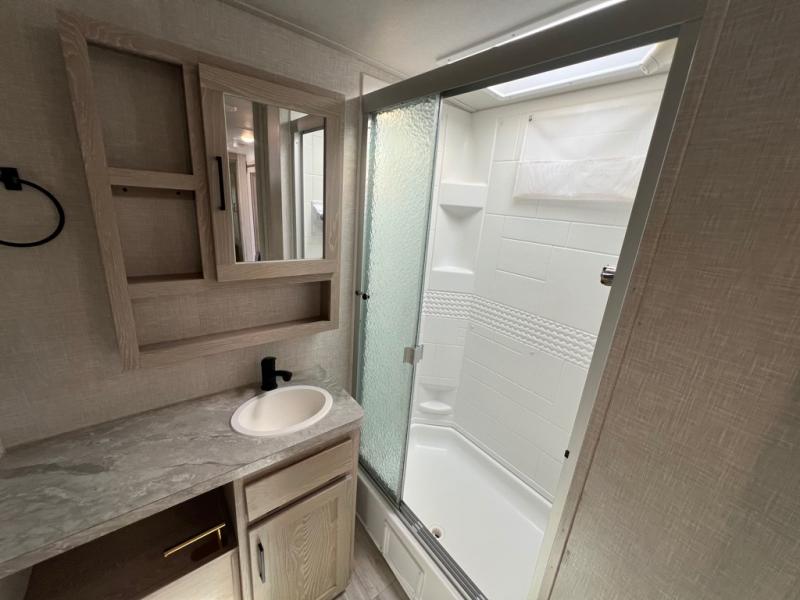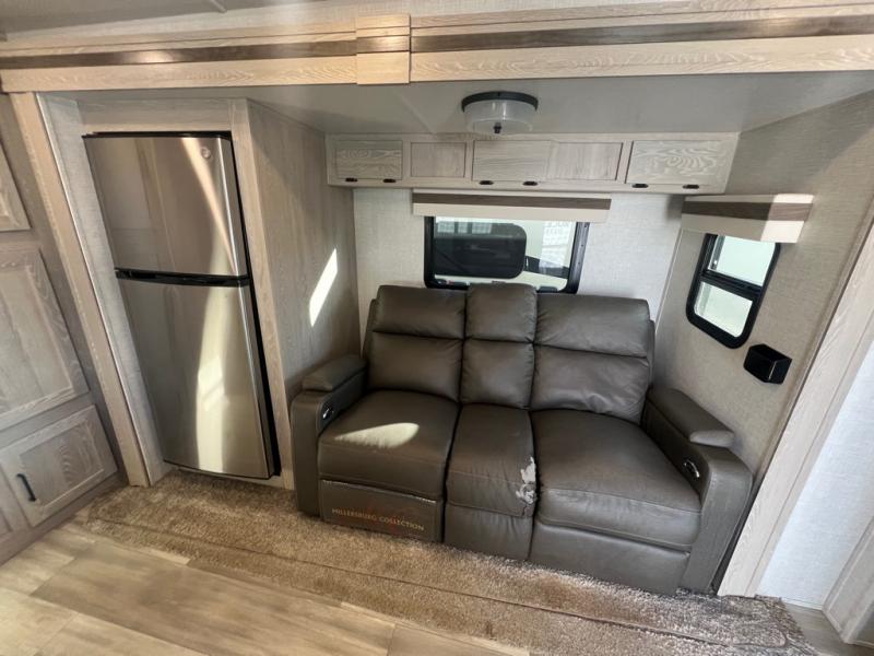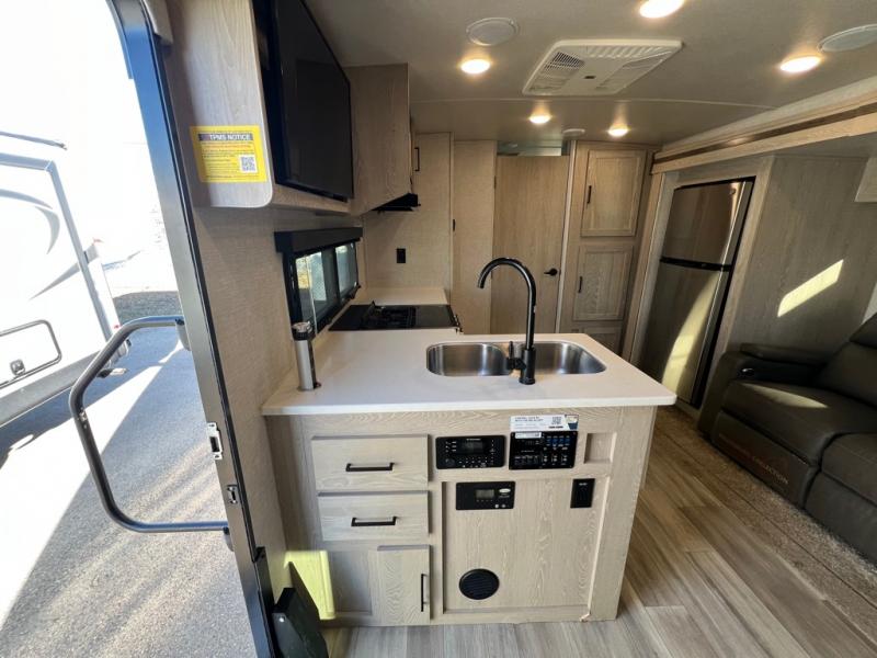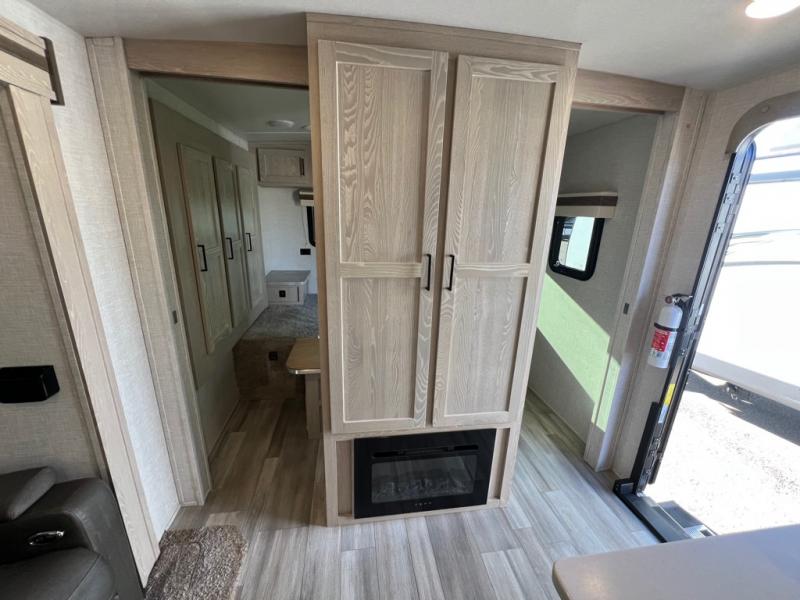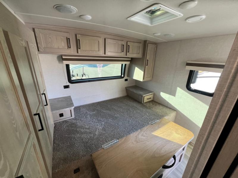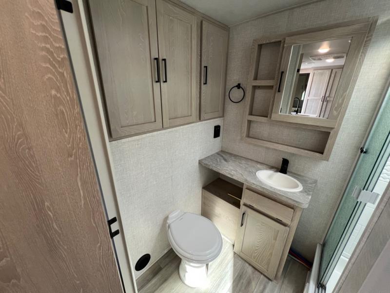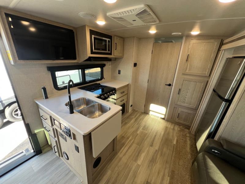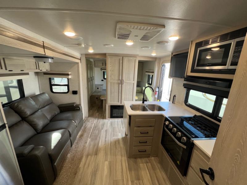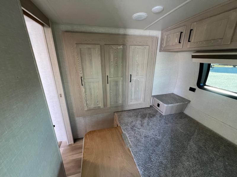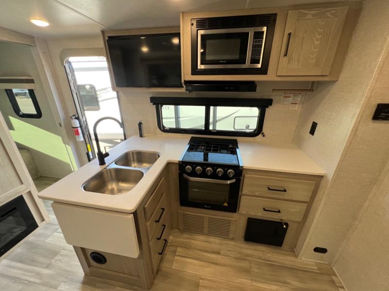 This is the perfect travel trailer for two people looking for comfortable camping trips! You will have your own RV queen bed to sleep on in the front private bedroom, and an optional TV can be added if you enjoy the morning news in bed. Breakfast can be made on the three burner cooktop, or head outdoors to cook on the outside kitchen. The theater seating with a table will provide a place to relax and dine together, and the spacious full rear bath will allow you to clean up before you head out for the day. This model includes plenty of storage space, including two pantries, a wardrobe slide out in the bedroom, plus a drop-frame pass-through storage for larger camp gear!