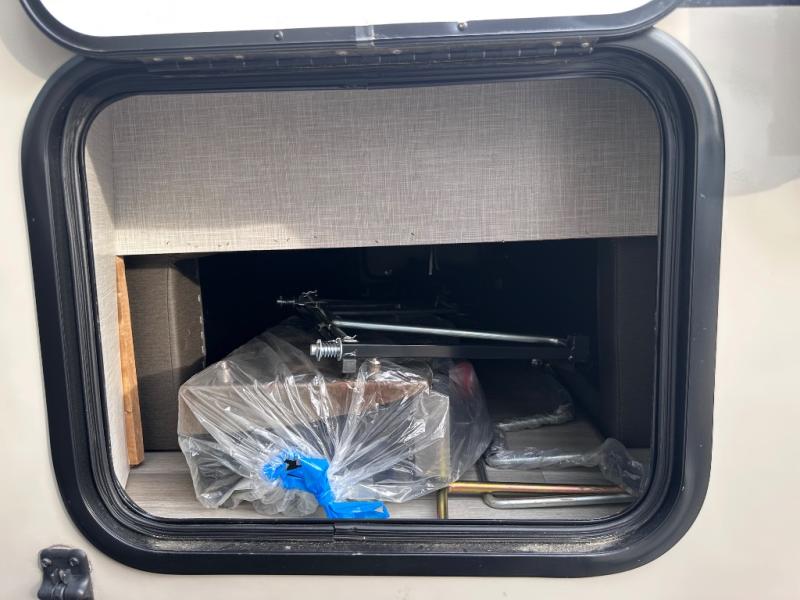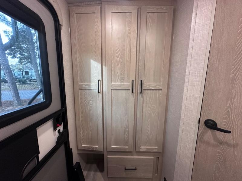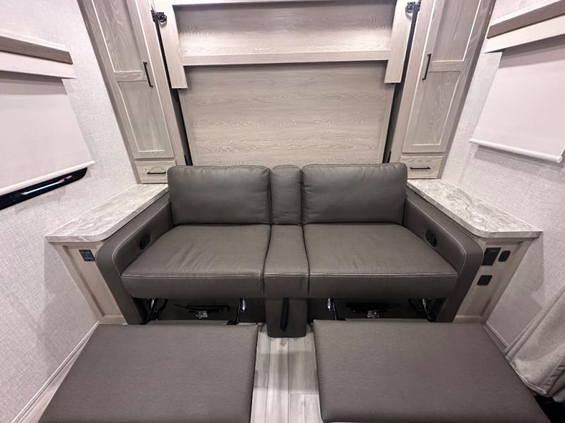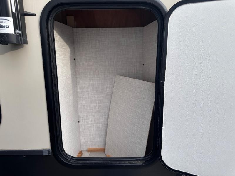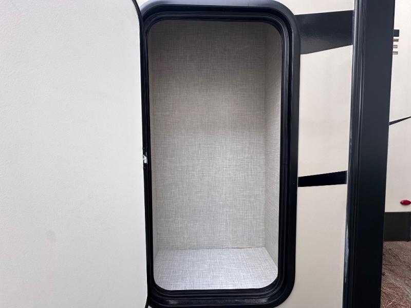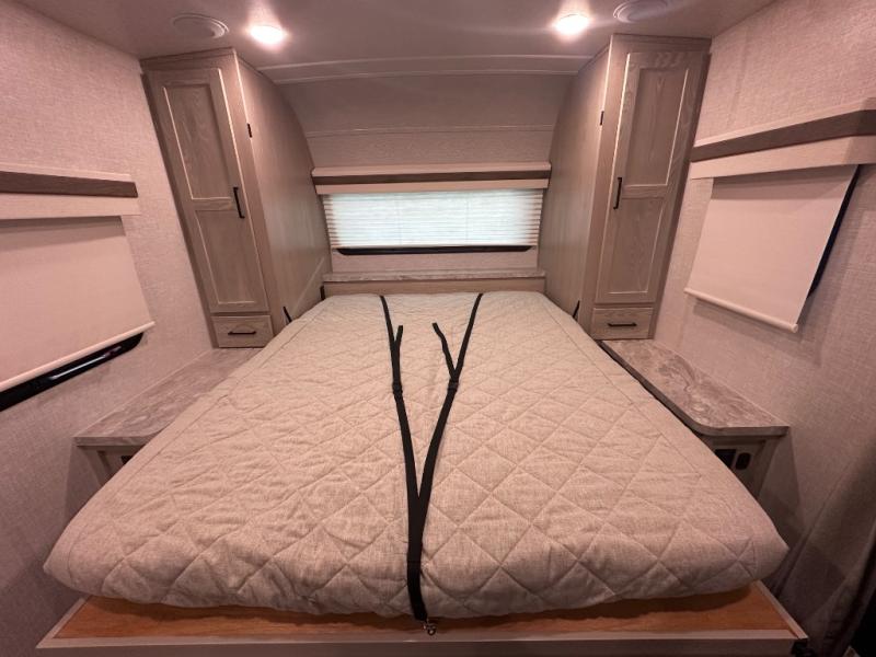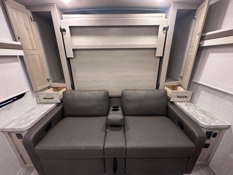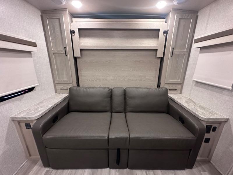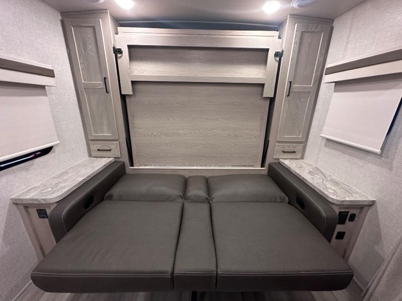 Comfort and versatility come standard in this travel trailer for two! You will love the front Murphy bed with dual wardrobes on either side of the bed for your things, and in the morning you can fold the bed away to relax on the sofa. There is a bar with stools that can serve as your breakfast bar, or you may just want to enjoy your coffee on the theater seating with a table. There is a place for all your belongings since this model includes tons of interior storage, plus a pass-through storage and a drop-frame storage outside for fishing poles, lawn chairs, or firewood. And did we mention this model includes dual entry doors?! How convenient!