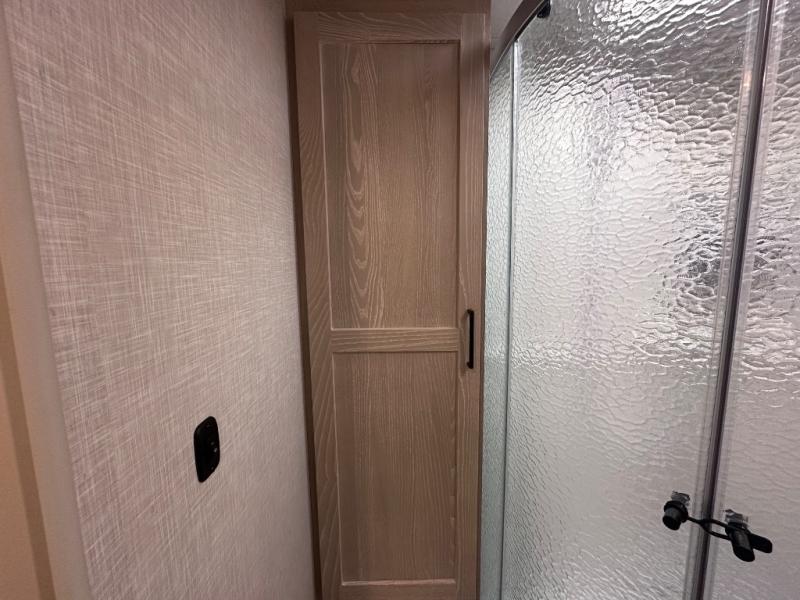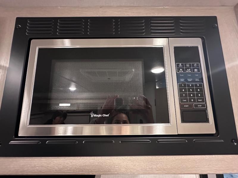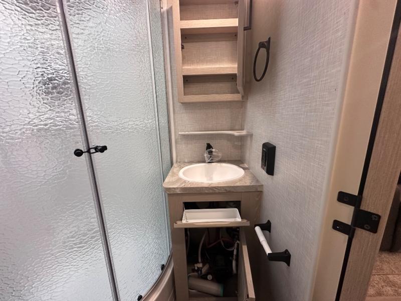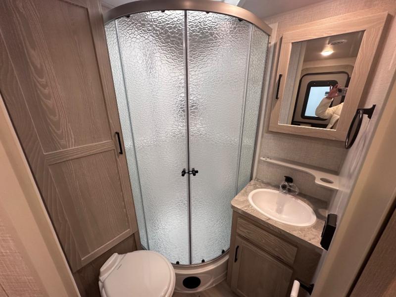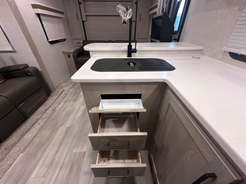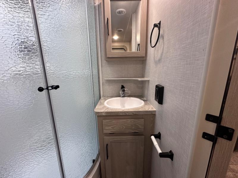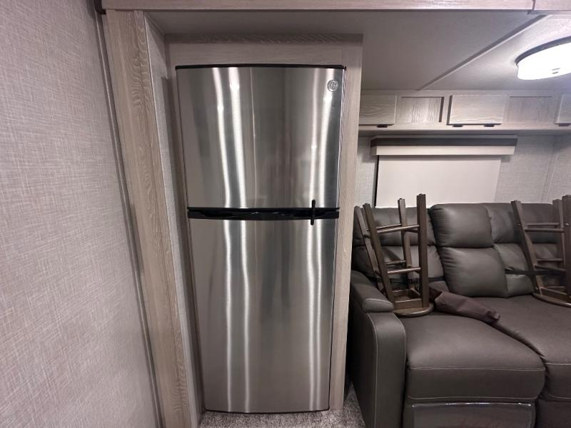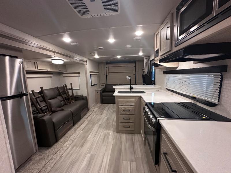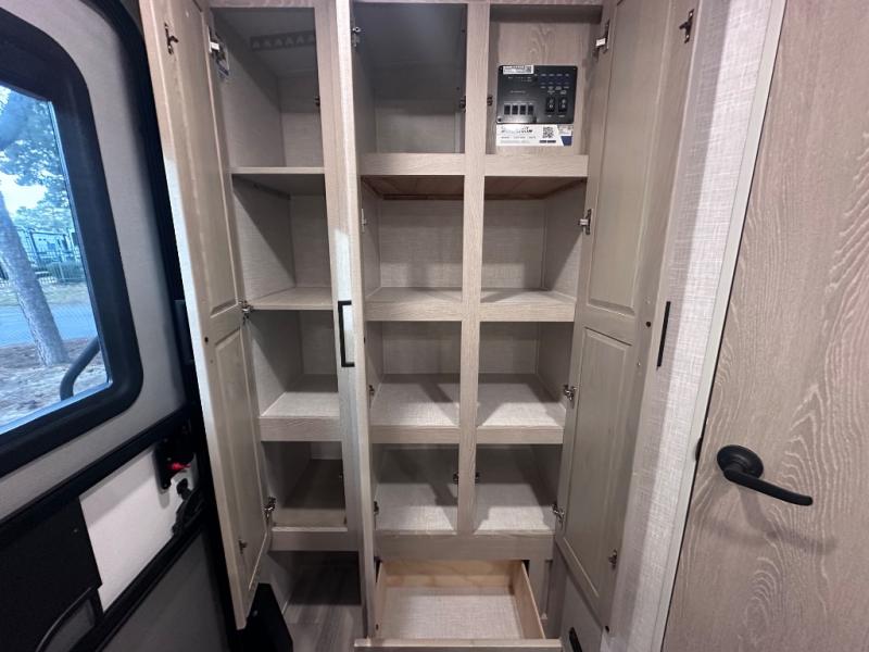 Comfort and versatility come standard in this travel trailer for two! You will love the front Murphy bed with dual wardrobes on either side of the bed for your things, and in the morning you can fold the bed away to relax on the sofa. There is a bar with stools that can serve as your breakfast bar, or you may just want to enjoy your coffee on the theater seating with a table. There is a place for all your belongings since this model includes tons of interior storage, plus a pass-through storage and a drop-frame storage outside for fishing poles, lawn chairs, or firewood. And did we mention this model includes dual entry doors?! How convenient!