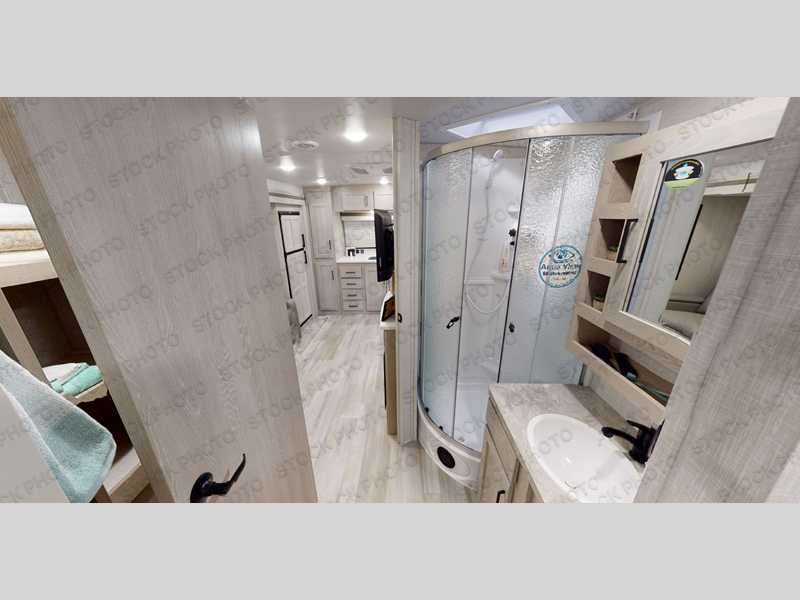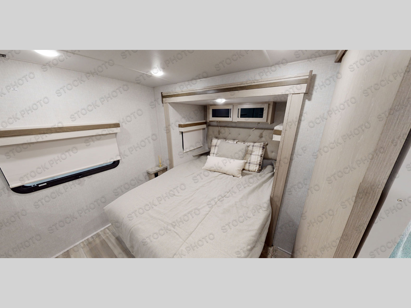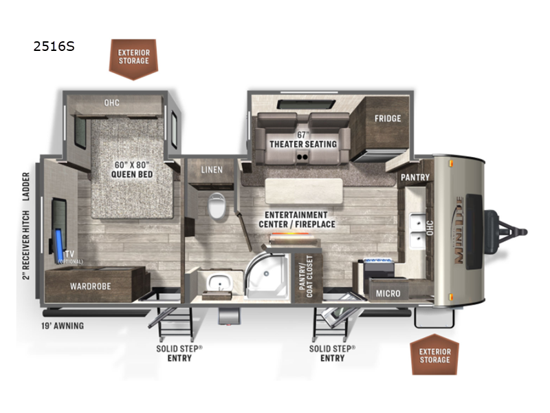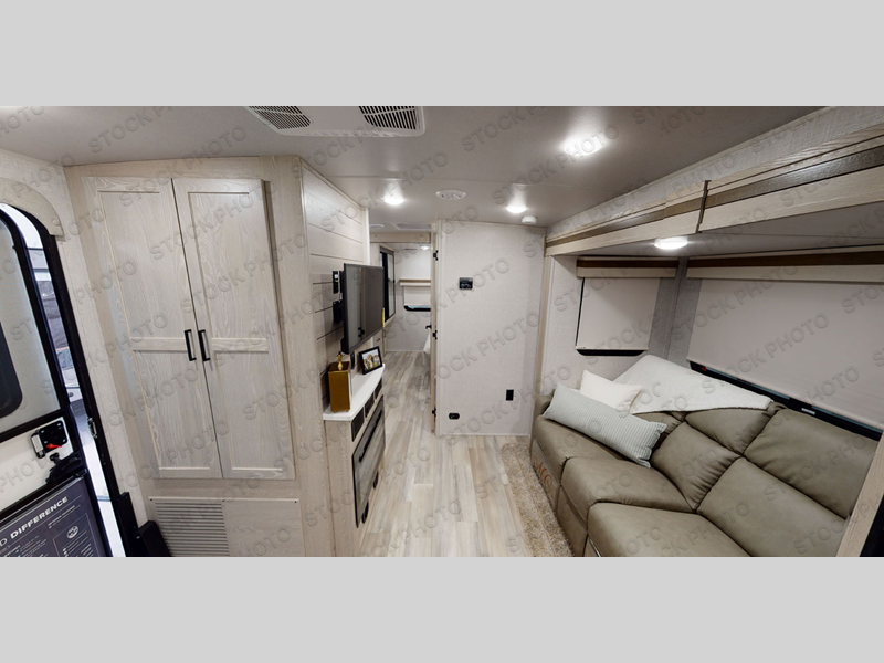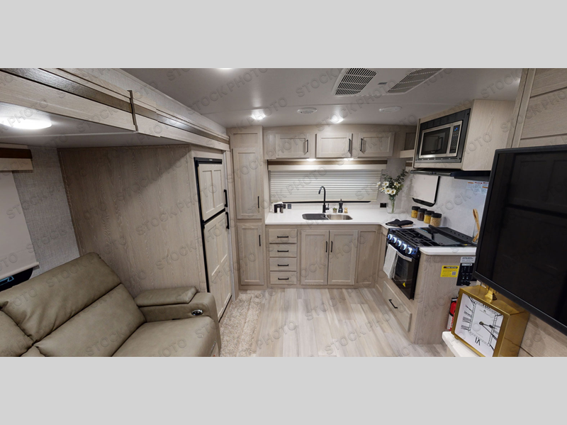 Escape the city life for weekend trips in this cozy couple's trailer. The dual entry doors will allow you to enter in through the rear private bedroom, or the front kitchen/main living area for convenience. You will enjoy relaxing on the theater seating across from the LED TV and fireplace in the evenings, or you can visit outdoors under the 19' power awning. You'll also find an exterior griddle here for quick meals and exterior storage for the fishing poles or hiking gear. This model also includes a walk-through bath with a shower skylight, a linen closet, plus a Showermiser Water Saving System. And don't worry about storage space inside since this model includes an entryway pantry/closet, a second pantry in the front kitchen, plus a large bedroom wardrobe to keep your clothes wrinkle-free!