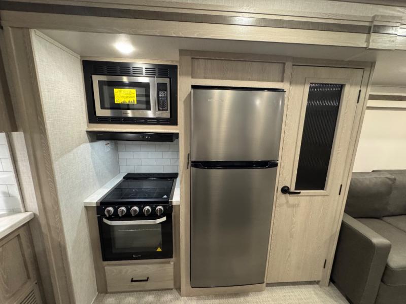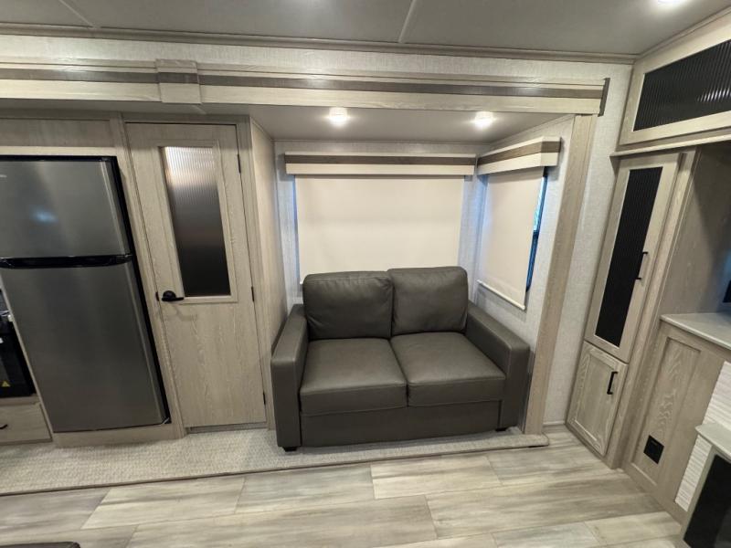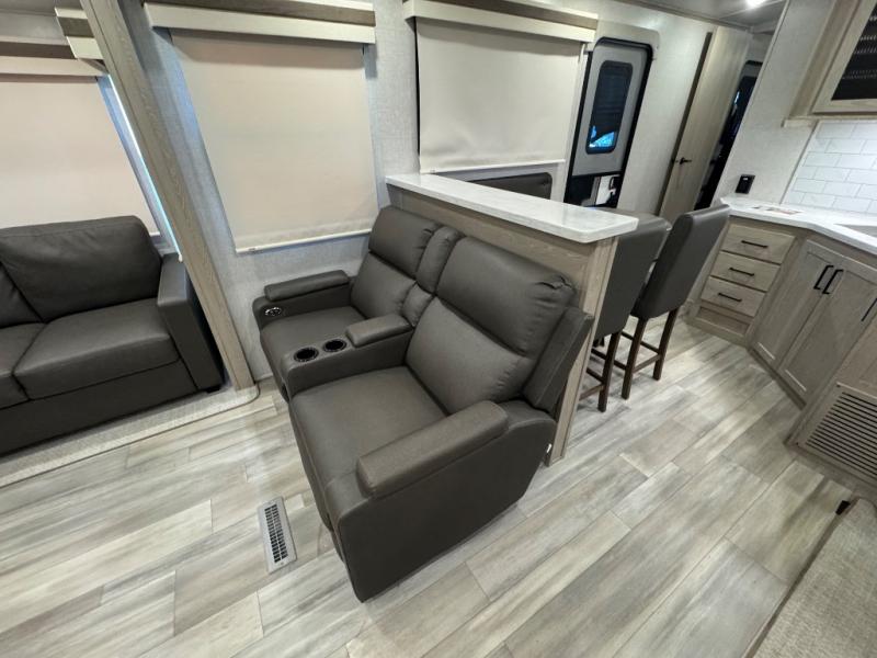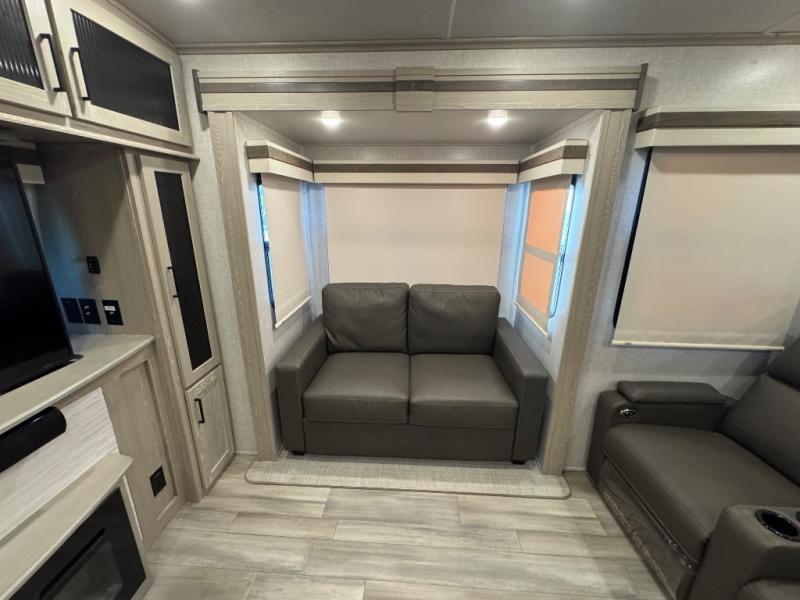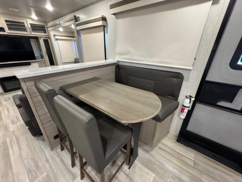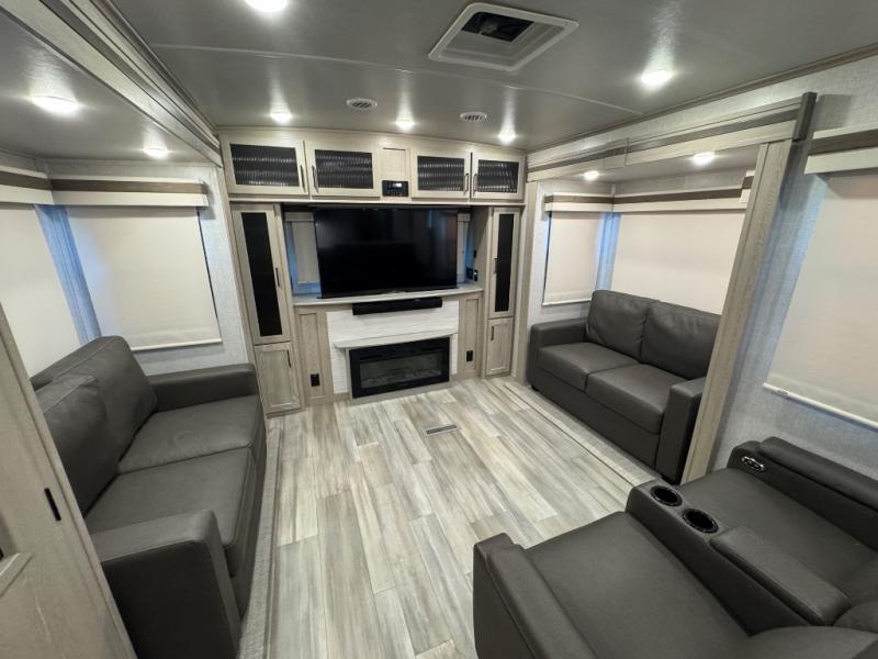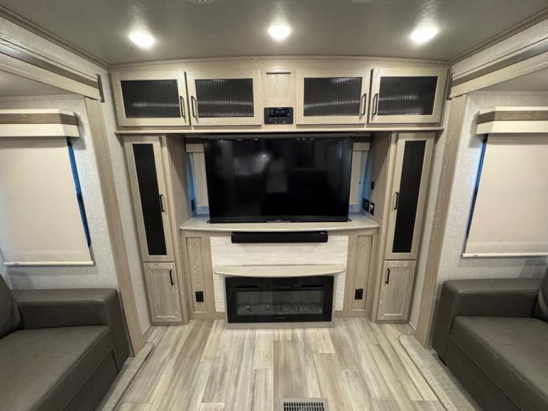 Take home with you in this spacious travel trailer. The rear entry doors opens up to the master bedroom that includes a king bed slide out, a large wardrobe, plus washer and dryer prep for hassle-free full-time living. The dual entry bath will be a big plus with this model, and you can add the optional bedroom TV if you enjoy movies in bed. Once the chef of your group has prepared breakfast on the three burner range, you can enjoy it at the table with two chairs that include bench seating on the other side. The front living area will be a favorite hangout spot with its front entertainment center and fireplace, two hide-a-bed sofas, plus a 60" theater seat for all around comfort. And don't overlook the dual opposing slides here for maximum space!
