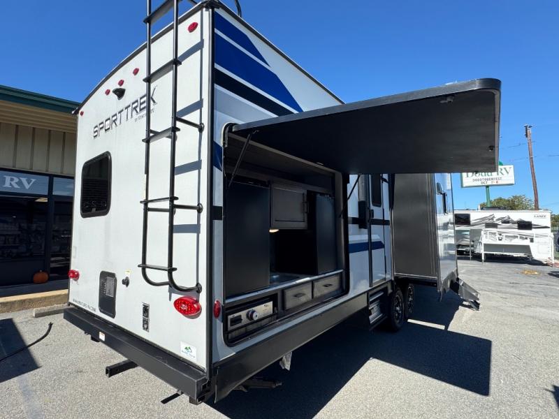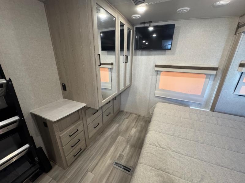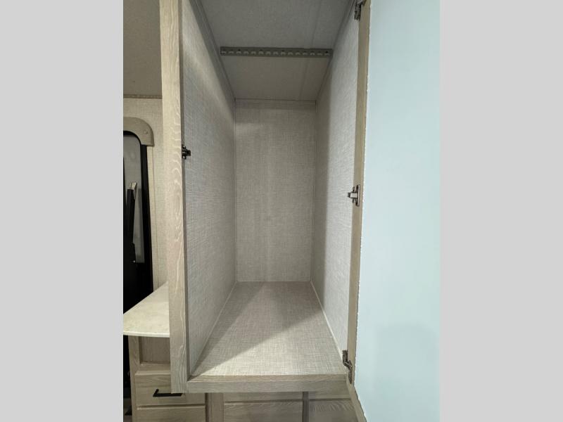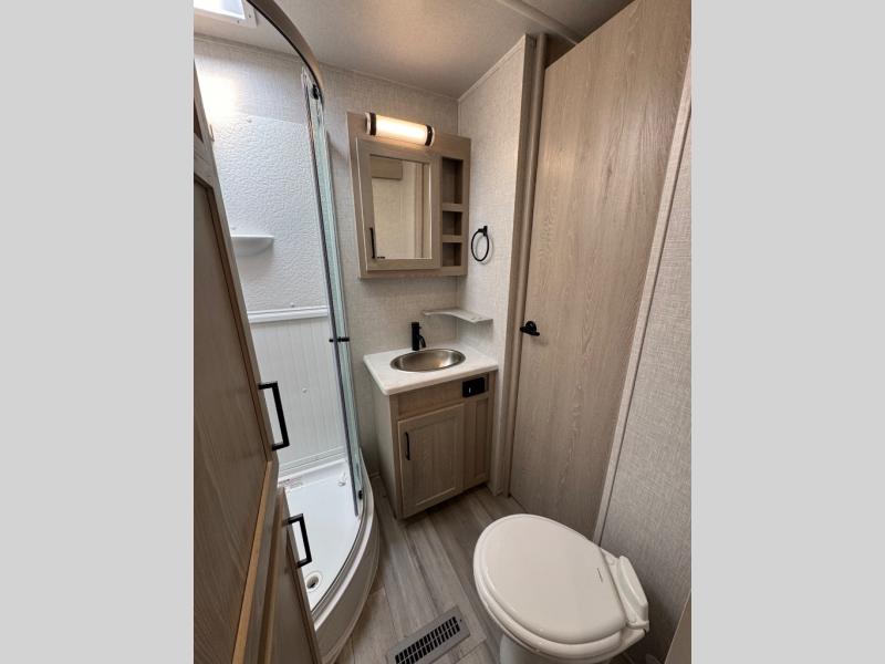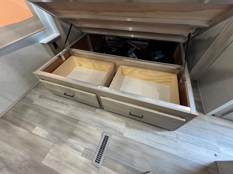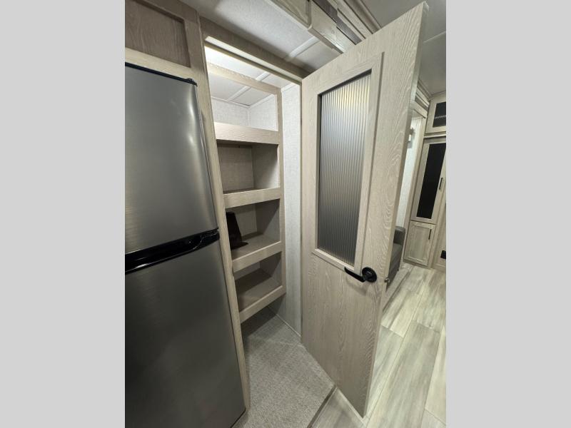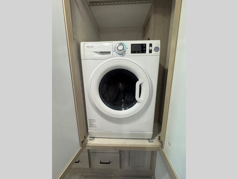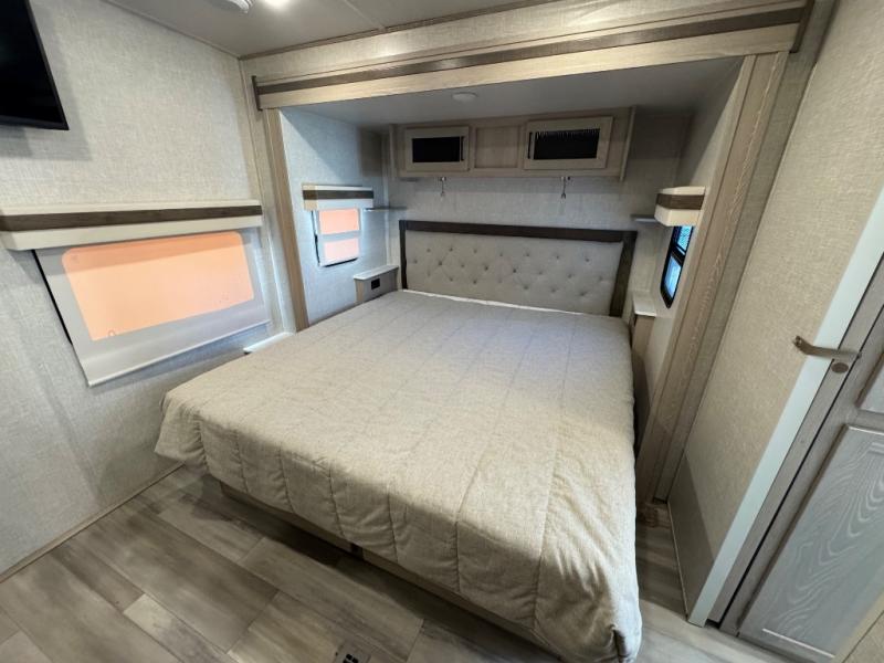 Take home with you in this spacious travel trailer. The rear entry doors opens up to the master bedroom that includes a king bed slide out, a large wardrobe, plus washer and dryer prep for hassle-free full-time living. The dual entry bath will be a big plus with this model, and you can add the optional bedroom TV if you enjoy movies in bed. Once the chef of your group has prepared breakfast on the three burner range, you can enjoy it at the table with two chairs that include bench seating on the other side. The front living area will be a favorite hangout spot with its front entertainment center and fireplace, two hide-a-bed sofas, plus a 60" theater seat for all around comfort. And don't overlook the dual opposing slides here for maximum space!