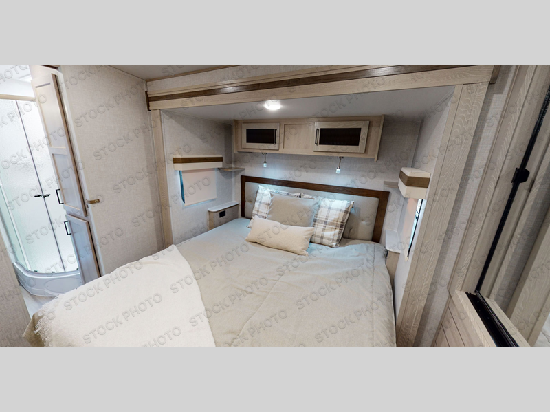 One step inside this rear kitchen travel trailer and you'll be sold! The dual opposing slides create an open floorplan you are sure to love, and you'll find plenty of seating spaces on the theater seat, the hide-a-bed sofa, and at the booth dinette. There is an entertainment center here with an LED TV, plus a fireplace for those cooler nights. This model includes a convenient dual entry bath and a spacious front master bedroom that will have you feeling right at home. You can easily store your items in the large front wardrobe, plus there is a dresser and additional storage that features a space to add an optional washer and dryer. And check out the exterior with two power awnings, an outside kitchen, plus exterior storage for all your gear!